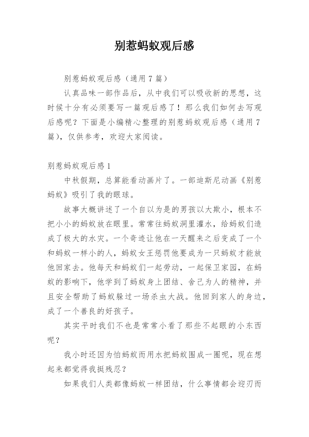 别惹蚂蚁观后感别惹蚂蚁观后感(通用7篇)认真品味一部作品后,从中我们可以吸收新的思想,这时候十分有必须要写一篇观后感了!那么我们如何去写观后感呢?下面是小编精心整理的别惹蚂蚁观后感(通用7篇),仅供参考,欢迎大家阅读。别惹蚂蚁观后感1中秋假期,总算能看动画片了。一部迪斯尼动画《别惹蚂蚁》吸引了我的眼球。故事大概讲述了一个自以为是的男孩以大欺小,根本不把小小的蚂蚁放在眼里。常常往蚂蚁洞里灌水,给蚂蚁们造成了极大的水灾。一个奇迹让他在一天醒来之后变成了一个和蚂蚁一样小的人,蚂蚁女王惩罚他要成为一只蚂蚁才能放他