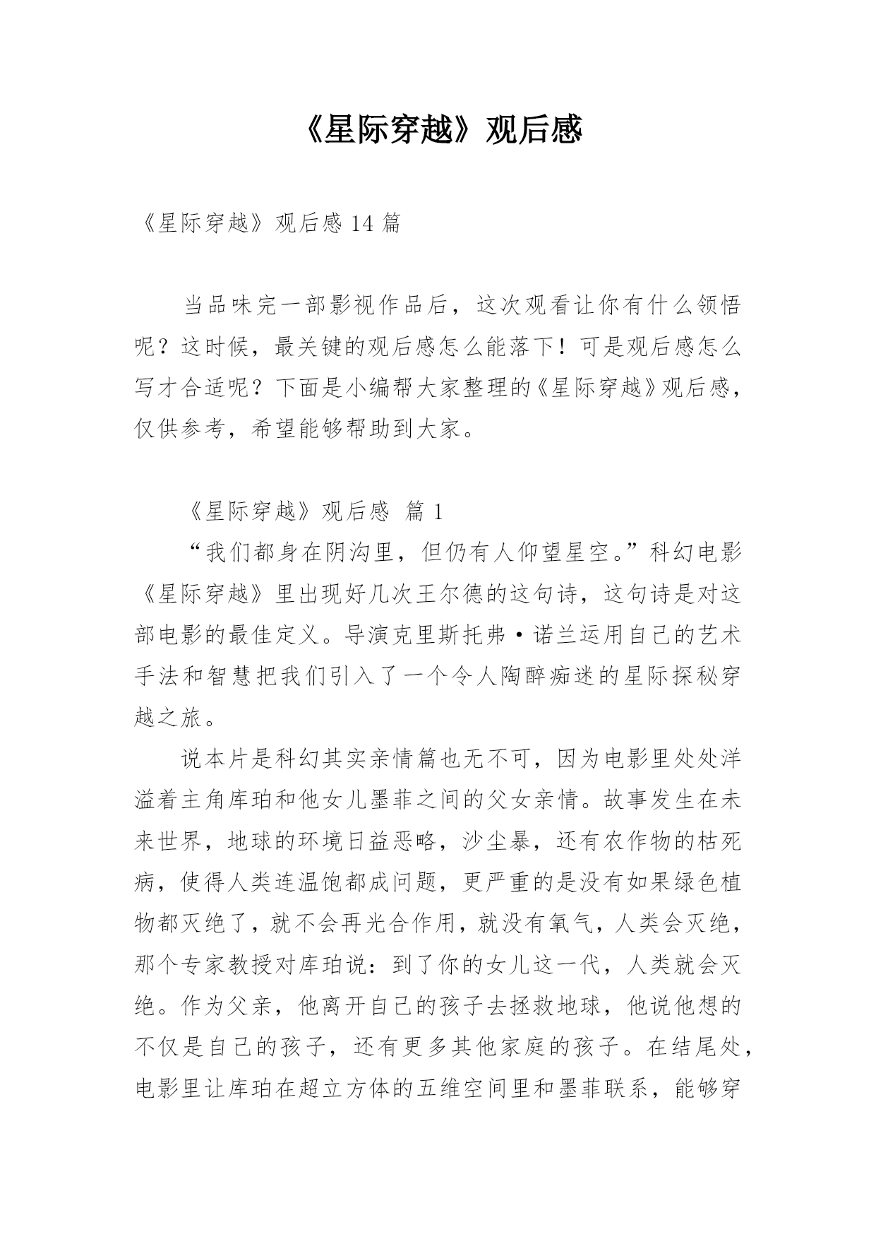 《星际穿越》观后感《星际穿越》观后感14篇当品味完一部影视作品后,这次观看让你有什么领悟呢?这时候,最关键的观后感怎么能落下!可是观后感怎么写才合适呢?下面是小编帮大家整理的《星际穿越》观后感,仅供参考,希望能够帮助到大家。《星际穿越》观后感篇1“我们都身在阴沟里,但仍有人仰望星空。”科幻电影《星际穿越》里出现好几次王尔德的这句诗,这句诗是对这部电影的最佳定义。导演克里斯托弗·诺兰运用自己的艺术手法和智慧把我们引入了一个令人陶醉痴迷的星际探秘穿越之旅。说本片是科幻其实亲情篇也无不可,因为电影里处处洋溢着主