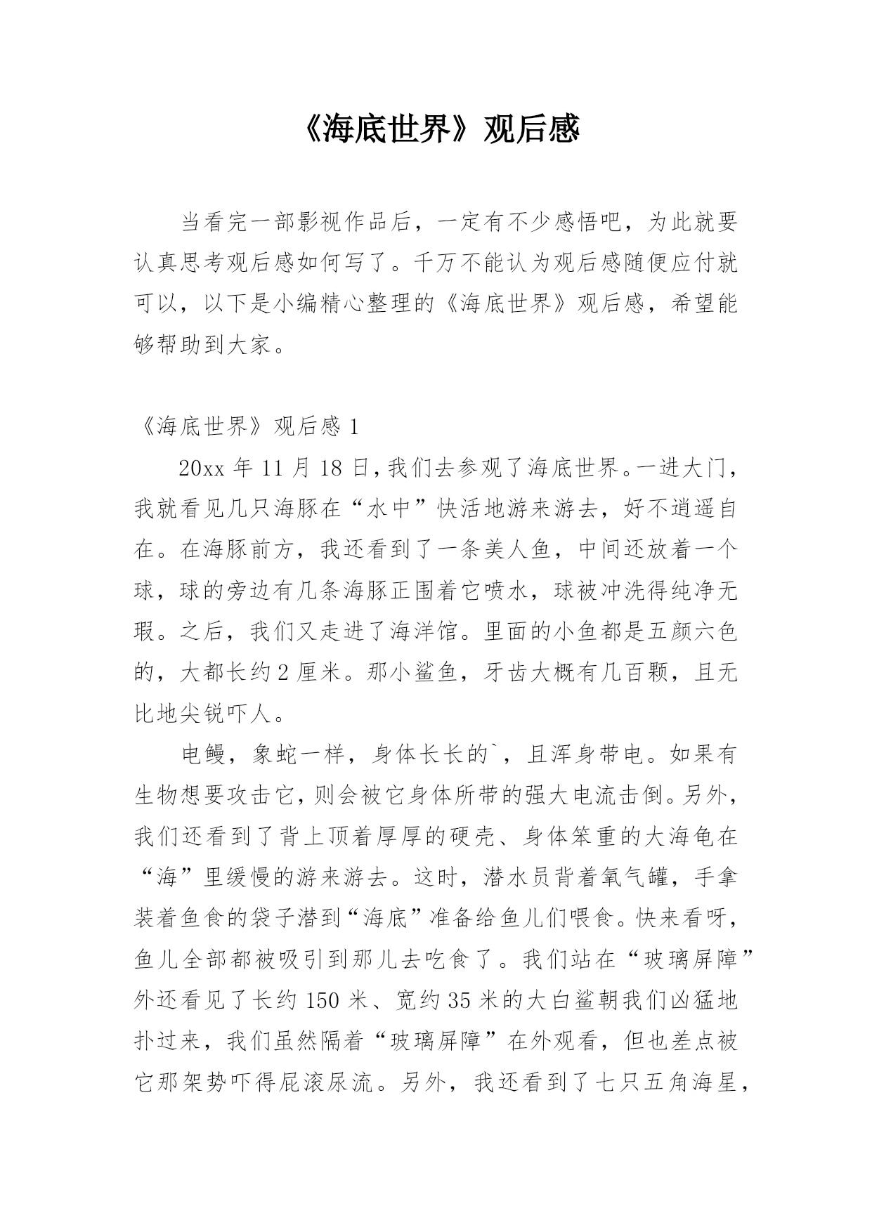 《海底世界》观后感当看完一部影视作品后,一定有不少感悟吧,为此就要认真思考观后感如何写了。千万不能认为观后感随便应付就可以,以下是小编精心整理的《海底世界》观后感,希望能够帮助到大家。《海底世界》观后感120xx年11月18日,我们去参观了海底世界。一进大门,我就看见几只海豚在“水中”快活地游来游去,好不逍遥自在。在海豚前方,我还看到了一条美人鱼,中间还放着一个球,球的旁边有几条海豚正围着它喷水,球被冲洗得纯净无瑕。之后,我们又走进了海洋馆。里面的小鱼都是五颜六色的,大都长约2厘米。那小鲨鱼,牙齿大概有几