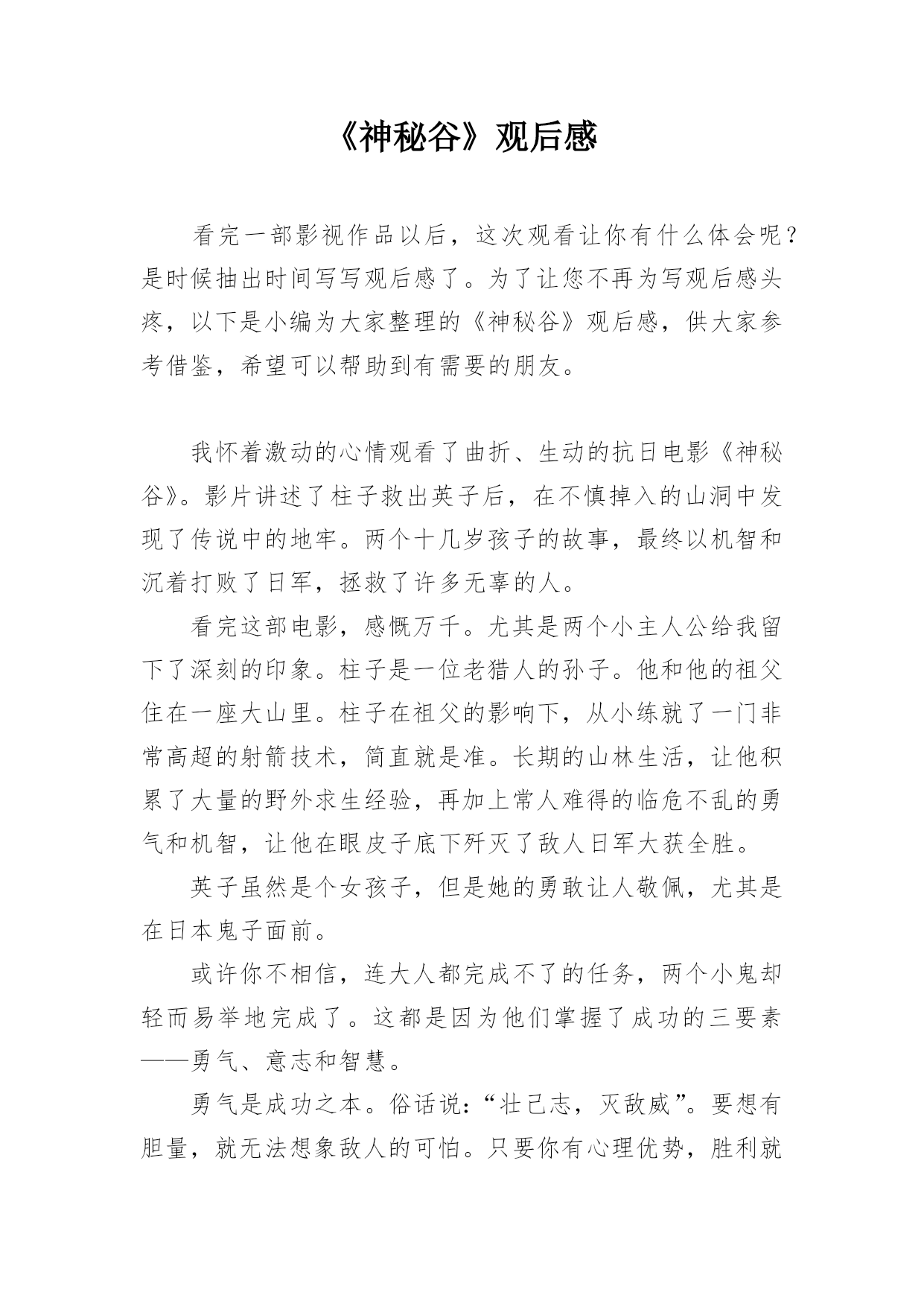 《神秘谷》观后感看完一部影视作品以后,这次观看让你有什么体会呢?是时候抽出时间写写观后感了。为了让您不再为写观后感头疼,以下是小编为大家整理的《神秘谷》观后感,供大家参考借鉴,希望可以帮助到有需要的朋友。我怀着激动的心情观看了曲折、生动的抗日电影《神秘谷》。影片讲述了柱子救出英子后,在不慎掉入的山洞中发现了传说中的地牢。两个十几岁孩子的故事,最终以机智和沉着打败了日军,拯救了许多无辜的人。看完这部电影,感慨万千。尤其是两个小主人公给我留下了深刻的印象。柱子是一位老猎人的孙子。他和他的祖父住在一座大山里。柱