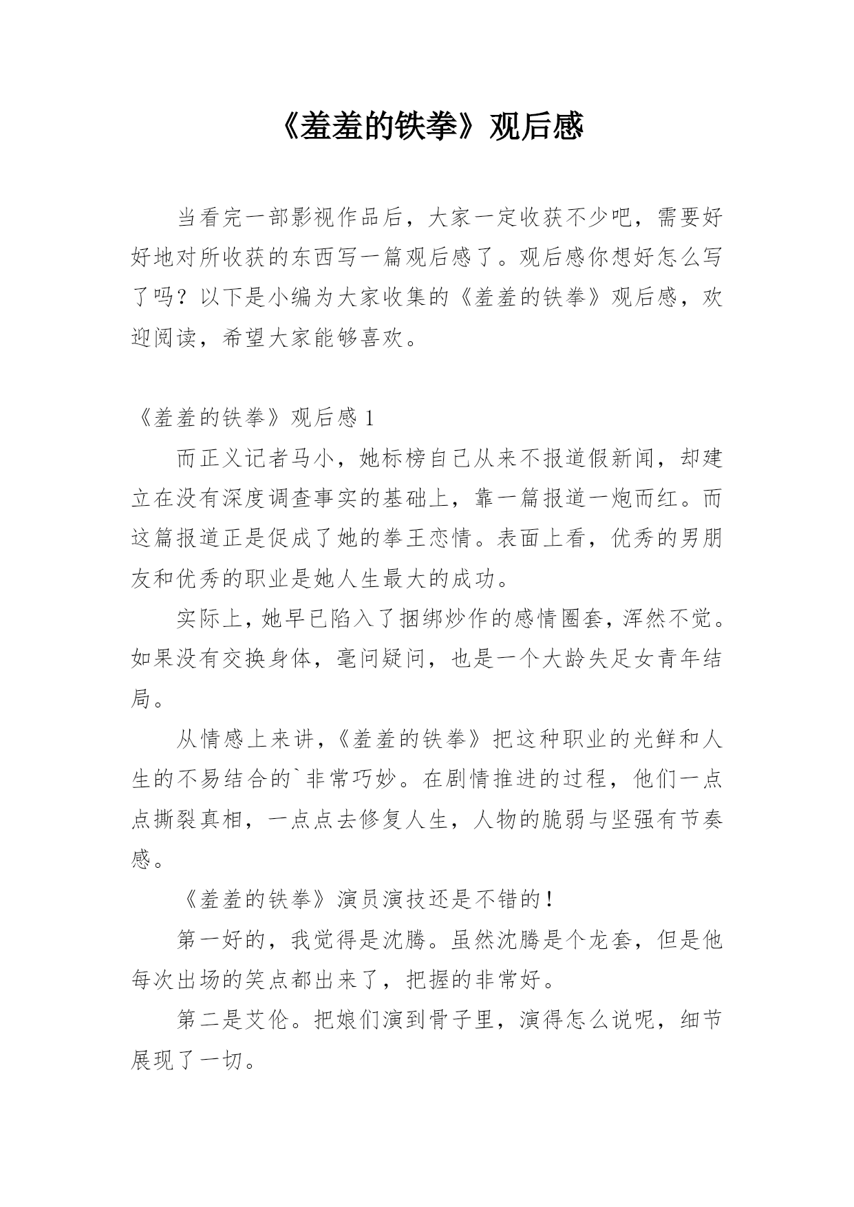 《羞羞的铁拳》观后感当看完一部影视作品后,大家一定收获不少吧,需要好好地对所收获的东西写一篇观后感了。观后感你想好怎么写了吗?以下是小编为大家收集的《羞羞的铁拳》观后感,欢迎阅读,希望大家能够喜欢。《羞羞的铁拳》观后感1而正义记者马小,她标榜自己从来不报道假新闻,却建立在没有深度调查事实的基础上,靠一篇报道一炮而红。而这篇报道正是促成了她的拳王恋情。表面上看,优秀的男朋友和优秀的职业是她人生最大的成功。实际上,她早已陷入了捆绑炒作的感情圈套,浑然不觉。如果没有交换身体,毫问疑问,也是一个大龄失足女青年结局