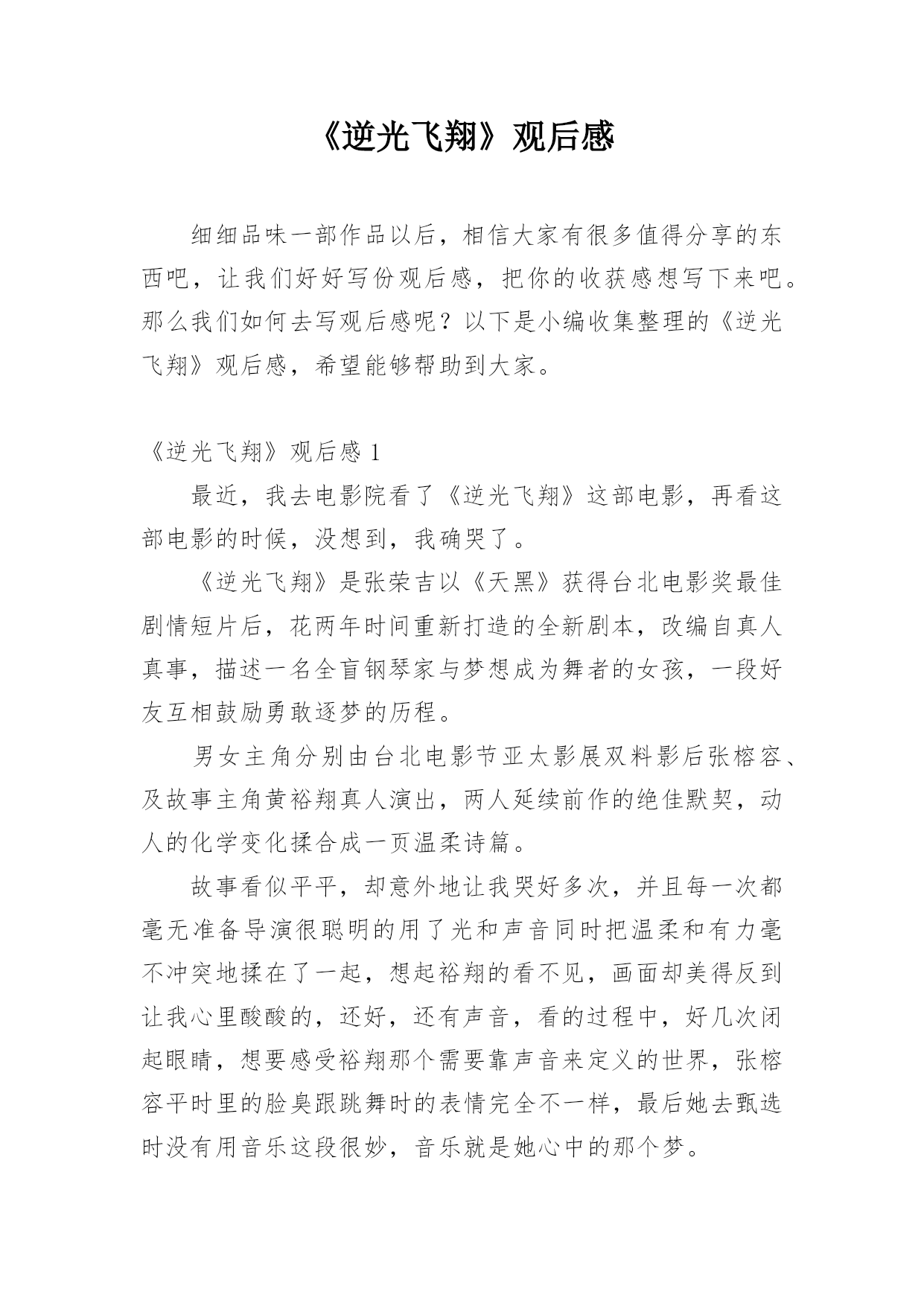 《逆光飞翔》观后感细细品味一部作品以后,相信大家有很多值得分享的东西吧,让我们好好写份观后感,把你的收获感想写下来吧。那么我们如何去写观后感呢?以下是小编收集整理的《逆光飞翔》观后感,希望能够帮助到大家。《逆光飞翔》观后感1最近,我去电影院看了《逆光飞翔》这部电影,再看这部电影的时候,没想到,我确哭了。《逆光飞翔》是张荣吉以《天黑》获得台北电影奖最佳剧情短片后,花两年时间重新打造的全新剧本,改编自真人真事,描述一名全盲钢琴家与梦想成为舞者的女孩,一段好友互相鼓励勇敢逐梦的历程。男女主角分别由台北电影节亚太