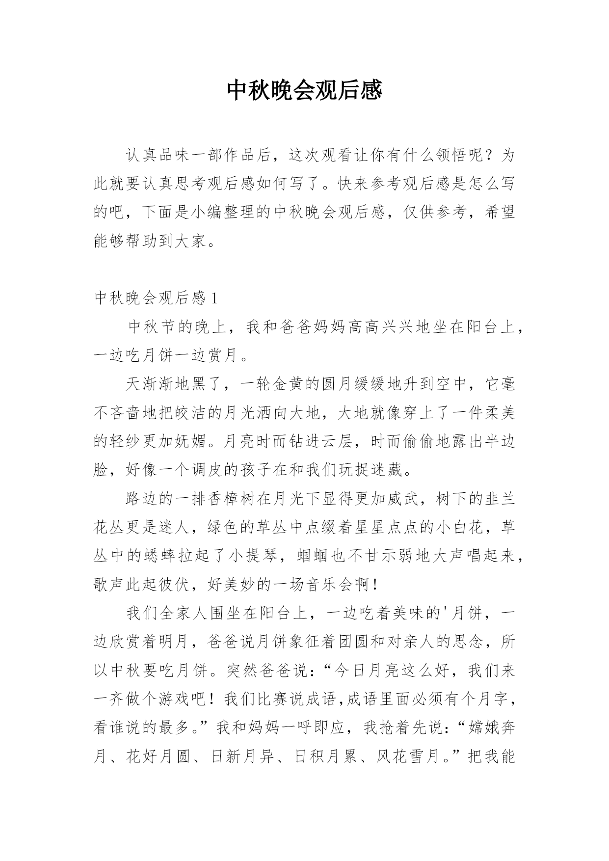 中秋晚会观后感认真品味一部作品后,这次观看让你有什么领悟呢?为此就要认真思考观后感如何写了。快来参考观后感是怎么写的吧,下面是小编整理的中秋晚会观后感,仅供参考,希望能够帮助到大家。中秋晚会观后感1中秋节的晚上,我和爸爸妈妈高高兴兴地坐在阳台上,一边吃月饼一边赏月。天渐渐地黑了,一轮金黄的圆月缓缓地升到空中,它毫不吝啬地把皎洁的月光洒向大地,大地就像穿上了一件柔美的轻纱更加妩媚。月亮时而钻进云层,时而偷偷地露出半边脸,好像一个调皮的孩子在和我们玩捉迷藏。路边的一排香樟树在月光下显得更加威武,树下的韭兰花丛