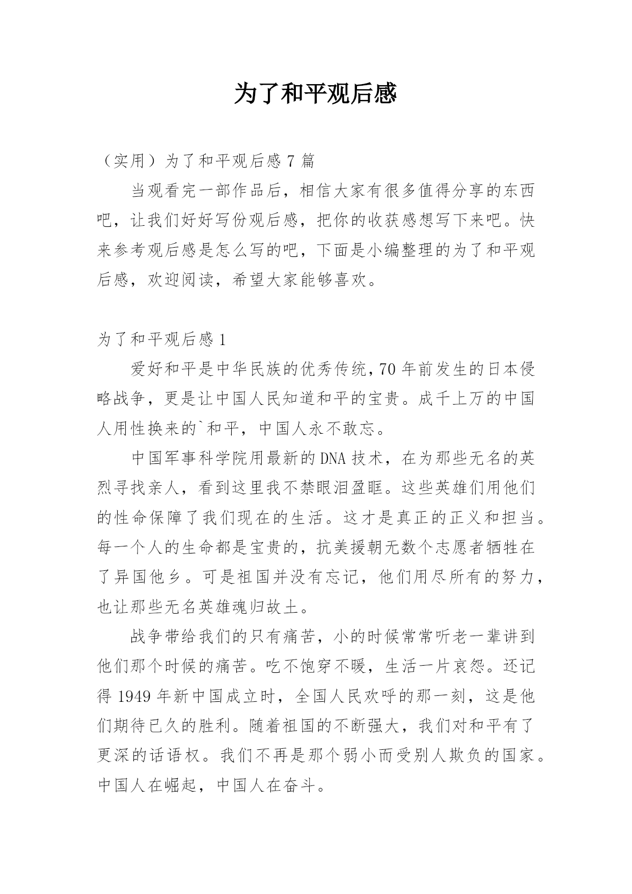 为了和平观后感(实用)为了和平观后感7篇当观看完一部作品后,相信大家有很多值得分享的东西吧,让我们好好写份观后感,把你的收获感想写下来吧。快来参考观后感是怎么写的吧,下面是小编整理的为了和平观后感,欢迎阅读,希望大家能够喜欢。为了和平观后感1爱好和平是中华民族的优秀传统,70年前发生的日本侵略战争,更是让中国人民知道和平的宝贵。成千上万的中国人用性换来的`和平,中国人永不敢忘。中国军事科学院用最新的DNA技术,在为那些无名的英烈寻找亲人,看到这里我不禁眼泪盈眶。这些英雄们用他们的性命保障了我们现在的生活。