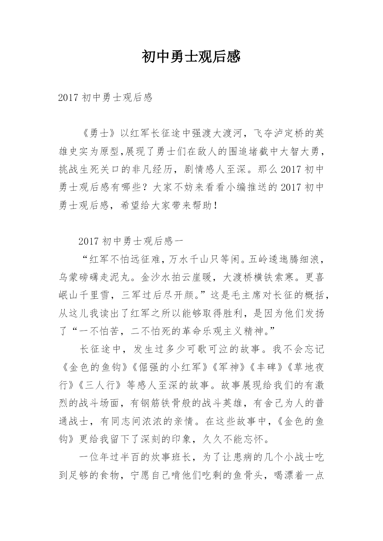 初中勇士观后感2017初中勇士观后感《勇士》以红军长征途中强渡大渡河,飞夺泸定桥的英雄史实为原型,展现了勇士们在敌人的围追堵截中大智大勇,挑战生死关口的非凡经历,剧情感人至深。那么2017初中勇士观后感有哪些?大家不妨来看看小编推送的2017初中勇士观后感,希望给大家带来帮助!2017初中勇士观后感一“红军不怕远征难,万水千山只等闲。五岭逶迤腾细浪,乌蒙磅礴走泥丸。金沙水拍云崖暖,大渡桥横铁索寒。更喜岷山千里雪,三军过后尽开颜。”这是毛主席对长征的概括,从这儿我读出了红军之所以能够取得胜利,是因为他们发扬