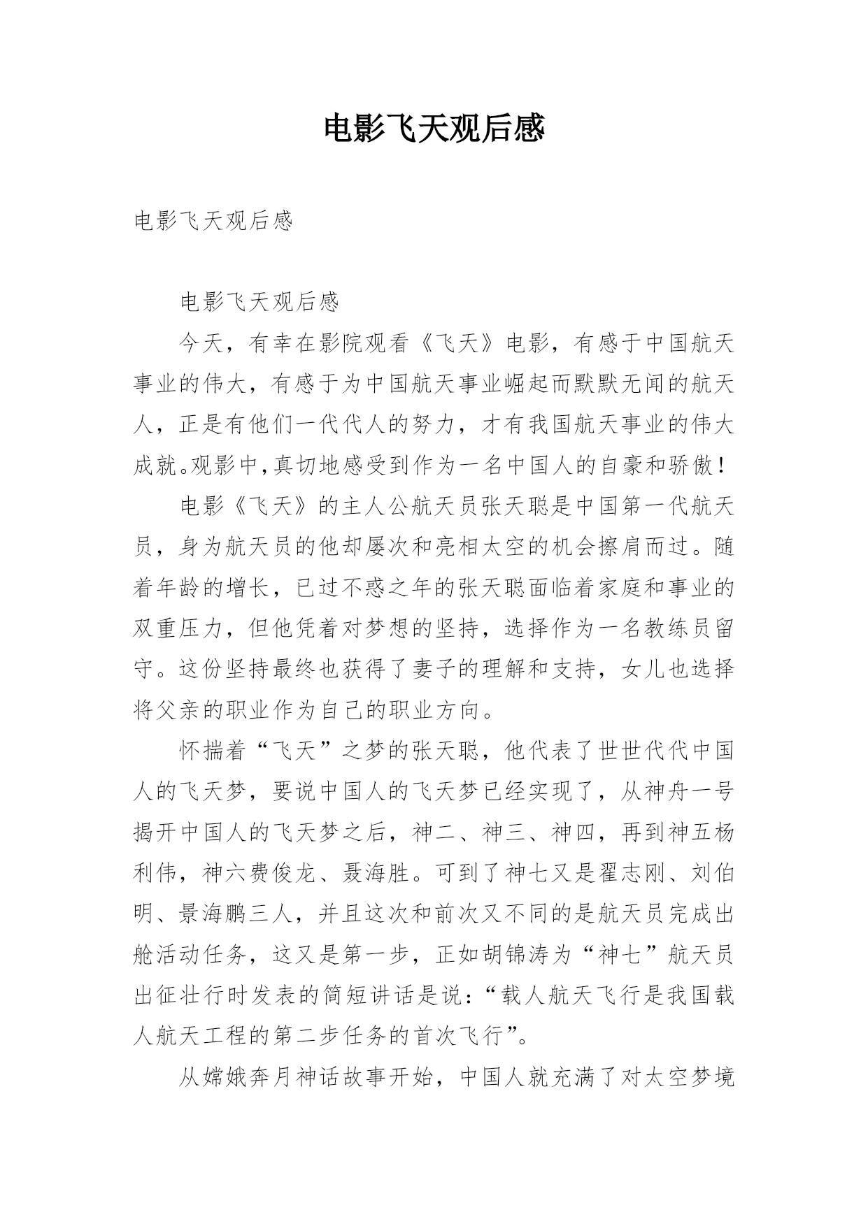 电影飞天观后感电影飞天观后感电影飞天观后感今天,有幸在影院观看《飞天》电影,有感于中国航天事业的伟大,有感于为中国航天事业崛起而默默无闻的航天人,正是有他们一代代人的努力,才有我国航天事业的伟大成就。观影中,真切地感受到作为一名中国人的自豪和骄傲!电影《飞天》的主人公航天员张天聪是中国第一代航天员,身为航天员的他却屡次和亮相太空的机会擦肩而过。随着年龄的增长,已过不惑之年的张天聪面临着家庭和事业的双重压力,但他凭着对梦想的坚持,选择作为一名教练员留守。这份坚持最终也获得了妻子的理解和支持,女儿也选择将父亲