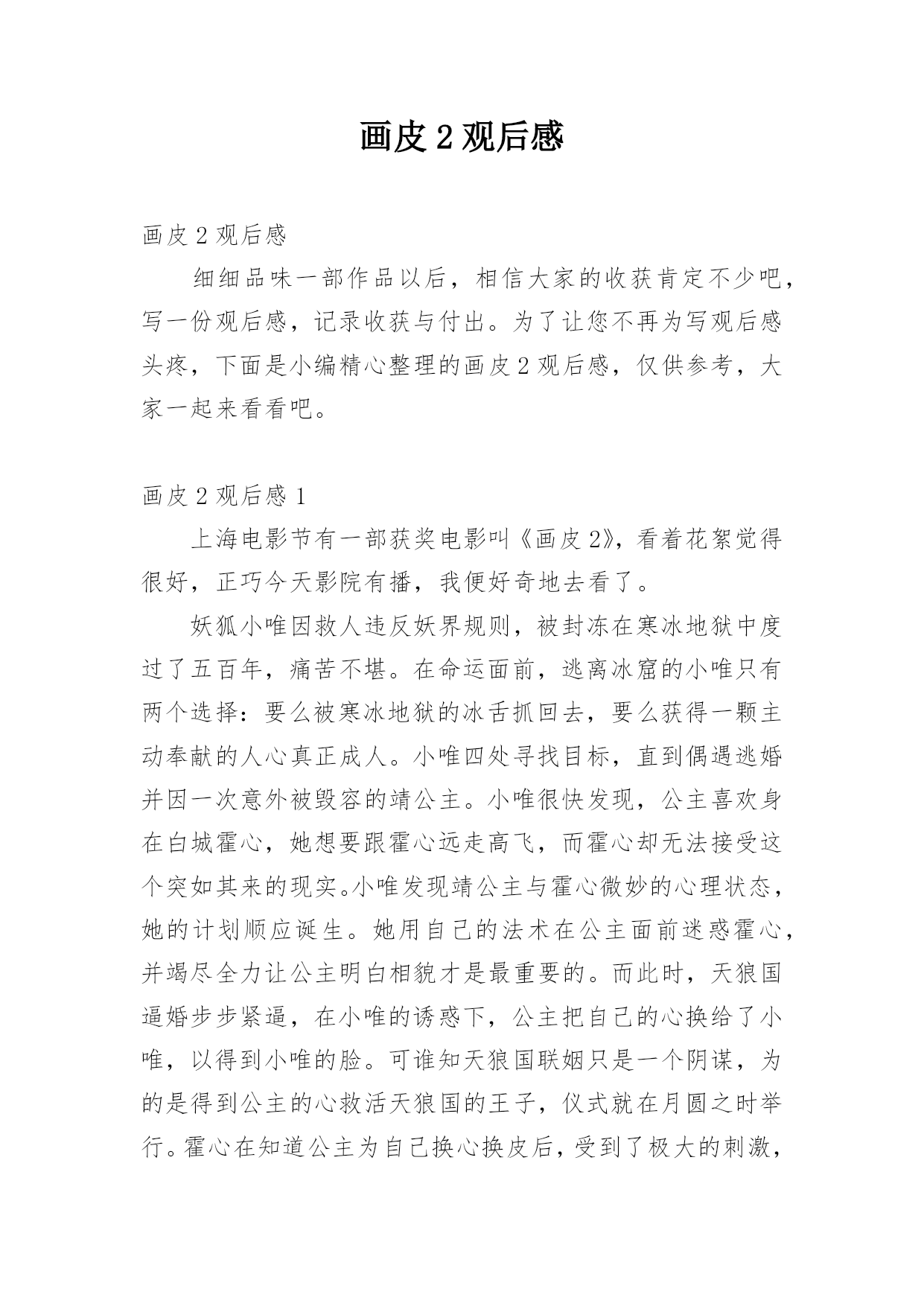 画皮2观后感画皮2观后感细细品味一部作品以后,相信大家的收获肯定不少吧,写一份观后感,记录收获与付出。为了让您不再为写观后感头疼,下面是小编精心整理的画皮2观后感,仅供参考,大家一起来看看吧。画皮2观后感1上海电影节有一部获奖电影叫《画皮2》,看着花絮觉得很好,正巧今天影院有播,我便好奇地去看了。妖狐小唯因救人违反妖界规则,被封冻在寒冰地狱中度过了五百年,痛苦不堪。在命运面前,逃离冰窟的小唯只有两个选择:要么被寒冰地狱的冰舌抓回去,要么获得一颗主动奉献的人心真正成人。小唯四处寻找目标,直到偶遇逃婚并因一次