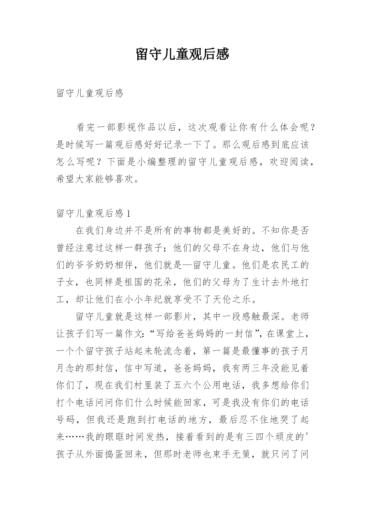 留守儿童观后感留守儿童观后感看完一部影视作品以后,这次观看让你有什么体会呢?是时候写一篇观后感好好记录一下了。那么观后感到底应该怎么写呢?下面是小编整理的留守儿童观后感,欢迎阅读,希望大家能够喜欢。留守儿童观后感1在我们身边并不是所有的事物都是美好的。不知你是否曾经注意过这样一群孩子;他们的父母不在身边,他们与他们的爷爷奶奶相伴,他们就是—留守儿童。他们是农民工的子女,也同样是祖国的花朵,他们的父母为了生计去外地打工,却让他们在小小年纪就享受不了天伦之乐。留守儿童就是这样一部影片,其中一段感触最深。老师让