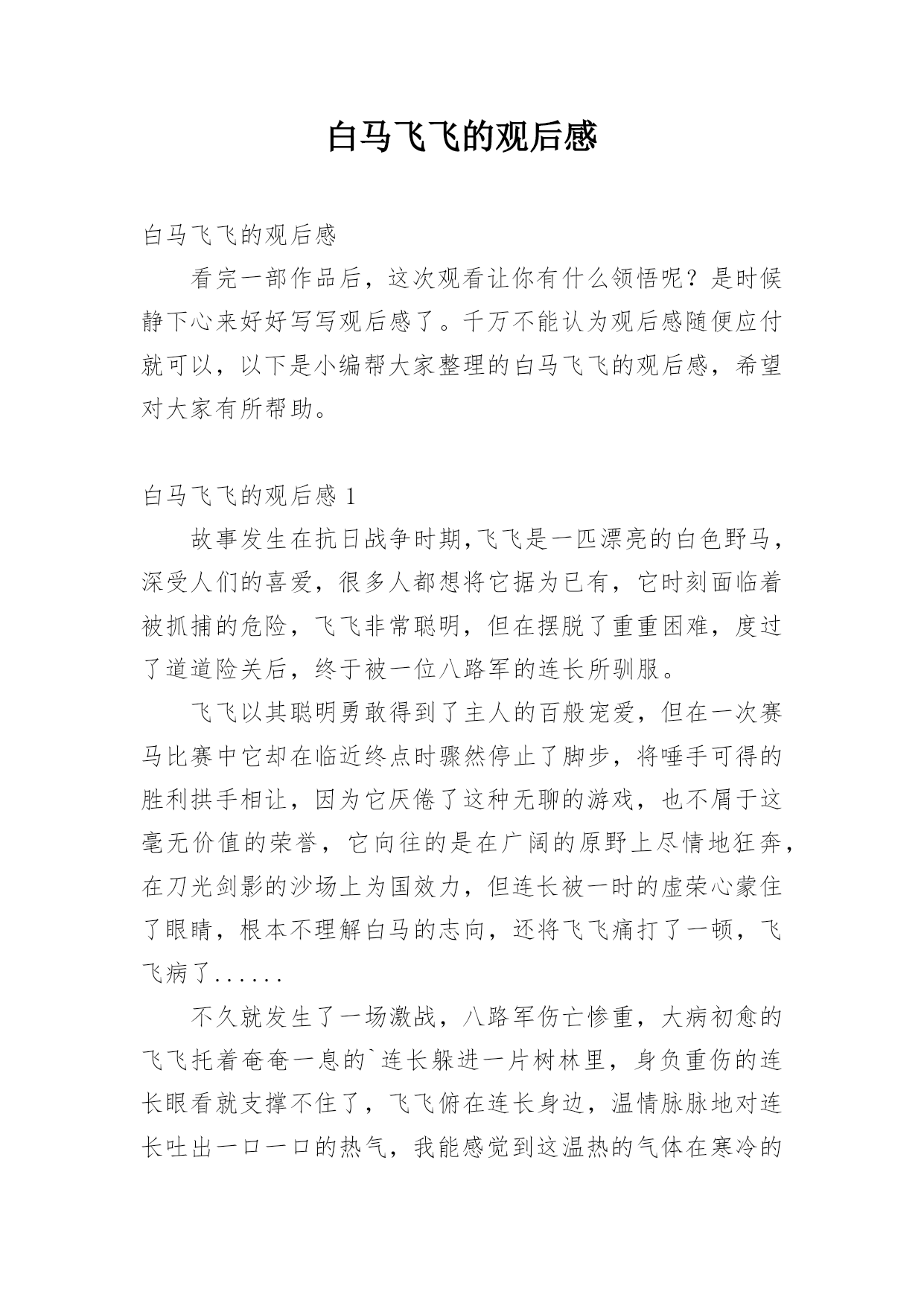 白马飞飞的观后感白马飞飞的观后感看完一部作品后,这次观看让你有什么领悟呢?是时候静下心来好好写写观后感了。千万不能认为观后感随便应付就可以,以下是小编帮大家整理的白马飞飞的观后感,希望对大家有所帮助。白马飞飞的观后感1故事发生在抗日战争时期,飞飞是一匹漂亮的白色野马,深受人们的喜爱,很多人都想将它据为已有,它时刻面临着被抓捕的危险,飞飞非常聪明,但在摆脱了重重困难,度过了道道险关后,终于被一位八路军的连长所驯服。飞飞以其聪明勇敢得到了主人的百般宠爱,但在一次赛马比赛中它却在临近终点时骤然停止了脚步,将唾手