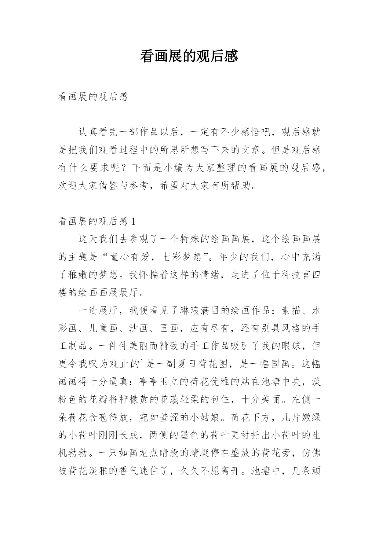 看画展的观后感看画展的观后感认真看完一部作品以后,一定有不少感悟吧,观后感就是把我们观看过程中的所思所想写下来的文章。但是观后感有什么要求呢?下面是小编为大家整理的看画展的观后感,欢迎大家借鉴与参考,希望对大家有所帮助。看画展的观后感1这天我们去参观了一个特殊的绘画画展,这个绘画画展的主题是“童心有爱,七彩梦想”。年少的我们,心中充满了稚嫩的梦想。我怀揣着这样的情绪,走进了位于科技宫四楼的绘画画展展厅。一进展厅,我便看见了琳琅满目的绘画作品:素描、水彩画、儿童画、沙画、国画,应有尽有,还有别具风格的手工制