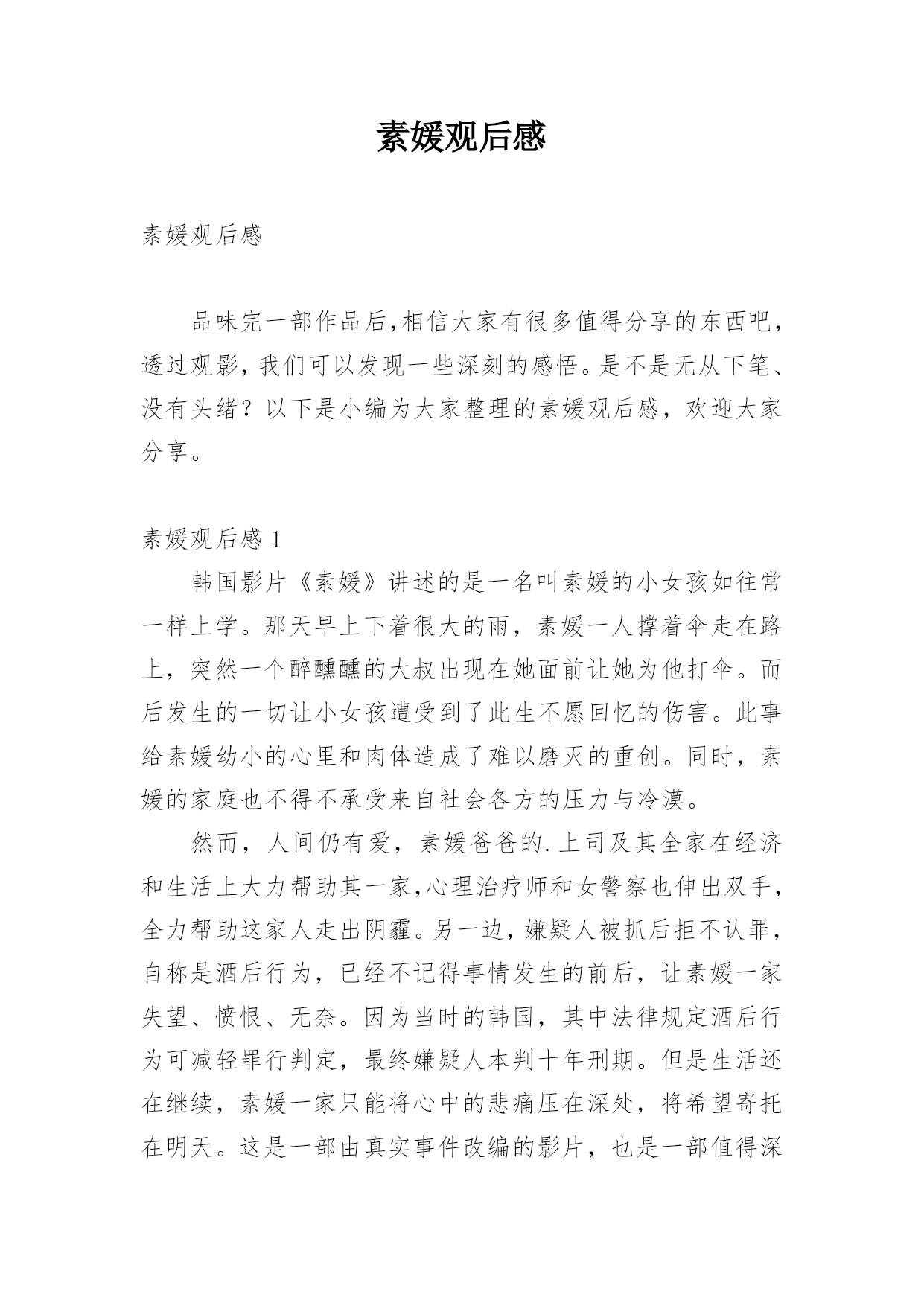 素媛观后感素媛观后感品味完一部作品后,相信大家有很多值得分享的东西吧,透过观影,我们可以发现一些深刻的感悟。是不是无从下笔、没有头绪?以下是小编为大家整理的素媛观后感,欢迎大家分享。素媛观后感1韩国影片《素媛》讲述的是一名叫素媛的小女孩如往常一样上学。那天早上下着很大的雨,素媛一人撑着伞走在路上,突然一个醉醺醺的大叔出现在她面前让她为他打伞。而后发生的一切让小女孩遭受到了此生不愿回忆的伤害。此事给素媛幼小的心里和肉体造成了难以磨灭的重创。同时,素媛的家庭也不得不承受来自社会各方的压力与冷漠。然而,人间仍有