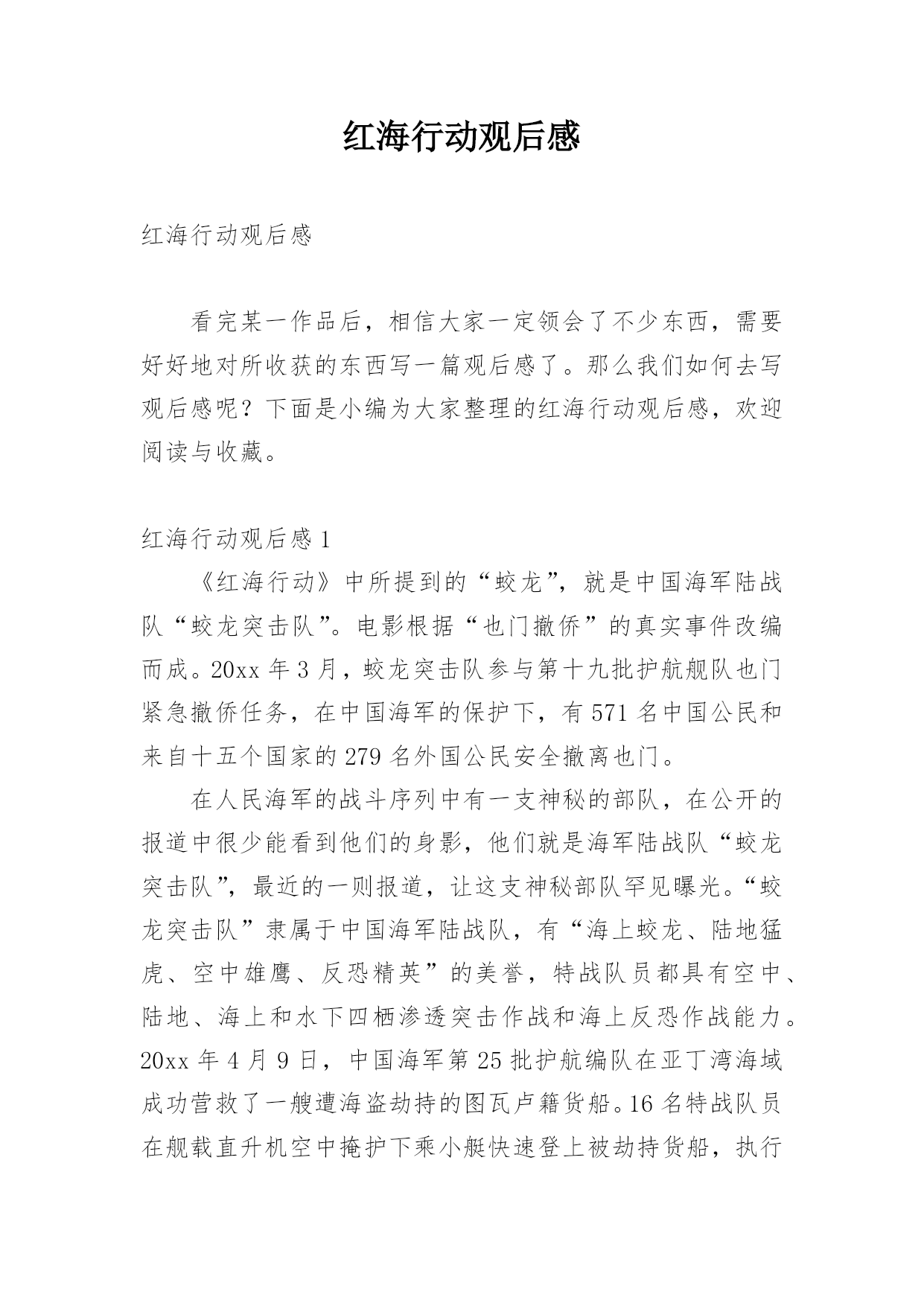 红海行动观后感红海行动观后感看完某一作品后,相信大家一定领会了不少东西,需要好好地对所收获的东西写一篇观后感了。那么我们如何去写观后感呢?下面是小编为大家整理的红海行动观后感,欢迎阅读与收藏。红海行动观后感1《红海行动》中所提到的“蛟龙”,就是中国海军陆战队“蛟龙突击队”。电影根据“也门撤侨”的真实事件改编而成。20xx年3月,蛟龙突击队参与第十九批护航舰队也门紧急撤侨任务,在中国海军的保护下,有571名中国公民和来自十五个国家的279名外国公民安全撤离也门。在人民海军的战斗序列中有一支神秘的部队,在公开