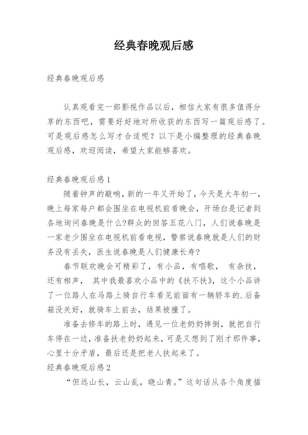 经典春晚观后感经典春晚观后感认真观看完一部影视作品以后,相信大家有很多值得分享的东西吧,需要好好地对所收获的东西写一篇观后感了。可是观后感怎么写才合适呢?以下是小编整理的经典春晚观后感,欢迎阅读,希望大家能够喜欢。经典春晚观后感1随着钟声的敲响,新的一年又开始了,今天是大年初一,晚上每家每户都会围坐在电视机前看晚会,开场白是记者到各地询问春晚是什么?群众的回答五花八门,人们说春晚是一家老少围坐在电视机前看电视,警察说春晚就是人们的财务没有丢失,医生说春晚是人们健康长寿?春节联欢晚会可精彩了,有小品,有唱歌