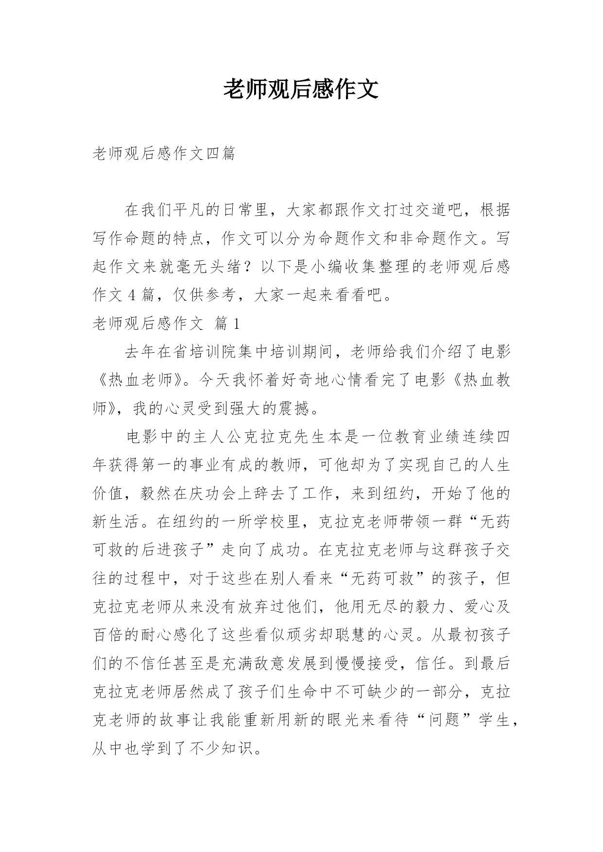 老师观后感作文老师观后感作文四篇在我们平凡的日常里,大家都跟作文打过交道吧,根据写作命题的特点,作文可以分为命题作文和非命题作文。写起作文来就毫无头绪?以下是小编收集整理的老师观后感作文4篇,仅供参考,大家一起来看看吧。老师观后感作文篇1去年在省培训院集中培训期间,老师给我们介绍了电影《热血老师》。今天我怀着好奇地心情看完了电影《热血教师》,我的心灵受到强大的震撼。电影中的主人公克拉克先生本是一位教育业绩连续四年获得第一的事业有成的教师,可他却为了实现自己的人生价值,毅然在庆功会上辞去了工作,来到纽约,开