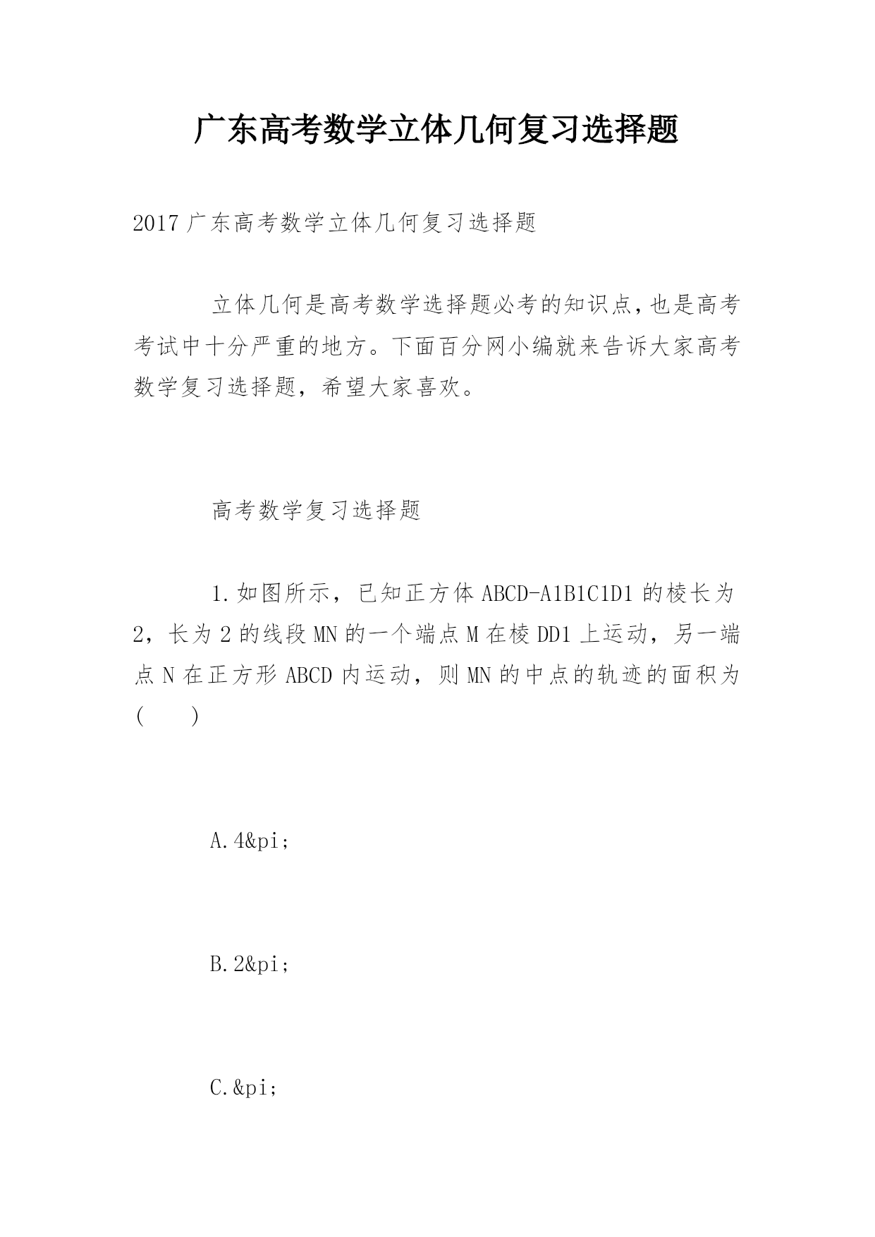 广东高考数学立体几何复习选择题2017广东高考数学立体几何复习选择题立体几何是高考数学选择题必考的知识点,也是高考考试中十分严重的地方。下面百分网小编就来告诉大家高考数学复习选择题,希望大家喜欢。高考数学复习选择题1.如图所示,已知正方体ABCD-A1B1C1D1的棱长为2,长为2的线段MN的一个端点M在棱DD1上运动,另一端点N在正方形ABCD内运动,则MN的中点的轨迹的面积为()A.4πB.2πC.πD.-π答案:D解题思路:本题考查了立体几何中的点、线、面之间的关系.如图可知