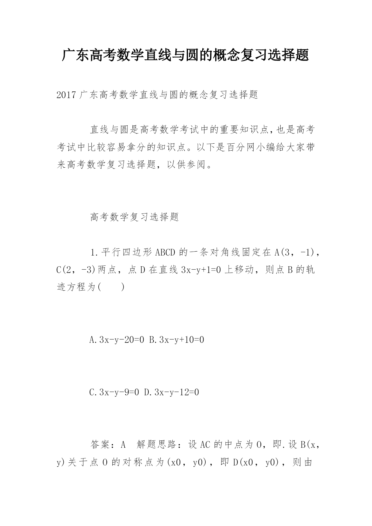 广东高考数学直线与圆的概念复习选择题2017广东高考数学直线与圆的概念复习选择题直线与圆是高考数学考试中的重要知识点,也是高考考试中比较容易拿分的知识点。以下是百分网小编给大家带来高考数学复习选择题,以供参阅。高考数学复习选择题1.平行四边形ABCD的一条对角线固定在A(3,-1),C(2,-3)两点,点D在直线3x-y+1=0上移动,则点B的轨迹方程为()A.3x-y-20=0B.3x-y+10=0C.3x-y-9=0D.3x-y-12=0答案:A解题思路:设AC的中点为O,即.设B(x,y)关于点O的