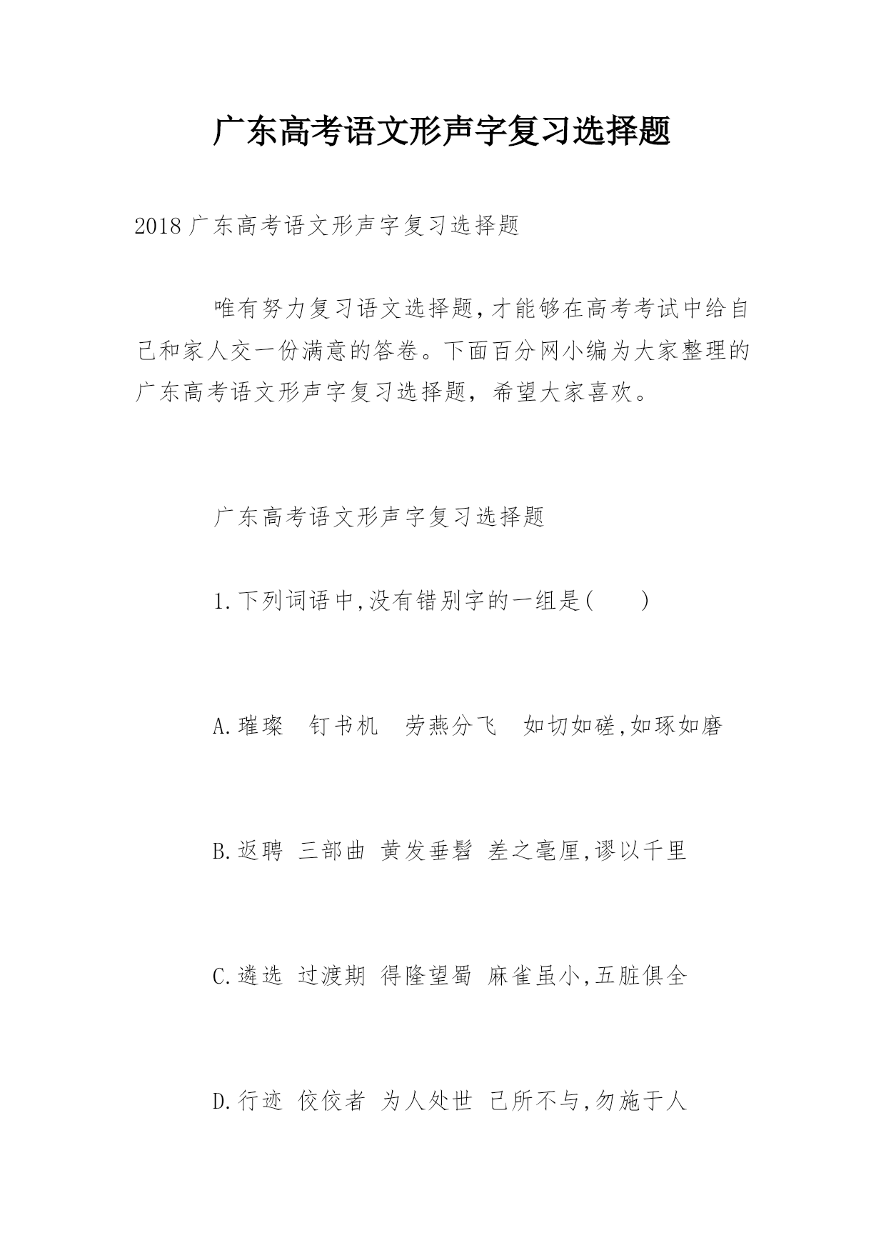 广东高考语文形声字复习选择题2018广东高考语文形声字复习选择题唯有努力复习语文选择题,才能够在高考考试中给自己和家人交一份满意的答卷。下面百分网小编为大家整理的广东高考语文形声字复习选择题,希望大家喜欢。广东高考语文形声字复习选择题1.下列词语中,没有错别字的一组是()A.璀璨钉书机劳燕分飞如切如磋,如琢如磨B.返聘三部曲黄发垂髫差之毫厘,谬以千里C.遴选过渡期得隆望蜀麻雀虽小,五脏俱全D.行迹佼佼者为人处世己所不与,勿施于人解析:BA项“钉”应为“订”;