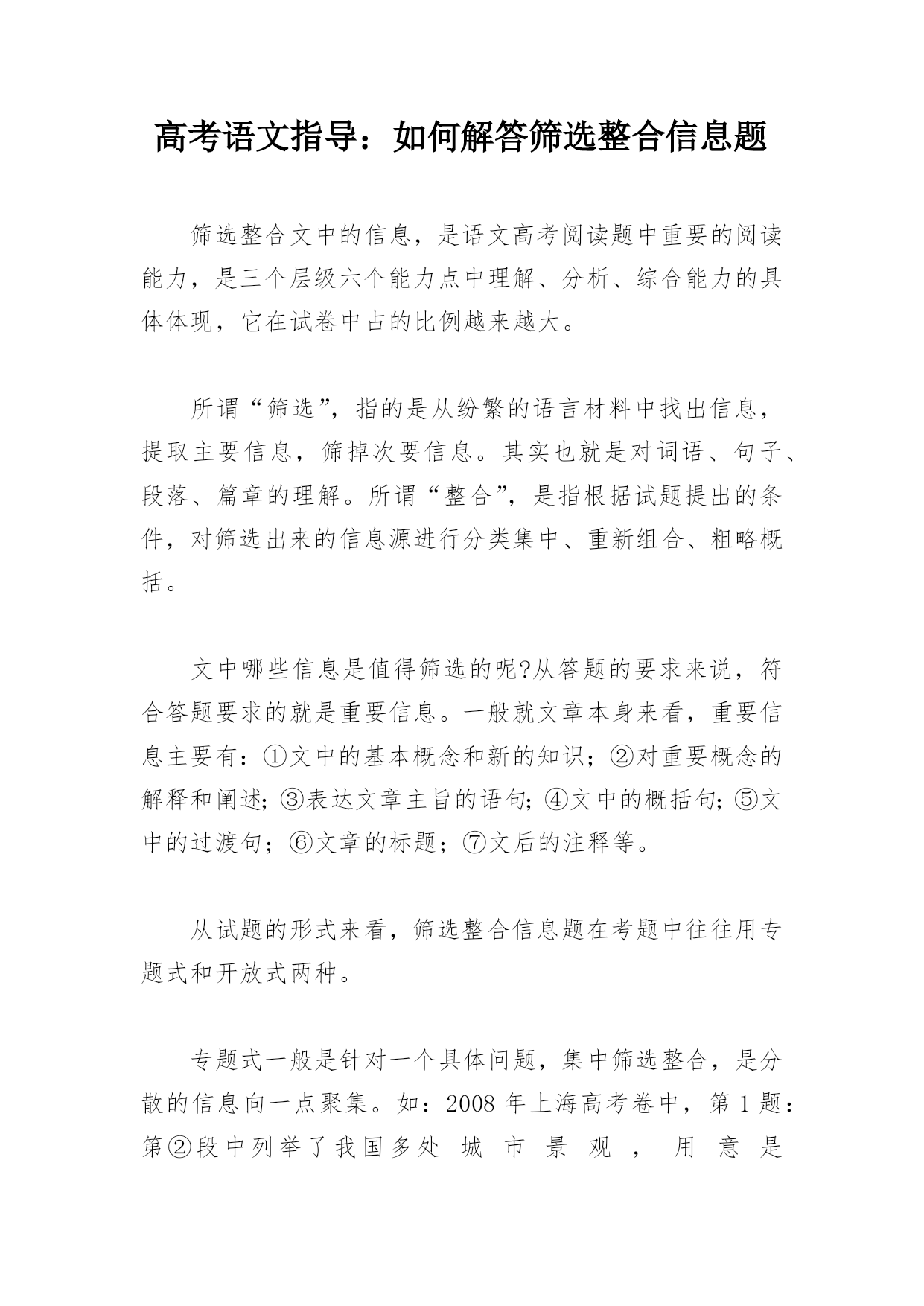 高考语文指导:如何解答筛选整合信息题筛选整合文中的信息,是语文高考阅读题中重要的阅读能力,是三个层级六个能力点中理解、分析、综合能力的具体体现,它在试卷中占的比例越来越大。所谓“筛选”,指的是从纷繁的语言材料中找出信息,提取主要信息,筛掉次要信息。其实也就是对词语、句子、段落、篇章的理解。所谓“整合”,是指根据试题提出的条件,对筛选出来的信息源进行分类集中、重新组合、粗略概括。文中哪些信息是值得筛选的呢?从答题的要求来说,符合答题要求的就是重要信息。一般就文章本身来看,重要信息主要有:①文中的基本概念和新