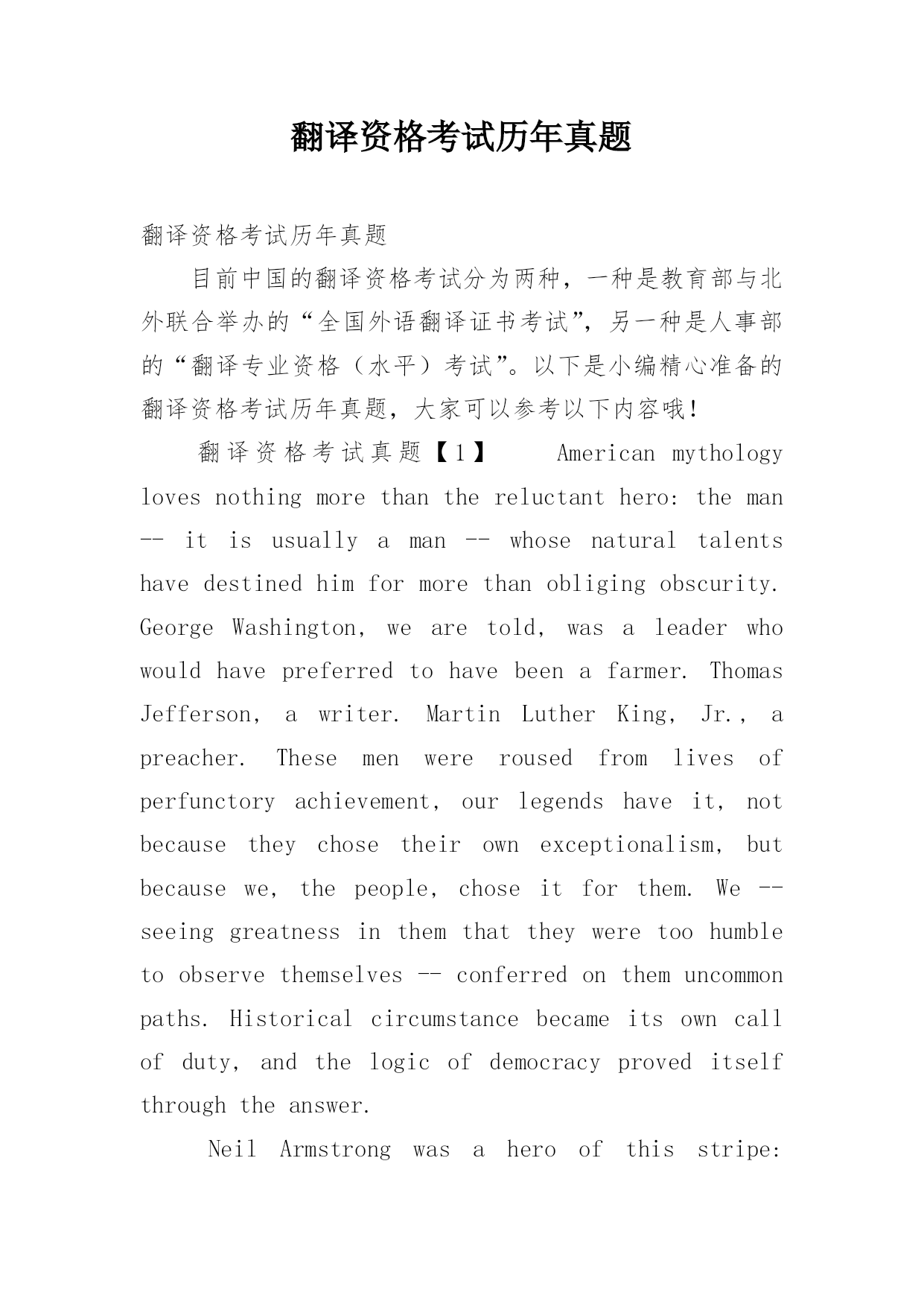翻译资格考试历年真题翻译资格考试历年真题目前中国的翻译资格考试分为两种,一种是教育部与北外联合举办的“全国外语翻译证书考试”,另一种是人事部的“翻译专业资格(水平)考试”。以下是小编精心准备的翻译资格考试历年真题,大家可以参考以下内容哦!翻译资格考试真题【1】Americanmythologylovesnothingmorethanthereluctanthero:theman--itisusuallyaman--whosenaturaltalentshavedestinedhimformorethano