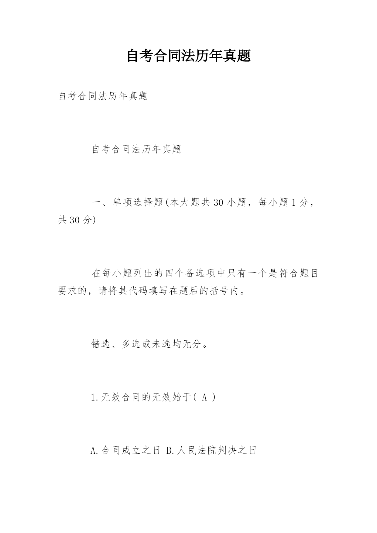 自考合同法历年真题自考合同法历年真题自考合同法历年真题一、单项选择题(本大题共30小题,每小题1分,共30分)在每小题列出的四个备选项中只有一个是符合题目要求的,请将其代码填写在题后的括号内。错选、多选或未选均无分。1.无效合同的无效始于(A)A.合同成立之日B.人民法院判决之日C.仲裁机构裁决之日D.当事人主张之日2.下列合同属于无效合同的是(C)A.因重大误解而订立的合同B.以欺诈手段而订立的损害农民利益的合同C.以欺诈手段而订立的损害国家利益的合同D.订立时显失公平的合同3.无权处分合同经权利人追认