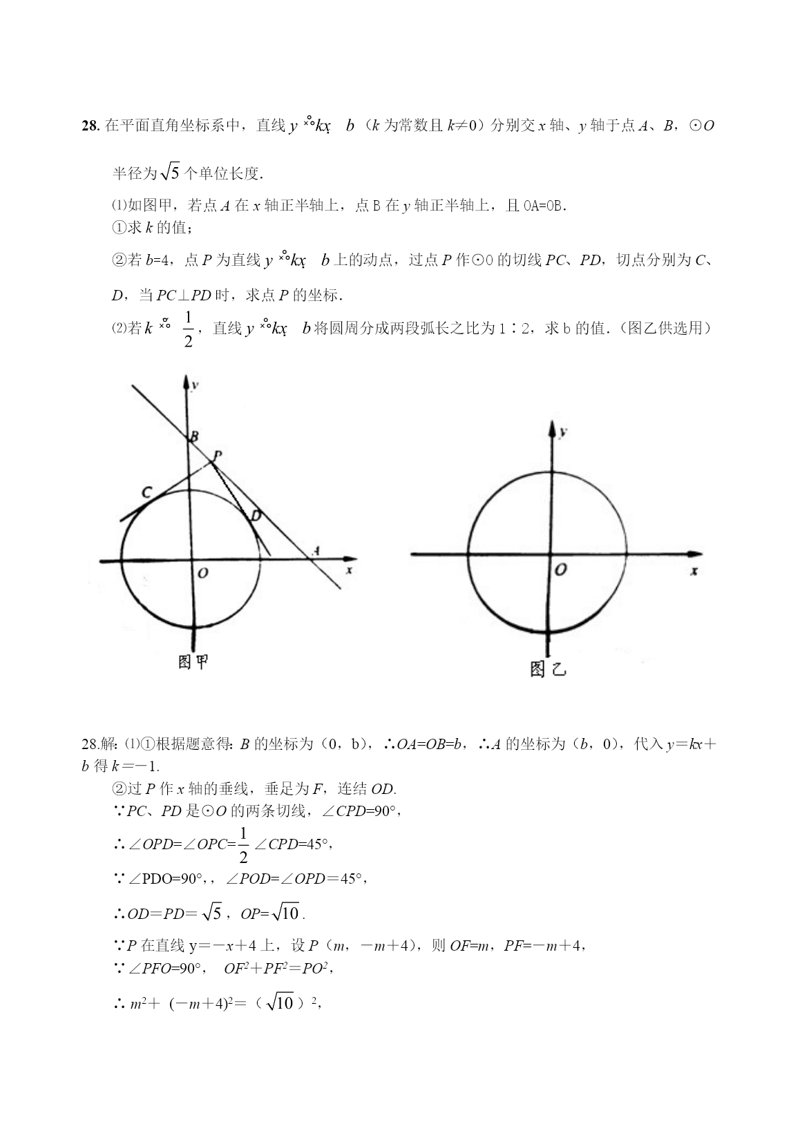 28.在平面直角坐标系中,直线(k为常数且k≠0)分别交x轴、y轴于点A、B,⊙O半径为个单位长度.⑴如图甲,若点A在x轴正半轴上,点B在y轴正半轴上,且OA=OB.①求k的值;②若b=4,点P为直线上的动点,过点P作⊙O的切线PC、PD,切点分别为C、D,当PC⊥PD时,求点P的坐标.⑵若,直线将圆周分成两段弧长之比为1∶2,求b的值.(图乙供选用)28.解:⑴①根据题意得:B的坐标为(0,b),∴OA=OB=b,∴A的坐标为(b,0),代入y=kx+b得k=-1.②过P作x轴的垂线,垂足为F,连结OD