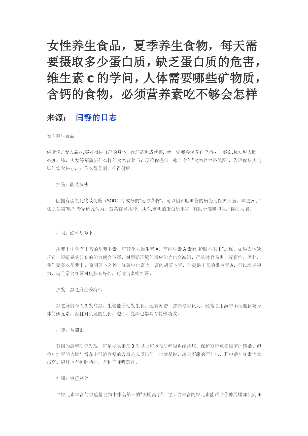 女性养生食品,夏季养生食物,每天需要摄取多少蛋白质,缺乏蛋白质的危害,维生素c的学问,人体需要哪些矿物质,含钙的食物,必须营养素吃不够会怎样来源:HYPERLINK"javascript:showReg(0);"闫静的日志女性养生食品俗话说,女人靠养,要对得住自己的身体,有舒适和成就感,就一定要会保养自己哦~那么,你知道大脑、心脏、肺、头发等都需要什么样的食物营养吗?现给你提供一张全身的"食物养生路线图",告诉你从头到脚的饮食秘方,让你吃得美丽,吃得健康。护脑:菠菜核桃因拥有超氧化物歧化酶(SOD)