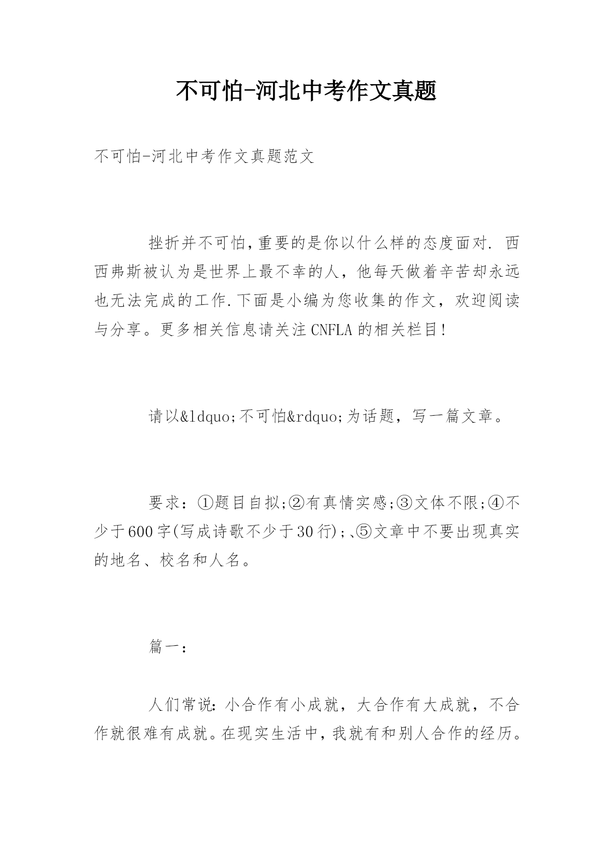 不可怕-河北中考作文真题不可怕-河北中考作文真题范文挫折并不可怕,重要的是你以什么样的态度面对.西西弗斯被认为是世界上最不幸的人,他每天做着辛苦却永远也无法完成的工作.下面是小编为您收集的作文,欢迎阅读与分享。更多相关信息请关注CNFLA的相关栏目!请以“不可怕”为话题,写一篇文章。要求:①题目自拟;②有真情实感;③文体不限;④不少于600字(写成诗歌不少于30行);、⑤文章中不要出现真实的地名、校名和人名。篇一:人们常说:小合作有小成就,大合作有大成就,不合作就很难有成就。在现实