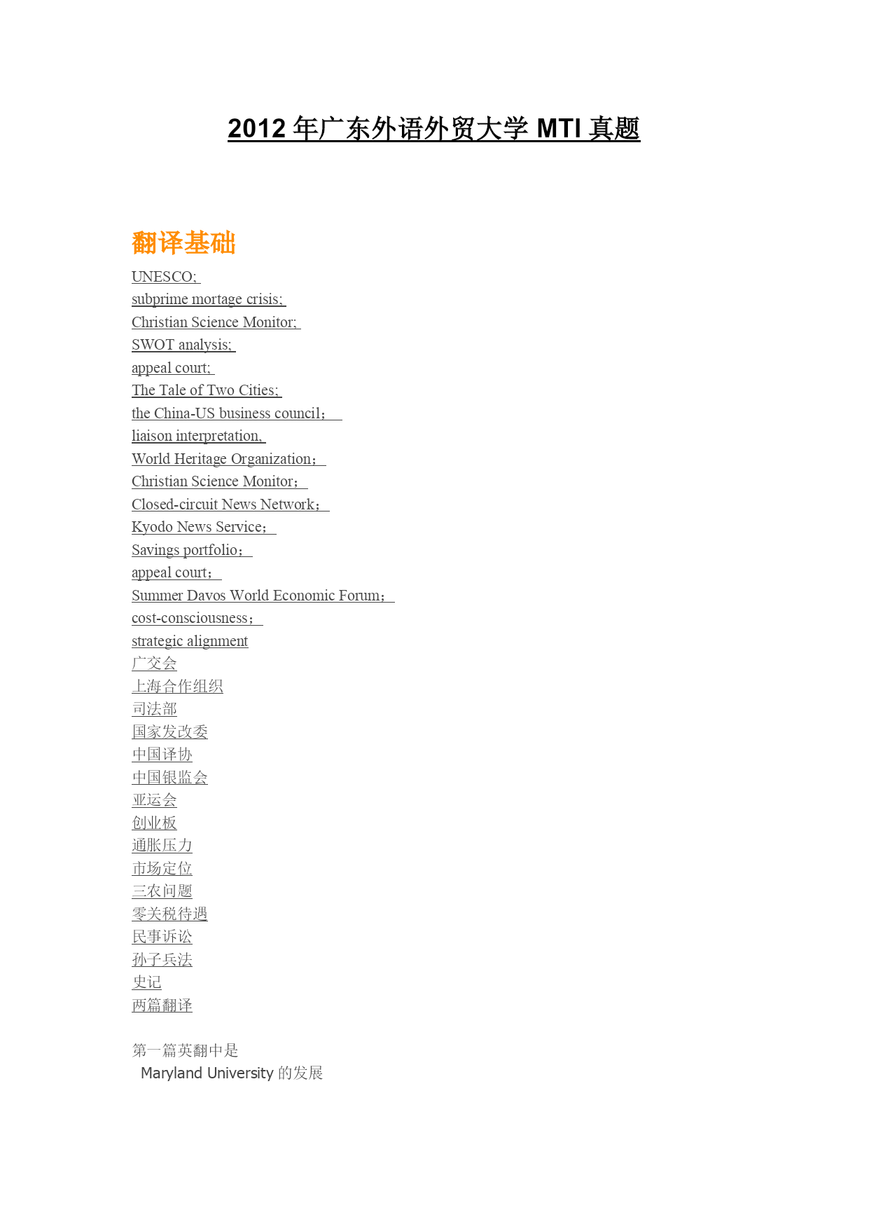 2012年广东外语外贸大学MTI真题翻译基础UNESCO;subprimemortagecrisis;ChristianScienceMonitor;SWOTanalysis;appealcourt;TheTaleofTwoCities;theChina-USbusinesscouncil;liaisoninterpretation,WorldHeritageOrganization;ChristianScienceMonitor;Closed-circuitNewsNetwork;KyodoNewsSe