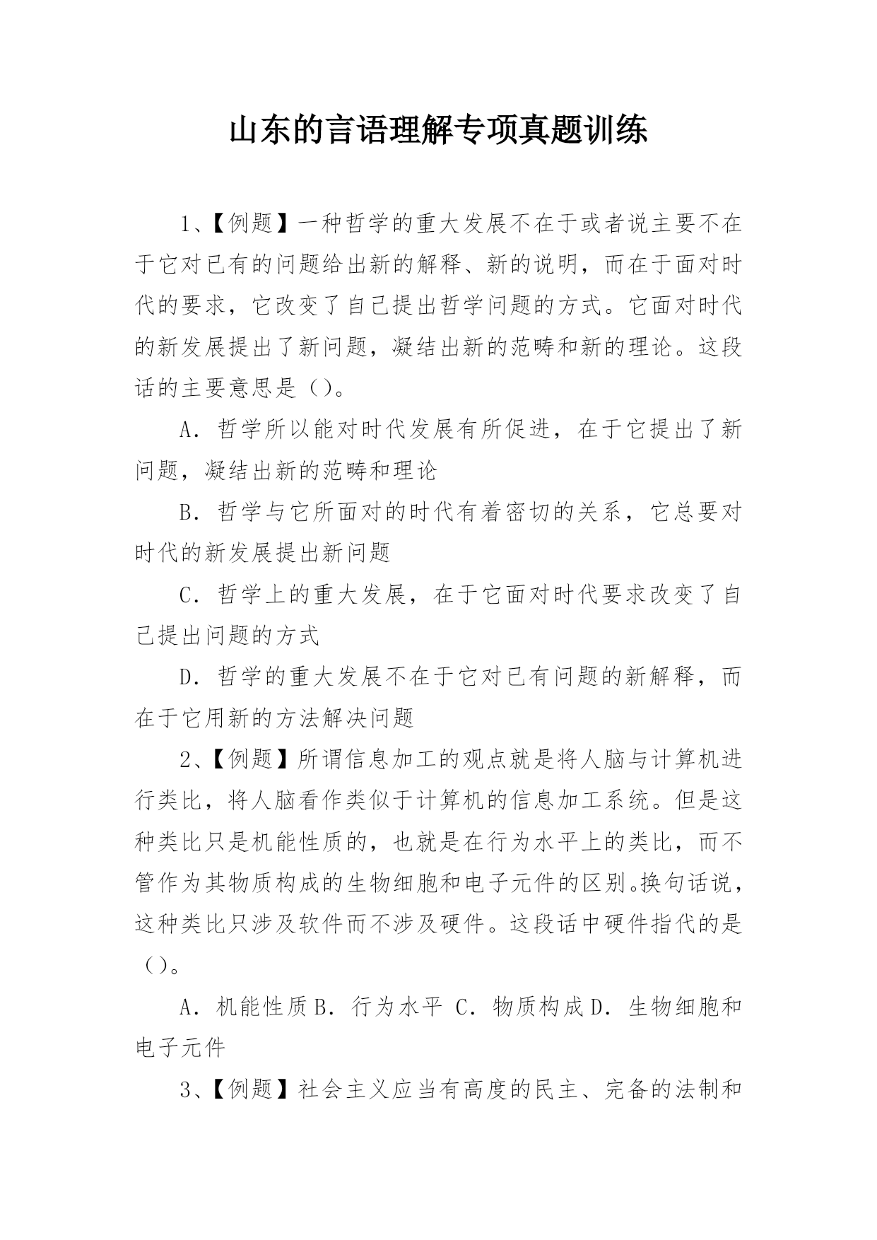 山东的言语理解专项真题训练1、【例题】一种哲学的重大发展不在于或者说主要不在于它对已有的问题给出新的解释、新的说明,而在于面对时代的要求,它改变了自己提出哲学问题的方式。它面对时代的新发展提出了新问题,凝结出新的范畴和新的理论。这段话的主要意思是()。A.哲学所以能对时代发展有所促进,在于它提出了新问题,凝结出新的范畴和理论B.哲学与它所面对的时代有着密切的关系,它总要对时代的新发展提出新问题C.哲学上的重大发展,在于它面对时代要求改变了自己提出问题的方式D.哲学的重大发展不在于它对已有问题的新解释,而在