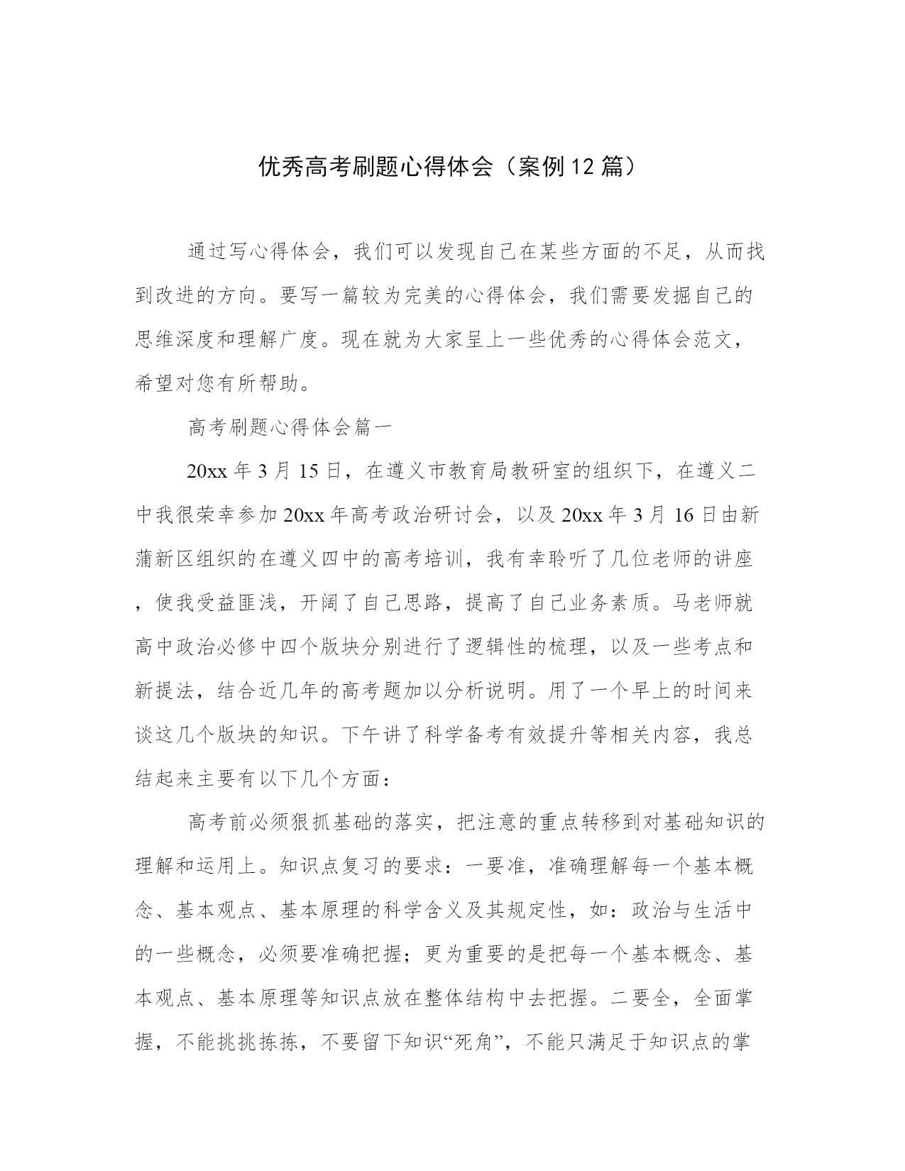优秀高考刷题心得体会(案例12篇)通过写心得体会,我们可以发现自己在某些方面的不足,从而找到改进的方向。要写一篇较为完美的心得体会,我们需要发掘自己的思维深度和理解广度。现在就为大家呈上一些优秀的心得体会范文,希望对您有所帮助。高考刷题心得体会篇一20xx年3月15日,在遵义市教育局教研室的组织下,在遵义二中我很荣幸参加20xx年高考政治研讨会,以及20xx年3月16日由新蒲新区组织的在遵义四中的高考培训,我有幸聆听了几位老师的讲座,使我受益匪浅,开阔了自己思路,提高了自己业务素质。马老师就高中政治必修中