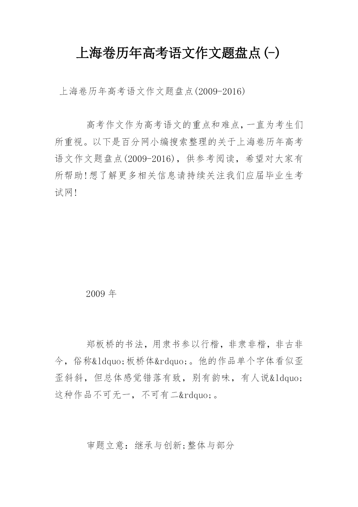 上海卷历年高考语文作文题盘点(-)上海卷历年高考语文作文题盘点(2009-2016)高考作文作为高考语文的重点和难点,一直为考生们所重视。以下是百分网小编搜索整理的关于上海卷历年高考语文作文题盘点(2009-2016),供参考阅读,希望对大家有所帮助!想了解更多相关信息请持续关注我们应届毕业生考试网!2009年郑板桥的书法,用隶书参以行楷,非隶非楷,非古非今,俗称“板桥体”。他的作品单个字体看似歪歪斜斜,但总体感觉错落有致,别有韵味,有人说“这种作品不可无一,不可有二&