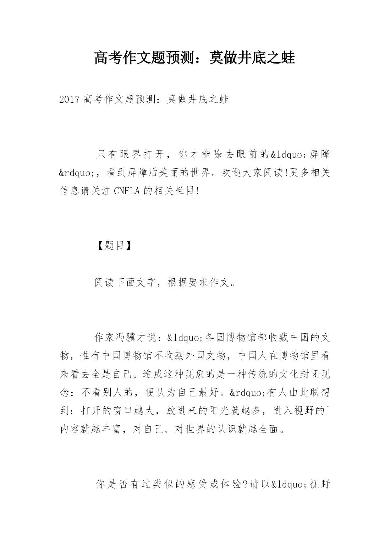 高考作文题预测:莫做井底之蛙2017高考作文题预测:莫做井底之蛙只有眼界打开,你才能除去眼前的“屏障”,看到屏障后美丽的世界。欢迎大家阅读!更多相关信息请关注CNFLA的相关栏目!【题目】阅读下面文字,根据要求作文。作家冯骥才说:“各国博物馆都收藏中国的文物,惟有中国博物馆不收藏外国文物,中国人在博物馆里看来看去全是自己。造成这种现象的是一种传统的文化封闭现念:不看别人的,便认为自己最好。”有人由此联想到:打开的窗口越大,放进来的阳光就越多,进入视野的`内容