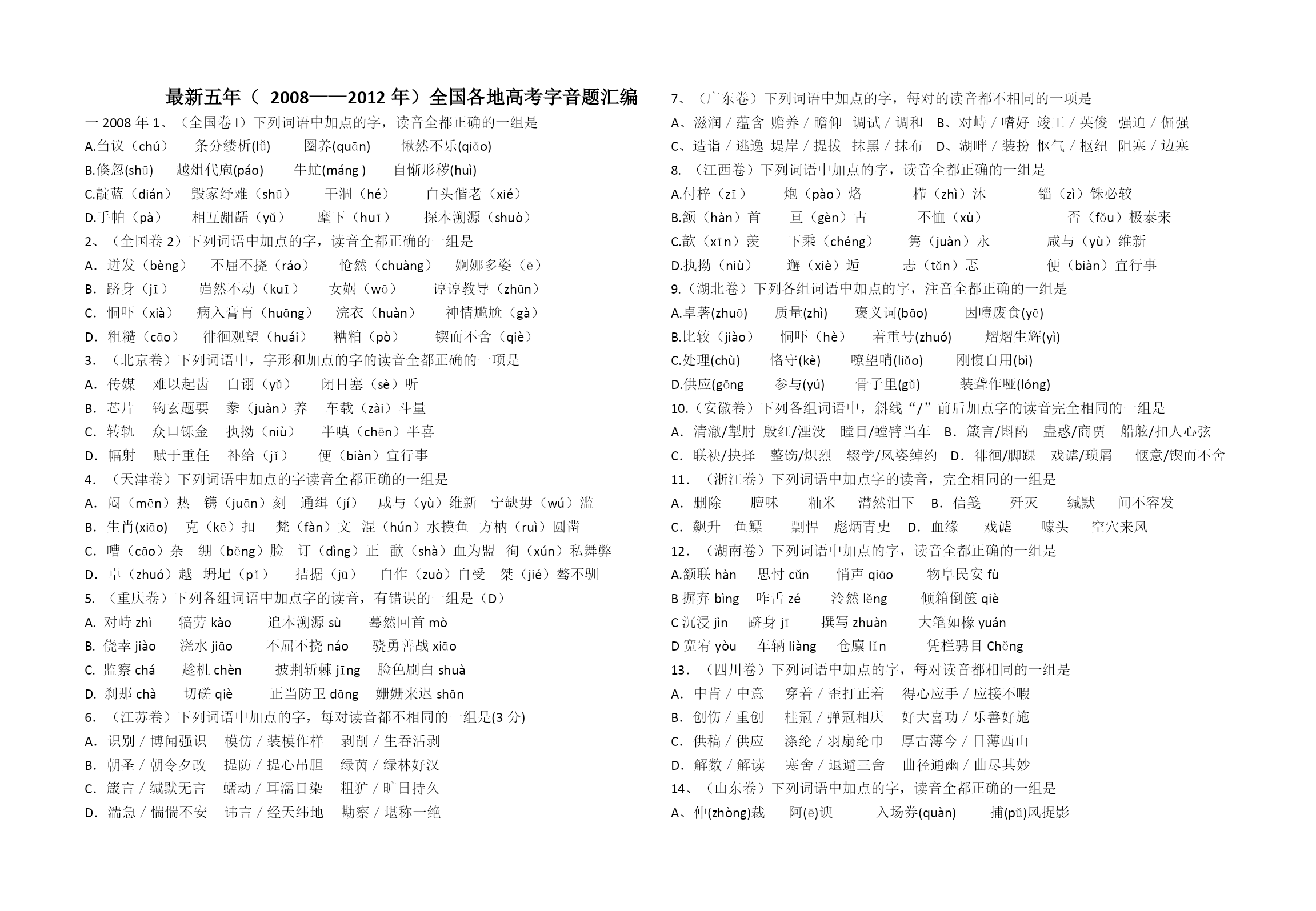 最新五年(2008——2012年)全国各地高考字音题汇编一2008年1、(全国卷I)下列词语中加点的字,读音全都正确的一组是A.刍议(chú)条分缕析(lǚ)圈养(quān)愀然不乐(qiǎo)B.倏忽(shū)越俎代庖(páo)牛虻(máng)自惭形秽(huì)C.靛蓝(dián)毁家纾难(shū)干涸(hé)白头偕老(xié)D.手帕(pà)相互龃龉(yǔ)麾下(huī)探本溯源(shuò)2、(全国卷2)下列词语中加点的字,读音全都正确的一组是A.迸发(bèng)不屈不挠(ráo)怆然(chuàng