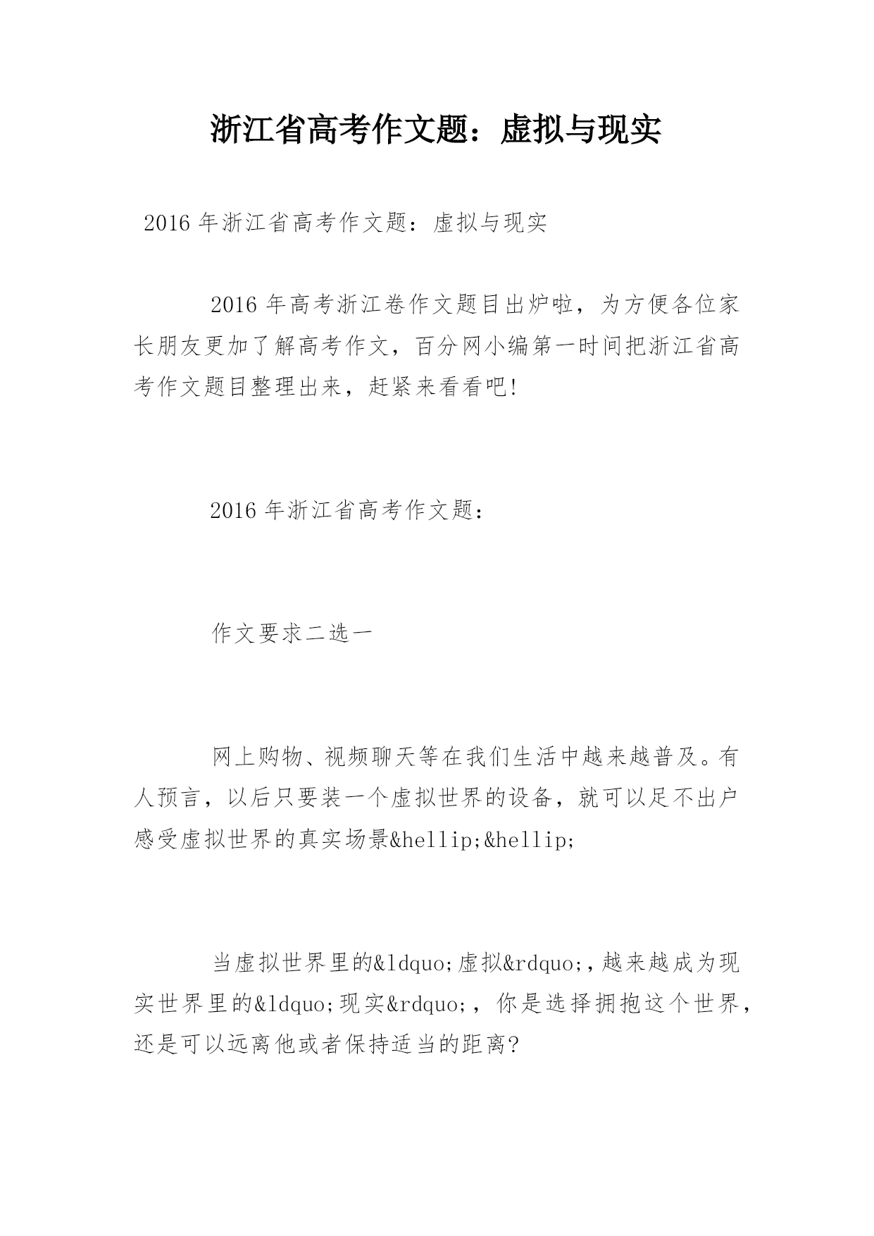 浙江省高考作文题:虚拟与现实2016年浙江省高考作文题:虚拟与现实2016年高考浙江卷作文题目出炉啦,为方便各位家长朋友更加了解高考作文,百分网小编第一时间把浙江省高考作文题目整理出来,赶紧来看看吧!2016年浙江省高考作文题:作文要求二选一网上购物、视频聊天等在我们生活中越来越普及。有人预言,以后只要装一个虚拟世界的设备,就可以足不出户感受虚拟世界的真实场景……当虚拟世界里的“虚拟”,越来越成为现实世界里的“现实”,你是选择拥抱