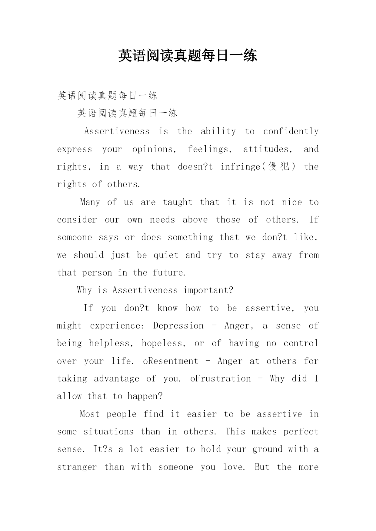 英语阅读真题每日一练英语阅读真题每日一练英语阅读真题每日一练Assertivenessistheabilitytoconfidentlyexpressyouropinions,feelings,attitudes,andrights,inawaythatdoesn?tinfringe(侵犯)therightsofothers.Manyofusaretaughtthatitisnotnicetoconsiderourownneedsabovethoseofothers.Ifsomeonesaysordoes