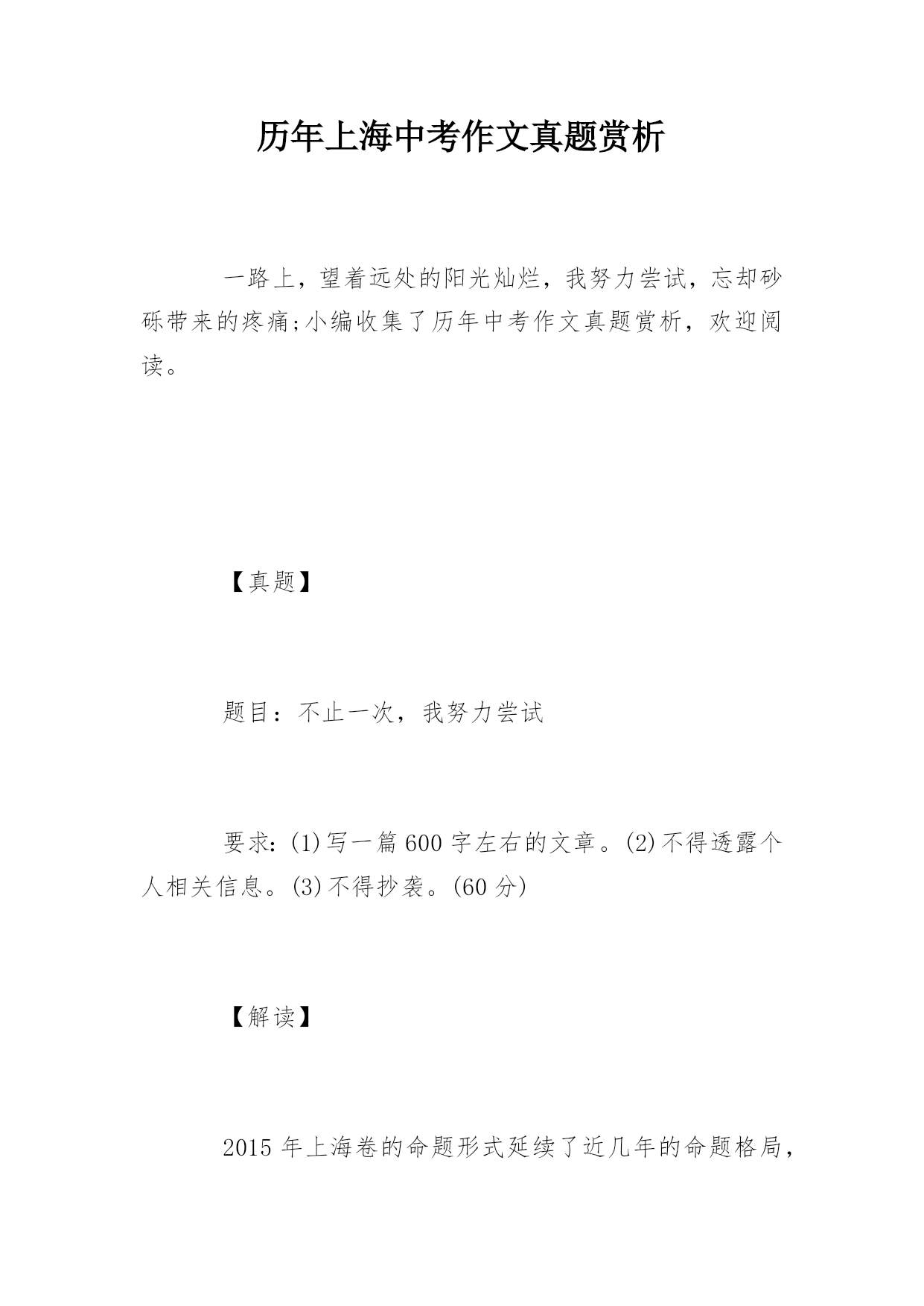 历年上海中考作文真题赏析一路上,望着远处的阳光灿烂,我努力尝试,忘却砂砾带来的疼痛;小编收集了历年中考作文真题赏析,欢迎阅读。【真题】题目:不止一次,我努力尝试要求:(1)写一篇600字左右的文章。(2)不得透露个人相关信息。(3)不得抄袭。(60分)【解读】2015年上海卷的命题形式延续了近几年的命题格局,即采用全命题的命题形式,并呈现出“稳中求变”、“稳中发展”的思想和导向,在难度上比2014年稍微有所增加,体现了渐进式的特点,考生只要用心读题,就会发现命题者并没有刻意在审题上设置障碍。与之前的作文题