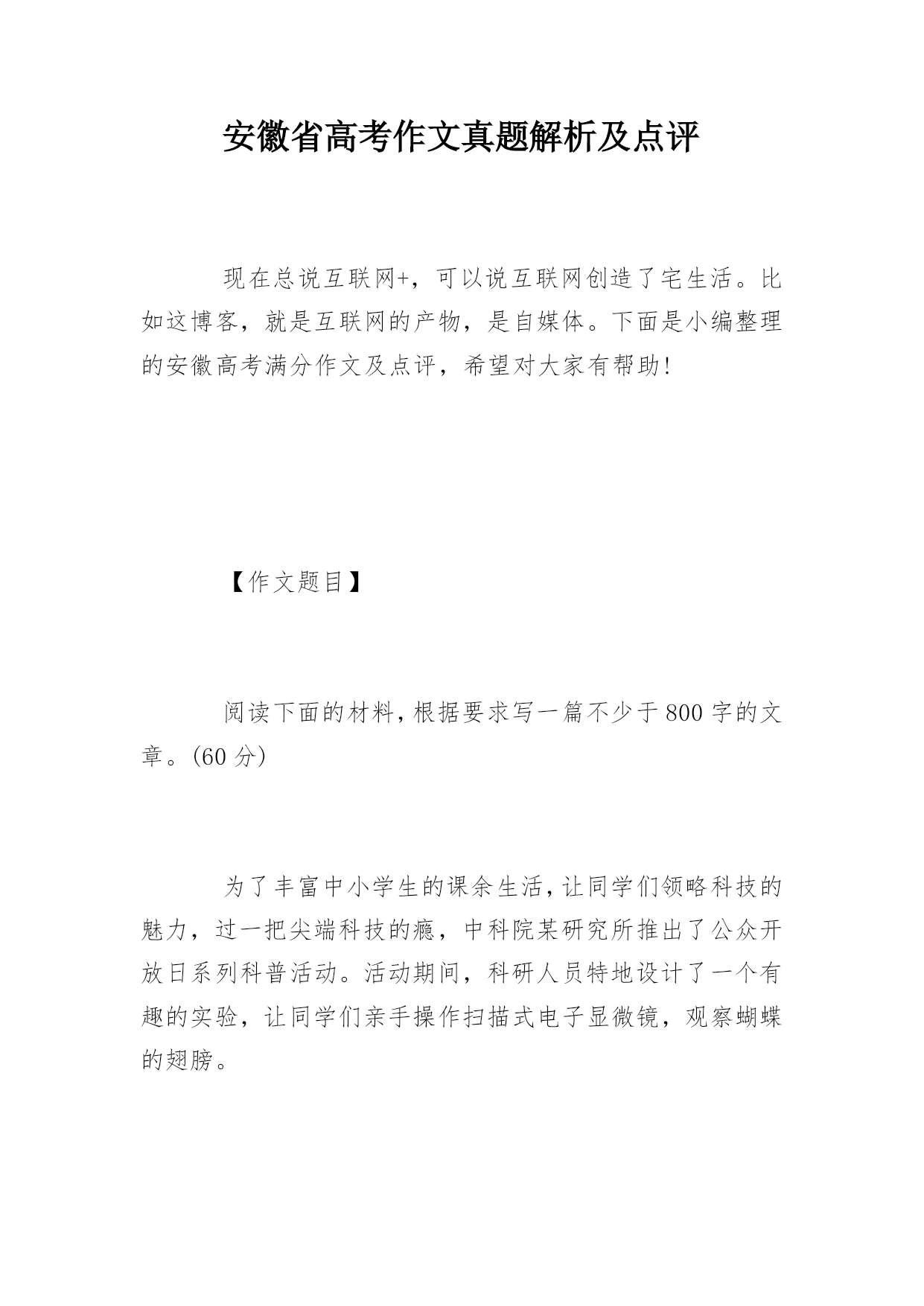 安徽省高考作文真题解析及点评现在总说互联网+,可以说互联网创造了宅生活。比如这博客,就是互联网的产物,是自媒体。下面是小编整理的安徽高考满分作文及点评,希望对大家有帮助!【作文题目】阅读下面的材料,根据要求写一篇不少于800字的文章。(60分)为了丰富中小学生的课余生活,让同学们领略科技的魅力,过一把尖端科技的瘾,中科院某研究所推出了公众开放日系列科普活动。活动期间,科研人员特地设计了一个有趣的实验,让同学们亲手操作扫描式电子显微镜,观察蝴蝶的翅膀。通过这台可以看清纳米尺度物体三维结构的显微镜,同学们惊奇