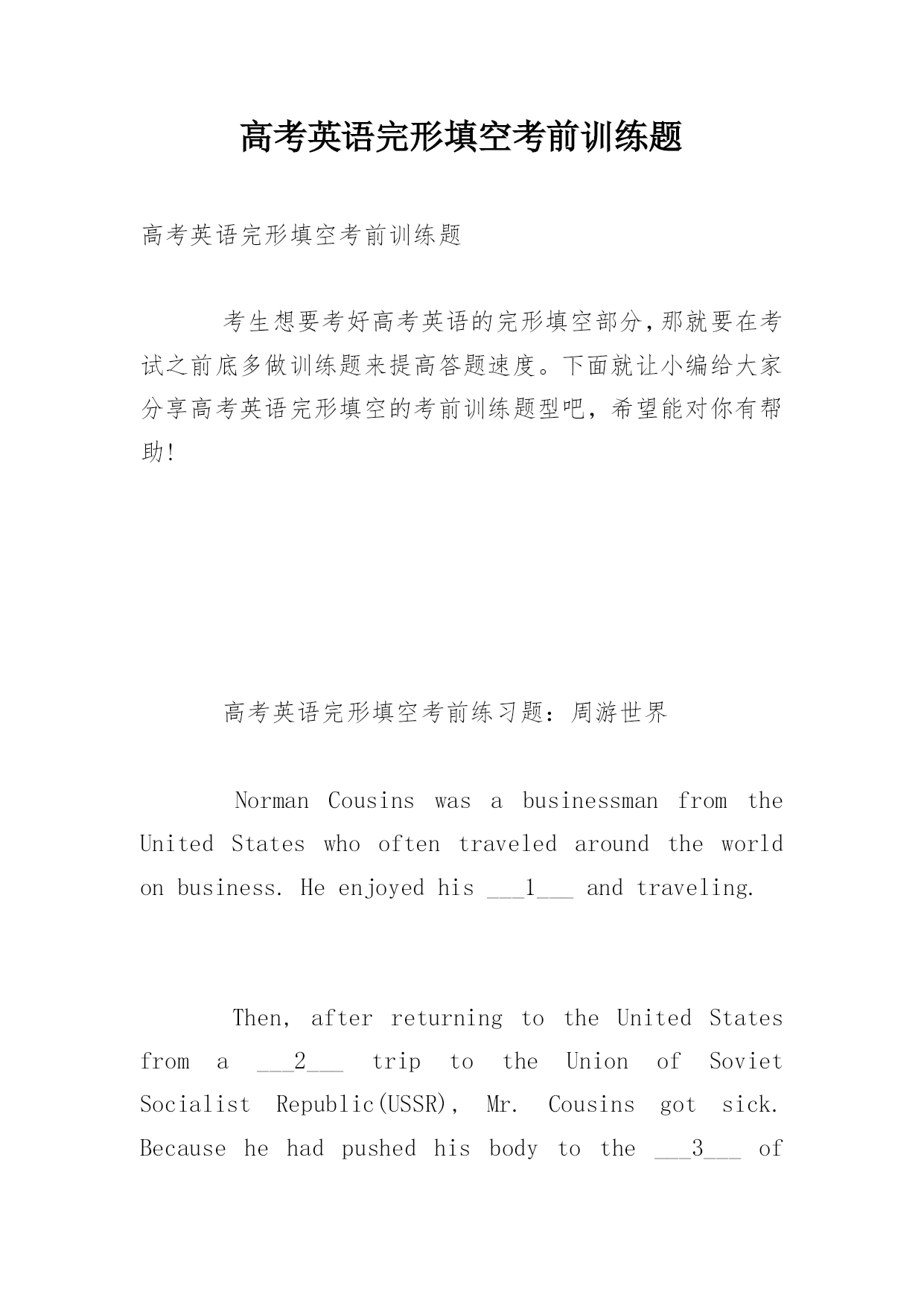 高考英语完形填空考前训练题高考英语完形填空考前训练题考生想要考好高考英语的完形填空部分,那就要在考试之前底多做训练题来提高答题速度。下面就让小编给大家分享高考英语完形填空的考前训练题型吧,希望能对你有帮助!高考英语完形填空考前练习题:周游世界NormanCousinswasabusinessmanfromtheUnitedStateswhooftentraveledaroundtheworldonbusiness.Heenjoyedhis___1___andtraveling.Then,afterretu
