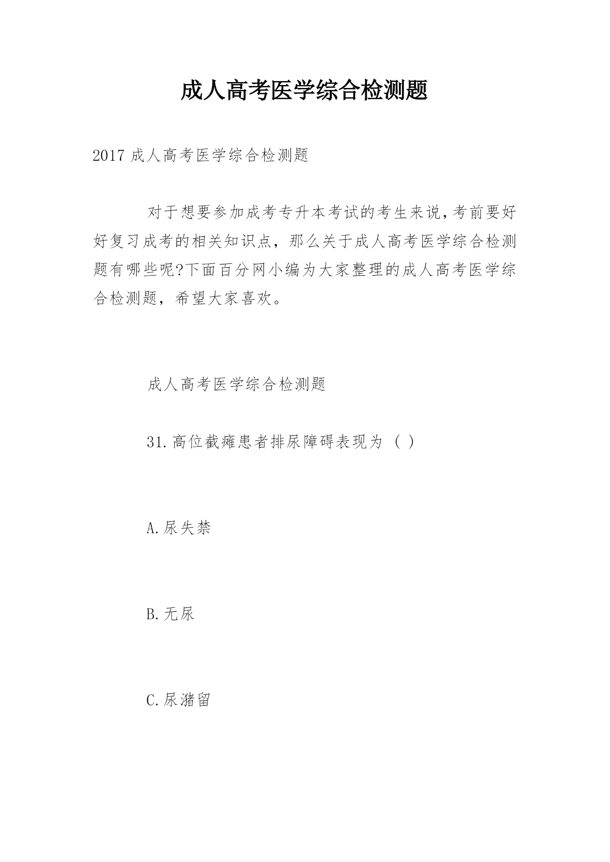 成人高考医学综合检测题2017成人高考医学综合检测题对于想要参加成考专升本考试的考生来说,考前要好好复习成考的相关知识点,那么关于成人高考医学综合检测题有哪些呢?下面百分网小编为大家整理的成人高考医学综合检测题,希望大家喜欢。成人高考医学综合检测题31.高位截瘫患者排尿障碍表现为()A.尿失禁B.无尿C.尿潴留D.尿崩症E.尿频32.对视杆细胞的叙述,下列选项错误的是()A.其感色素为视紫红质B.无色觉C.具有暗光觉功能D.能分辨颜色E.视紫红质由视蛋白和视黄醛组成33.抑制性突触后电位的产生是由于突触后