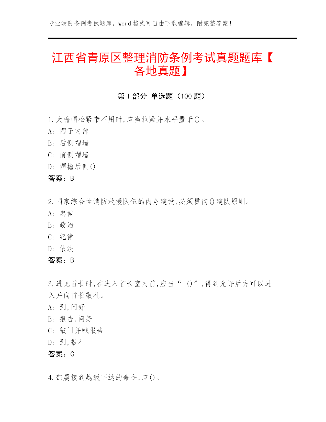 专业消防条例考试题库,word格式可自由下载编辑,附完整答案!江西省青原区整理消防条例考试真题题库【各地真题】第I部分单选题(100题)1.大檐帽松紧带不用时,应当拉紧并水平置于()。A:帽子内部B:后侧帽墙C:前侧帽墙D:帽檐后侧()答案:B2.国家综合性消防救援队伍的内务建设,必须贯彻()建队原则。A:忠诚B:政治C:纪律D:依法答案:B3.进见首长时,在进入首长室内前,应当“()”,得到允许后方可以进入并向首长敬礼。A:到,问好B:报告,问好C:敲门并喊报告D:到,敬礼答案:C4.部属接到越级下达的