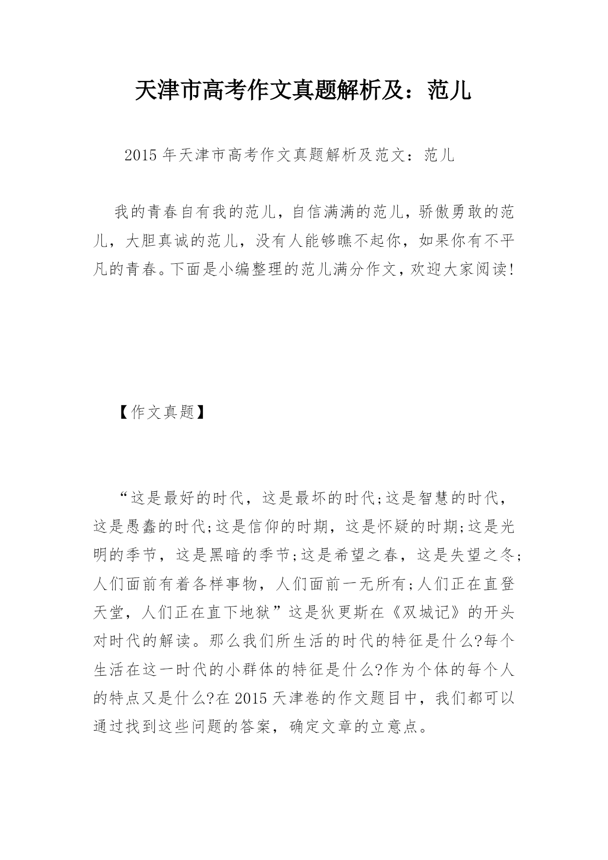 天津市高考作文真题解析及:范儿2015年天津市高考作文真题解析及范文:范儿我的青春自有我的范儿,自信满满的范儿,骄傲勇敢的范儿,大胆真诚的范儿,没有人能够瞧不起你,如果你有不平凡的青春。下面是小编整理的范儿满分作文,欢迎大家阅读!【作文真题】“这是最好的时代,这是最坏的时代;这是智慧的时代,这是愚蠢的时代;这是信仰的时期,这是怀疑的时期;这是光明的季节,这是黑暗的季节;这是希望之春,这是失望之冬;人们面前有着各样事物,人们面前一无所有;人们正在直登天堂,人们正在直下地狱”这是狄更斯在《双城记》的开头对时代