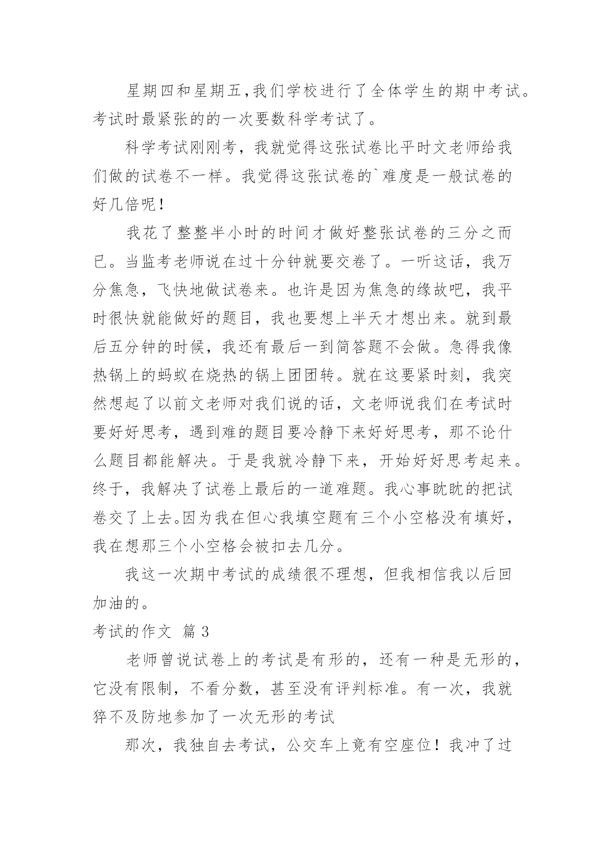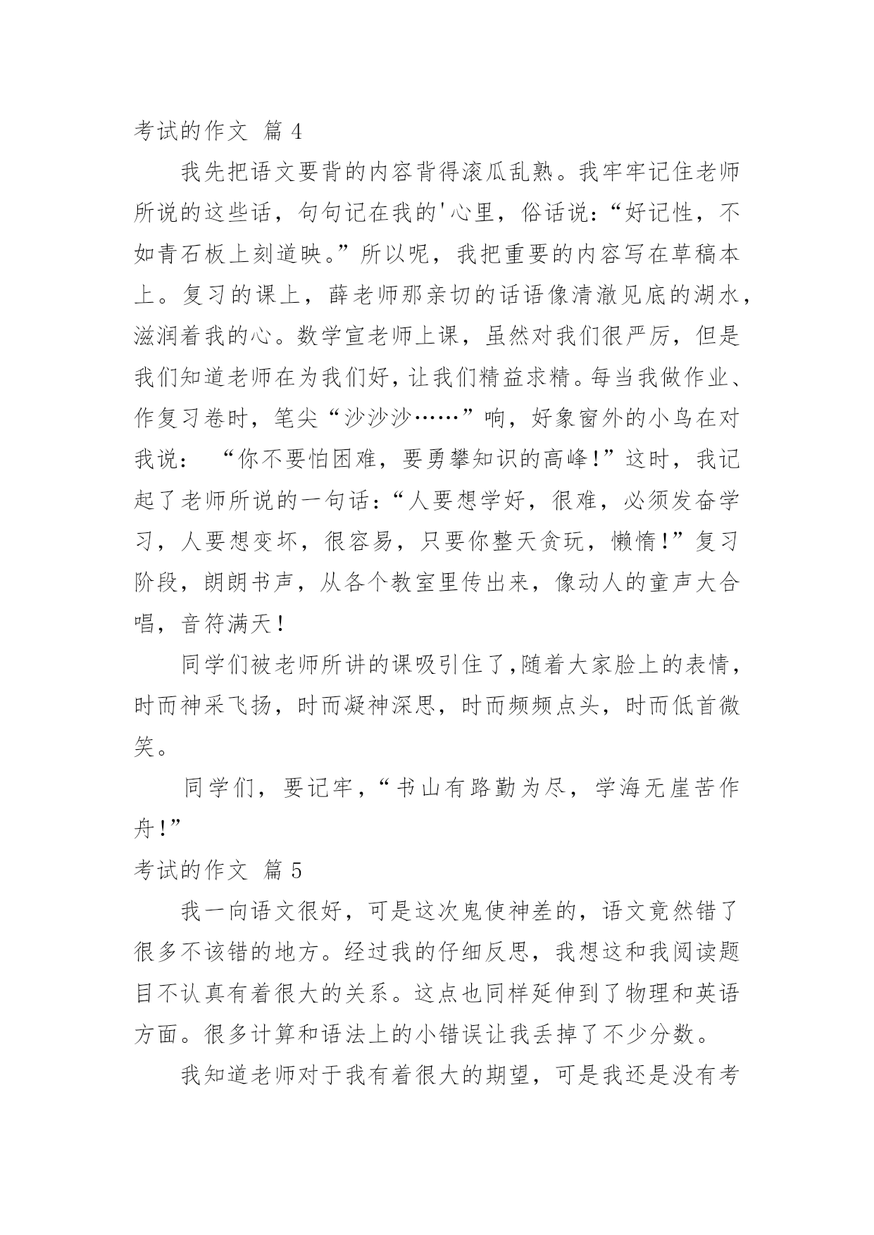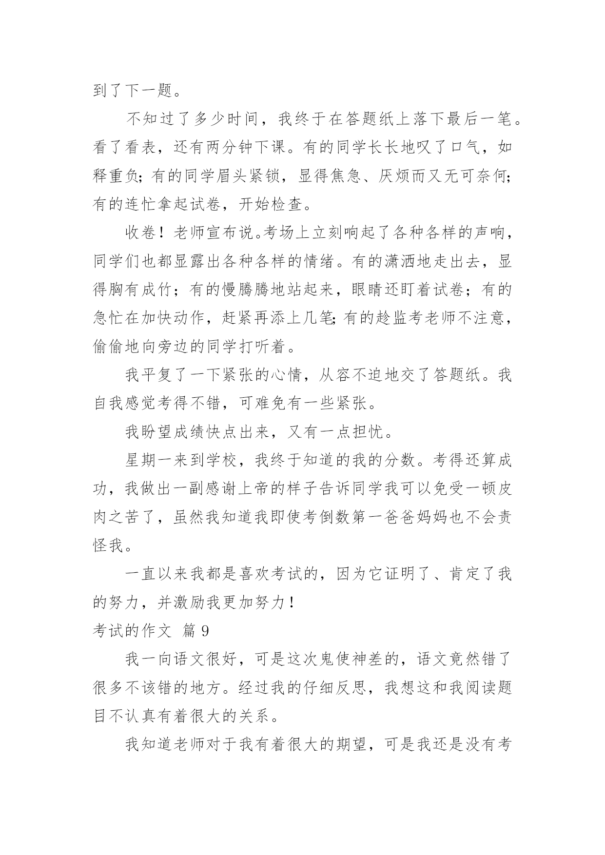 考试的作文考试的作文汇总9篇在平时的学习、工作或生活中,说到作文,大家肯定都不陌生吧,作文是人们以书面形式表情达意的言语活动。相信很多朋友都对写作文感到非常苦恼吧,以下是小编精心整理的考试的作文10篇,希望能够帮助到大家。考试的作文篇1星期二,我们考了英语,英语杨老师说这次我们的英语考试分为三部分,第一是读单词、听单词,第二是读课文签字,随意抽查一篇,第三是考一份试题,满分六十分,然后这三部分加起来试试这次的英语总分。今天我们考了英语同步学习与检测上的1~4单元测试,自我感觉还不错。到了星期三,一大早就开始考数学,从7:50开始考,到了离第一节课下课前5分钟的时候收卷。下午1:30到2:40,考语文,试题四面,再加一面作文稿纸。在考试的途中,我感觉时间过的飞快,一眨眼就又收卷了。到了星期四的下午,数学殷老师就看完卷子发卷了,那时我非常紧张,心怦怦直跳,但是当我的`卷子到我的手里时,心里的大石头就落地了,数学考得还凑副——96分。英语和语文都还没发,只能自己默默的祈祷考好分数。考试的作文篇2星期四和星期五,我们学校进行了全体学生的期中考试。考试时最紧张的的一次要数科学考试了。科学考试刚刚考,我就觉得这张试卷比平时文老师给我们做的试卷不一样。我觉得这张试卷的`难度是一般试卷的好几倍呢!我花了整整半小时的时间才做好整张试卷的三分之而已。当监考老师说在过十分钟就要交卷了。一听这话,我万分焦急,飞快地做试卷来。也许是因为焦急的缘故吧,我平时很快就能做好的题目,我也要想上半天才想出来。就到最后五分钟的时候,我还有最后一到简答题不会做。急得我像热锅上的蚂蚁在烧热的锅上团团转。就在这要紧时刻,我突然想起了以前文老师对我们说的话,文老师说我们在考试时要好好思考,遇到难的题目要冷静下来好好思考,那不论什么题目都能解决。于是我就冷静下来,开始好好思考起来。终于,我解决了试卷上最后的一道难题。我心事眈眈的把试卷交了上去。因为我在但心我填空题有三个小空格没有填好,我在想那三个小空格会被扣去几分。我这一次期中考试的成绩很不理想,但我相信我以后回加油的。考试的作文篇3老师曾说试卷上的考试是有形的,还有一种是无形的,它没有限制,不看分数,甚至没有评判标准。有一次,我就猝不及防地参加了一次无形的考试那次,我独自去考试,公交车上竟有空座位!我冲了过去,坐下之后暗暗庆幸。过了几站,我看见一位满脸沧桑的老奶奶走了过来,身穿不知什么颜色的衣服,那饱经风霜的'样子,一看就是早已品尝过生活的酸甜苦辣。车刚停稳,那位老奶奶就上了车,从口袋里摸出了一个皱皱巴巴的小包,从里面拿出了一块折得四四方方的手帕,又从里面掏出了一枚硬币塞进了投币箱里。几位年轻貌美的阿姨下意识地捂住了嘴,并向里面坐了坐。其中,有一位阿姨竟然戴上了口罩。老奶奶仿佛明白了什么,畏畏缩缩地站在了过道里。随着公交车的颠簸,身子摇来摇去,仿佛雨中的浮萍,我的心不由得揪了起来。“嘎——”公交车突然来了个急刹车,车上的乘客手忙脚乱,老爷爷也不例外,慌忙中,老奶奶抓住了一位阿姨的衣角,那位阿姨像避瘟神一样,拍打着衣角唯恐避之不及。老奶奶见状连跟那位阿姨道歉,并且又站回了过道里。我正准备起身却又迟疑了:应该刚才就站起来的……正当我胡思乱想时,又来一个急转弯老奶奶的拐杖甩了出去……我连忙站起来说:“老奶奶,您来这边坐。”老奶奶看了我一眼,随即坐了下来。“谢谢你啊,小朋友!”她笑咪咪地问我,“你要去哪里啊?”我回答道:“去考试。”老奶奶意味深长地说:“小朋友,无论你这一次考得怎么样,你都能通过……考试!”“啊?我通过了考试?”等我明白过来,我的脸比原来更红,我不好意思地低下了头。那次考试,我考得不错,但更高兴的是,我顺利地通过了无形的考试!考试的作文篇4我先把语文要背的内容背得滚瓜乱熟。我牢牢记住老师所说的这些话,句句记在我的'心里,俗话说:“好记性,不如青石板上刻道映。”所以呢,我把重要的内容写在草稿本上。复习的课上,薛老师那亲切的话语像清澈见底的湖水,滋润着我的心。数学宣老师上课,虽然对我们很严厉,但是我们知道老师在为我们好,让我们精益求精。每当我做作业、作复习卷时,笔尖“沙沙沙……”响,好象窗外的小鸟在对我说:“你不要怕困难,要勇攀知识的高峰!”这时,我记起了老师所说的一句话:“人要想学好,很难,必须发奋学习,人要想变坏,很容易,只要你整天贪玩,懒惰!”复习阶段,朗朗书声,从各个教室里传出来,像动人的童声大合唱,音符满天!同学们被老师所讲的课吸引住了,随着大家脸上的表情,时而神采飞扬,时而凝神深思,时而频频点头,时而低首微笑。同学们,要记牢,“书山有路勤为尽,学海无崖苦作舟!”考试的作文篇5我一向语文很好,可是这次鬼使神差的,语文竟然错了很多不该错的地方。经过我的仔细反思,我想这和我阅读题目不认真有着很大的关系。这点