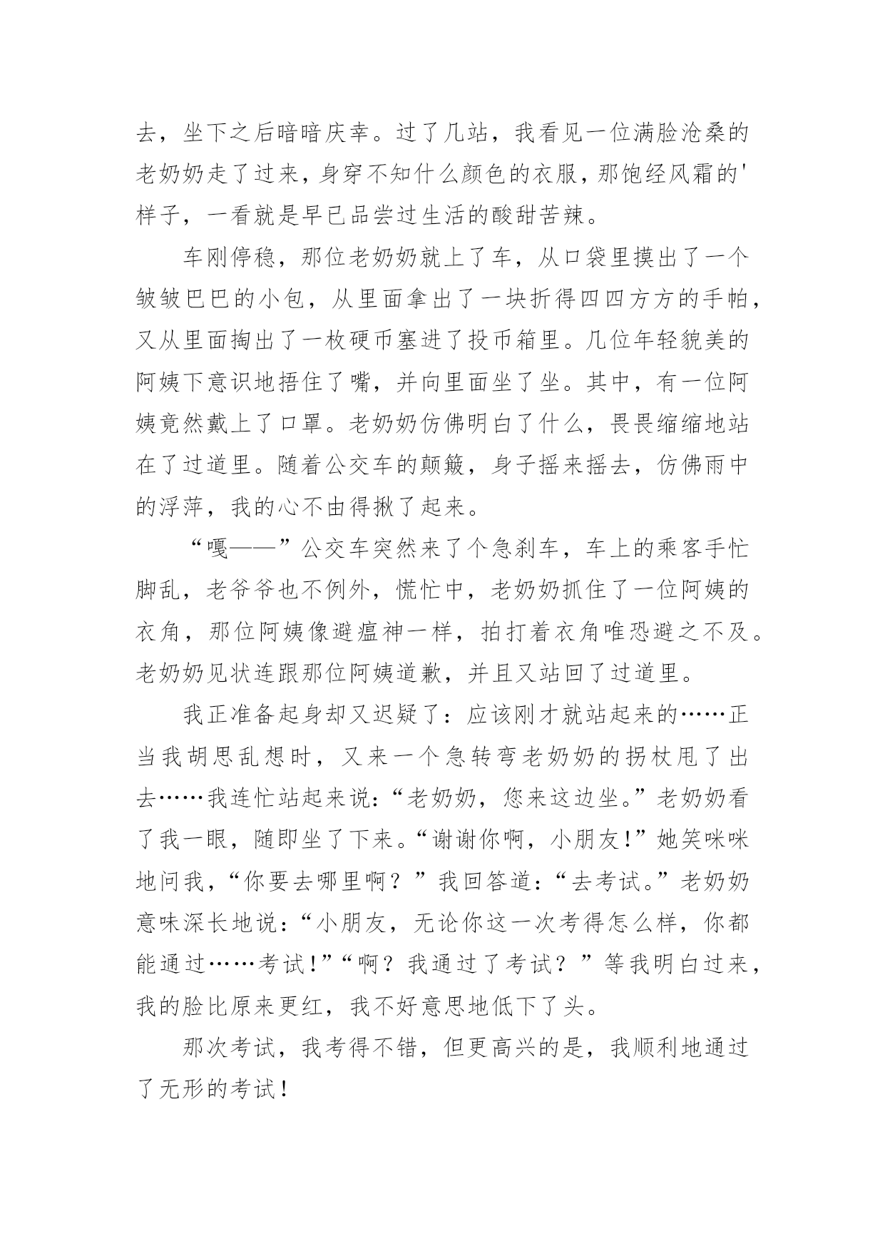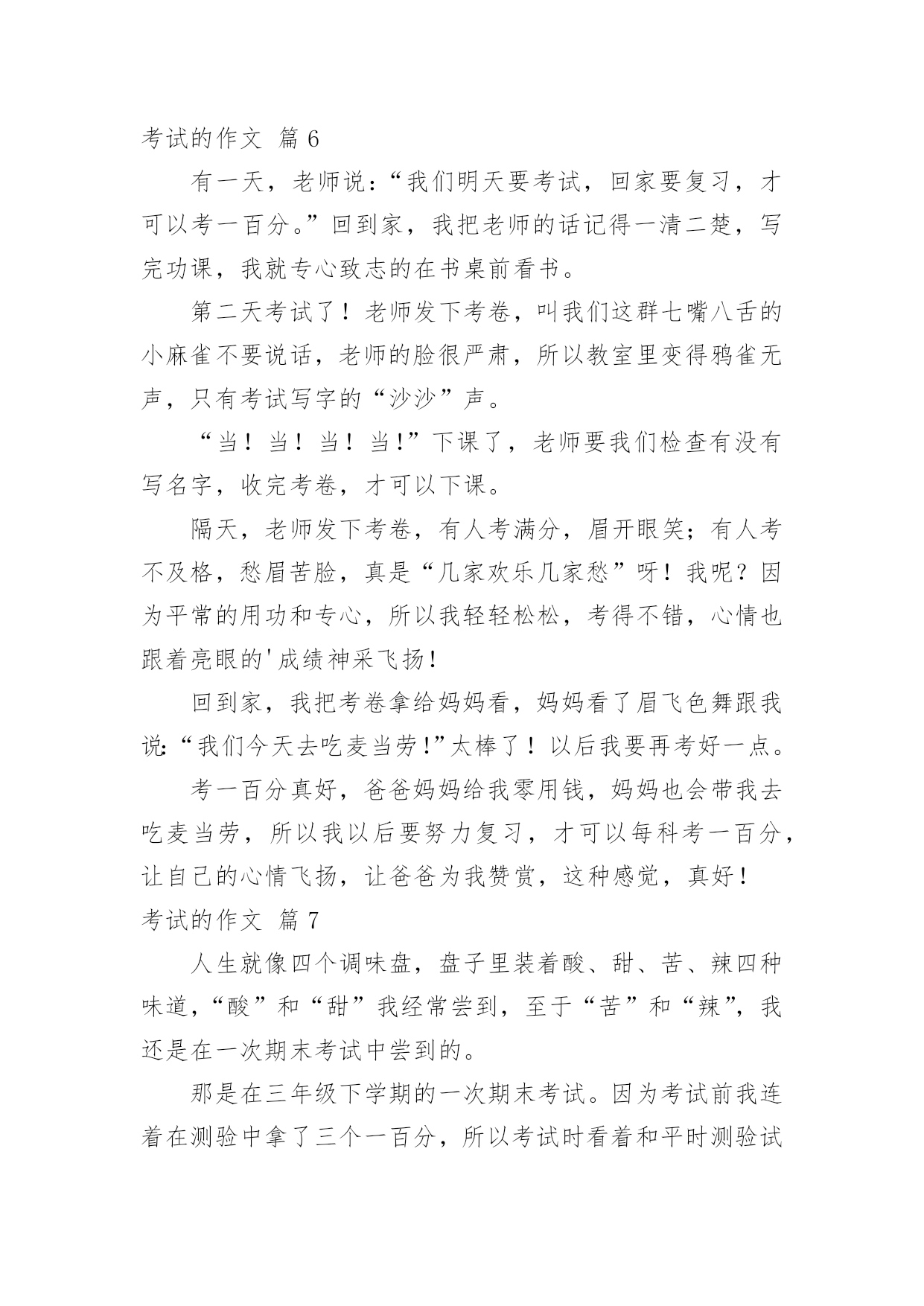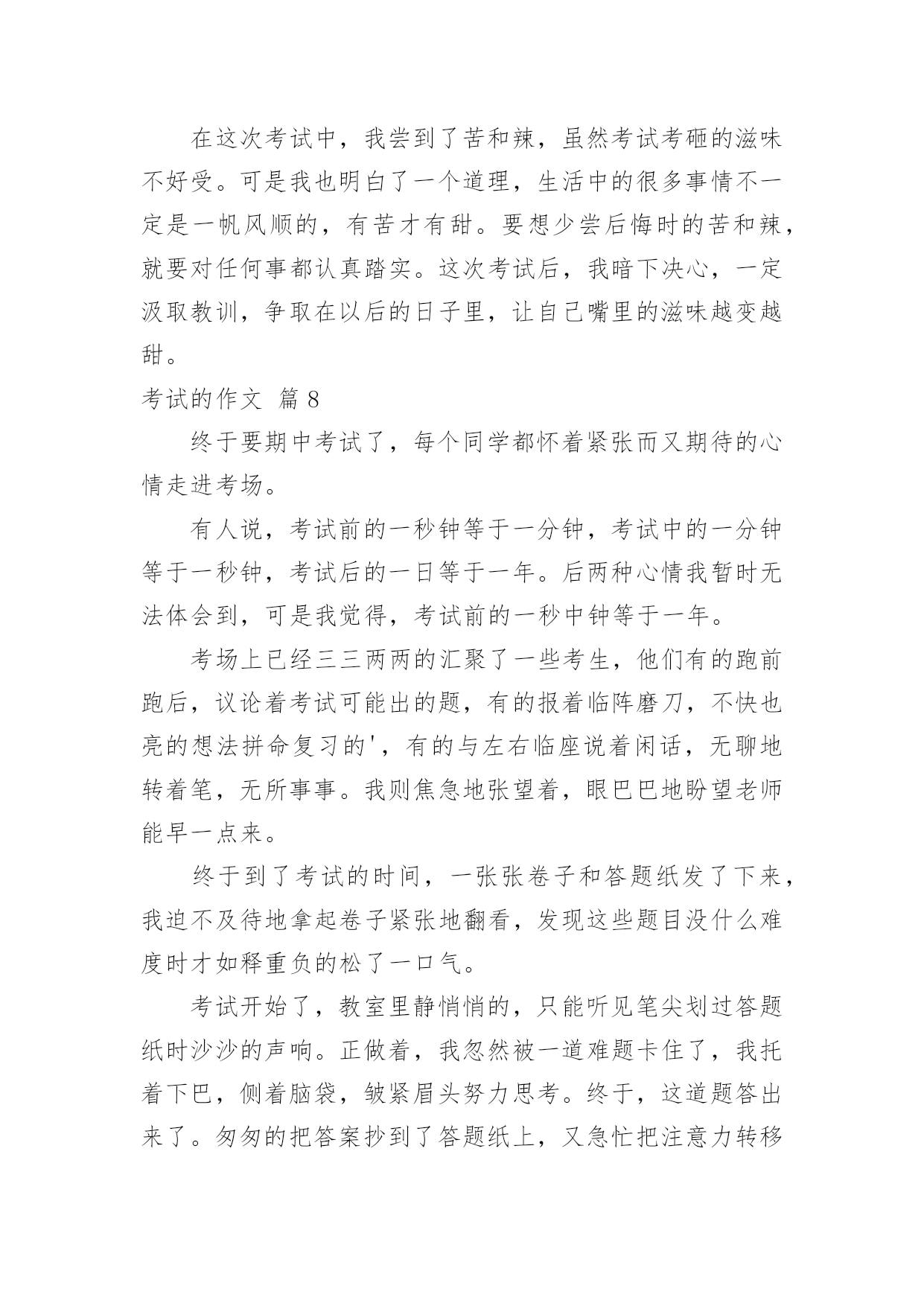 考试的作文考试的作文汇总9篇在平时的学习、工作或生活中,说到作文,大家肯定都不陌生吧,作文是人们以书面形式表情达意的言语活动。相信很多朋友都对写作文感到非常苦恼吧,以下是小编精心整理的考试的作文10篇,希望能够帮助到大家。考试的作文篇1星期二,我们考了英语,英语杨老师说这次我们的英语考试分为三部分,第一是读单词、听单词,第二是读课文签字,随意抽查一篇,第三是考一份试题,满分六十分,然后这三部分加起来试试这次的英语总分。今天我们考了英语同步学习与检测上的1~4单元测试,自我感觉还不错。到了星期三,一大早就开始考数学,从7:50开始考,到了离第一节课下课前5分钟的时候收卷。下午1:30到2:40,考语文,试题四面,再加一面作文稿纸。在考试的途中,我感觉时间过的飞快,一眨眼就又收卷了。到了星期四的下午,数学殷老师就看完卷子发卷了,那时我非常紧张,心怦怦直跳,但是当我的`卷子到我的手里时,心里的大石头就落地了,数学考得还凑副——96分。英语和语文都还没发,只能自己默默的祈祷考好分数。考试的作文篇2星期四和星期五,我们学校进行了全体学生的期中考试。考试时最紧张的的一次要数科学考试了。科学考试刚刚考,我就觉得这张试卷比平时文老师给我们做的试卷不一样。我觉得这张试卷的`难度是一般试卷的好几倍呢!我花了整整半小时的时间才做好整张试卷的三分之而已。当监考老师说在过十分钟就要交卷了。一听这话,我万分焦急,飞快地做试卷来。也许是因为焦急的缘故吧,我平时很快就能做好的题目,我也要想上半天才想出来。就到最后五分钟的时候,我还有最后一到简答题不会做。急得我像热锅上的蚂蚁在烧热的锅上团团转。就在这要紧时刻,我突然想起了以前文老师对我们说的话,文老师说我们在考试时要好好思考,遇到难的题目要冷静下来好好思考,那不论什么题目都能解决。于是我就冷静下来,开始好好思考起来。终于,我解决了试卷上最后的一道难题。我心事眈眈的把试卷交了上去。因为我在但心我填空题有三个小空格没有填好,我在想那三个小空格会被扣去几分。我这一次期中考试的成绩很不理想,但我相信我以后回加油的。考试的作文篇3老师曾说试卷上的考试是有形的,还有一种是无形的,它没有限制,不看分数,甚至没有评判标准。有一次,我就猝不及防地参加了一次无形的考试那次,我独自去考试,公交车上竟有空座位!我冲了过去,坐下之后暗暗庆幸。过了几站,我看见一位满脸沧桑的老奶奶走了过来,身穿不知什么颜色的衣服,那饱经风霜的'样子,一看就是早已品尝过生活的酸甜苦辣。车刚停稳,那位老奶奶就上了车,从口袋里摸出了一个皱皱巴巴的小包,从里面拿出了一块折得四四方方的手帕,又从里面掏出了一枚硬币塞进了投币箱里。几位年轻貌美的阿姨下意识地捂住了嘴,并向里面坐了坐。其中,有一位阿姨竟然戴上了口罩。老奶奶仿佛明白了什么,畏畏缩缩地站在了过道里。随着公交车的颠簸,身子摇来摇去,仿佛雨中的浮萍,我的心不由得揪了起来。“嘎——”公交车突然来了个急刹车,车上的乘客手忙脚乱,老爷爷也不例外,慌忙中,老奶奶抓住了一位阿姨的衣角,那位阿姨像避瘟神一样,拍打着衣角唯恐避之不及。老奶奶见状连跟那位阿姨道歉,并且又站回了过道里。我正准备起身却又迟疑了:应该刚才就站起来的……正当我胡思乱想时,又来一个急转弯老奶奶的拐杖甩了出去……我连忙站起来说:“老奶奶,您来这边坐。”老奶奶看了我一眼,随即坐了下来。“谢谢你啊,小朋友!”她笑咪咪地问我,“你要去哪里啊?”我回答道:“去考试。”老奶奶意味深长地说:“小朋友,无论你这一次考得怎么样,你都能通过……考试!”“啊?我通过了考试?”等我明白过来,我的脸比原来更红,我不好意思地低下了头。那次考试,我考得不错,但更高兴的是,我顺利地通过了无形的考试!考试的作文篇4我先把语文要背的内容背得滚瓜乱熟。我牢牢记住老师所说的这些话,句句记在我的'心里,俗话说:“好记性,不如青石板上刻道映。”所以呢,我把重要的内容写在草稿本上。复习的课上,薛老师那亲切的话语像清澈见底的湖水,滋润着我的心。数学宣老师上课,虽然对我们很严厉,但是我们知道老师在为我们好,让我们精益求精。每当我做作业、作复习卷时,笔尖“沙沙沙……”响,好象窗外的小鸟在对我说:“你不要怕困难,要勇攀知识的高峰!”这时,我记起了老师所说的一句话:“人要想学好,很难,必须发奋学习,人要想变坏,很容易,只要你整天贪玩,懒惰!”复习阶段,朗朗书声,从各个教室里传出来,像动人的童声大合唱,音符满天!同学们被老师所讲的课吸引住了,随着大家脸上的表情,时而神采飞扬,时而凝神深思,时而频频点头,时而低首微笑。同学们,要记牢,“书山有路勤为尽,学海无崖苦作舟!”考试的作文篇5我一向语文很好,可是这次鬼使神差的,语文竟然错了很多不该错的地方。经过我的仔细反思,我想这和我阅读题目不认真有着很大的关系。这点