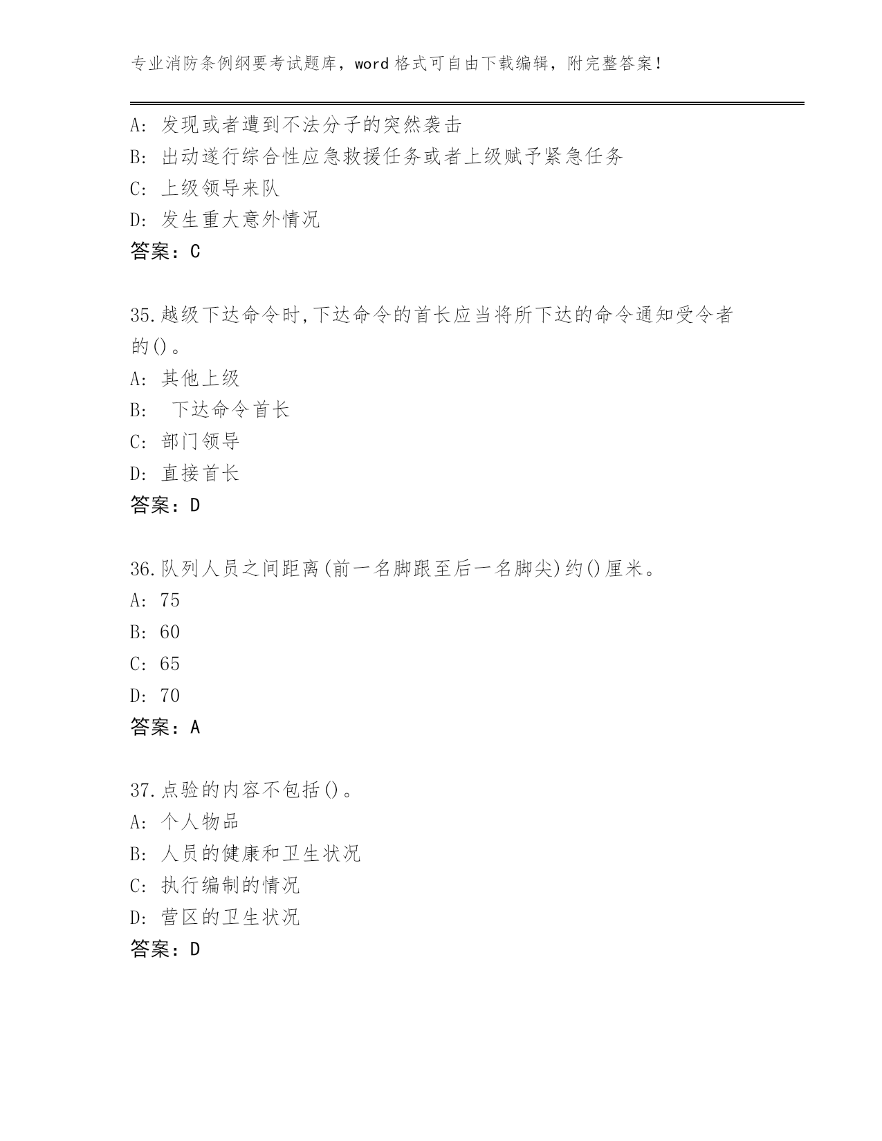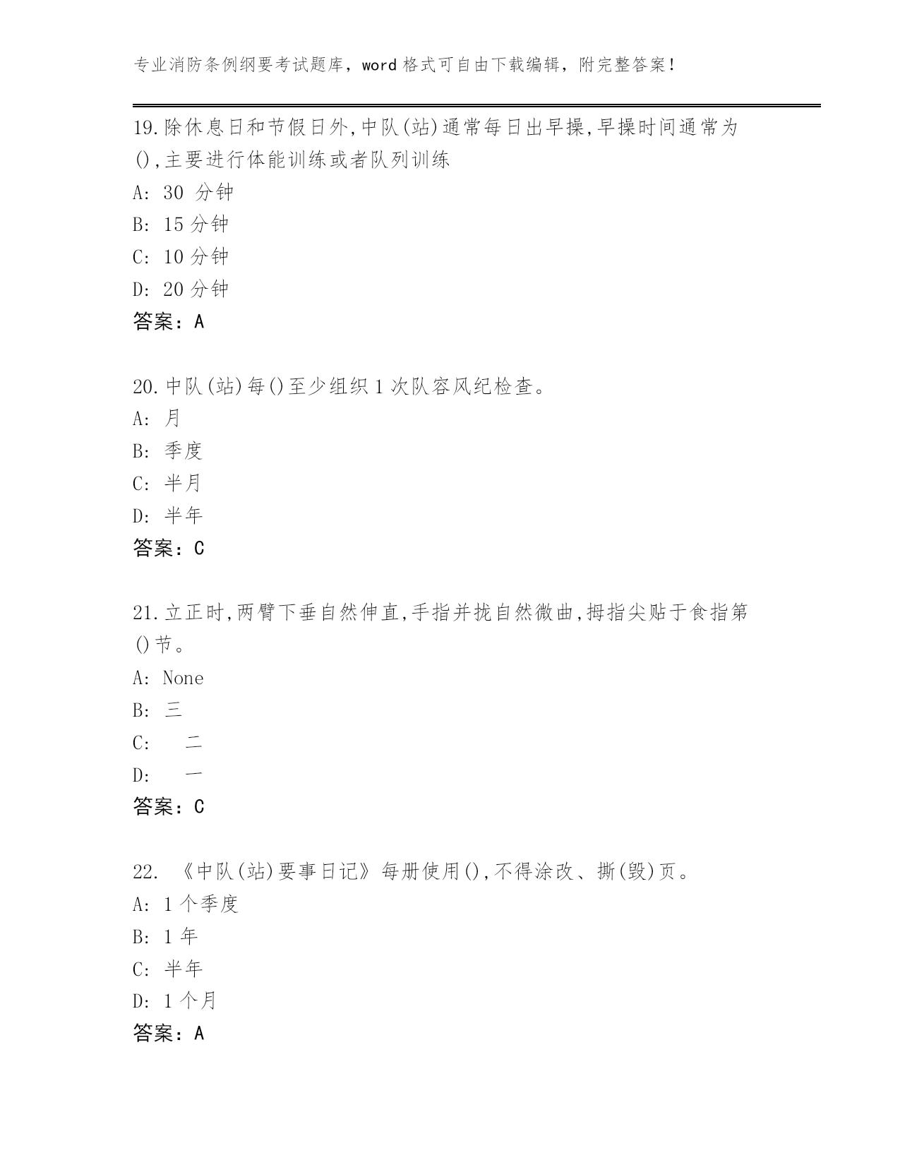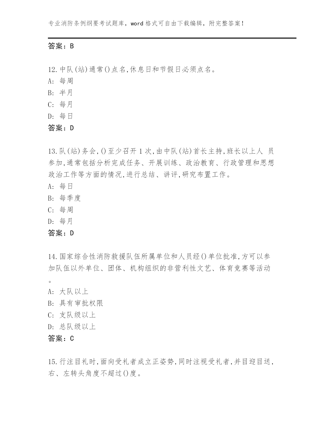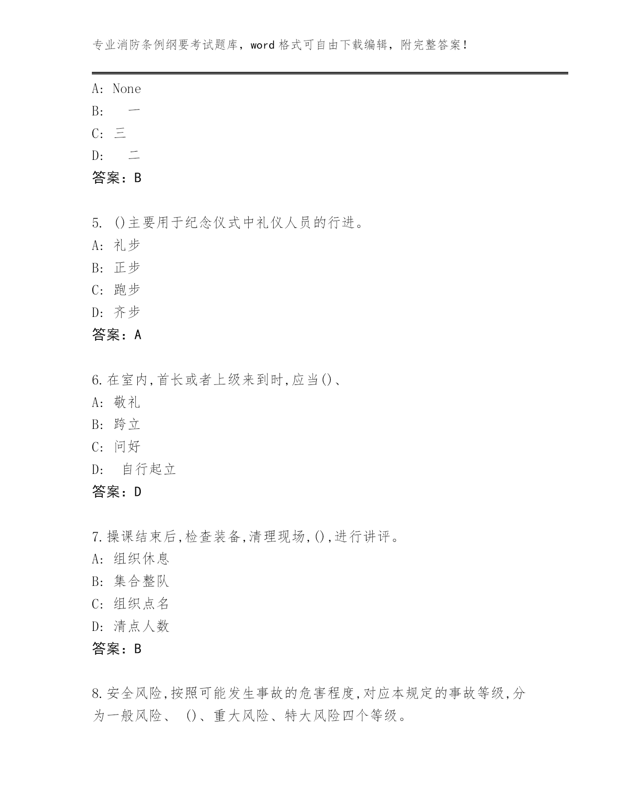 专业消防条例纲要考试题库,word格式可自由下载编辑,附完整答案!湖北省通城县2023-2024年消防条例纲要考试真题及答案【真题汇编】第I部分单选题(100题)1.对查出有疾病的消防救援人员应当(),不适宜继续工作的,及时报请有关部门按照规定退出国家综合性消防救援队伍。A:集中B:延时治疗C:隔离D:及时治疗答案:D2.()检查中队(站)的内务卫生。A:班长B:副班长C:中队(站)值班员D:指导员答案:C3.未指定负责人的,由()负责领导和指挥。A:行政职位高B:负责人C:首长D:上级答案:A4.跨立时,左脚向左跨出约()脚之长,两腿挺直。A:NoneB:一C:三D:二答案:B5.()主要用于纪念仪式中礼仪人员的行进。A:礼步B:正步C:跑步D:齐步答案:A6.在室内,首长或者上级来到时,应当()、A:敬礼B:跨立C:问好D:自行起立答案:D7.操课结束后,检查装备,清理现场,(),进行讲评。A:组织休息B:集合整队C:组织点名D:清点人数答案:B8.安全风险,按照可能发生事故的危害程度,对应本规定的事故等级,分为一般风险、()、重大风险、特大风险四个等级。A:重要风险B:严重风险C:轻微风险D:较大风险答案:D9.因集体活动超过熄灯时间()以上时,中队(站)首长可以确定推迟次日起床时间。A:1小时B:3小时C:半小时D:2小时答案:A10.除宣誓仪式、晋升(授予)消防救援衔仪式、授旗仪式等重要集体活动外,着制式服装进入室内通常(),按照规定放置,组织其他集体活动时可以()。A:自行脱帽统一脱帽B:统一脱帽自行脱帽C:统一脱帽统一脱帽D:自行脱帽自行脱帽答案:A11.国家综合性消防救援队伍的干部、消防员依据行政职务和消防救援衔级,构成()关系。A:平等B:首长与部属C:支援与被支援D:同志答案:B12.中队(站)通常()点名,休息日和节假日必须点名。A:每周B:半月C:每月D:每日答案:D13.队(站)务会,()至少召开1次,由中队(站)首长主持,班长以上人员参加,通常包括分析完成任务、开展训练、政治教育、行政管理和思想政治工作等方面的情况,进行总结、讲评,研究布置工作。A:每日B:每季度C:每周D:每月答案:D14.国家综合性消防救援队伍所属单位和人员经()单位批准,方可以参加队伍以外单位、团体、机构组织的非营利性文艺、体育竞赛等活动。A:大队以上B:具有审批权限C:支队级以上D:总队级以上答案:C15.行注目礼时,面向受礼者成立正姿势,同时注视受礼者,并目迎目送,右、左转头角度不超过()度。A:30B:15C:45D:60答案:C16.分队长对全分队的工作负()责任。A:全部B:完全C:部分D:第一答案:B17.对本单位无权决定或者无力解决的问题,应当及时向上级请示请示通常采取()或着()形式,逐级进行。A:书面,口头B:书面,会议C:短信、会议D:短信、口头答案:A18.中队(站)日常制度不包括()。A:汇报B:行政会议C:登记统计D:接待答案:A19.除休息日和节假日外,中队(站)通常每日出早操,早操时间通常为(),主要进行体能训练或者队列训练A:30分钟B:15分钟C:10分钟D:20分钟答案:A20.中队(站)每()至少组织1次队容风纪检查。A:月B:季度C:半月D:半年答案:C21.立正时,两臂下垂自然伸直,手指并拢自然微曲,拇指尖贴于食指第()节。A:NoneB:三C:二D:一答案:C22.《中队(站)要事日记》每册使用(),不得涂改、撕(毁)页。A:1个季度B:1年C:半年D:1个月答案:A23.消防救援人员,是指由()统一领导管理的国家综合性消防救援队伍在职人员及学员。A:应急管理部B:公安消防部队C:武警森林部队转制D:组建国家综合性消防救援队伍答案:A24.戴冬帽时,护脑下缘距眉约()。A:1厘米B:1.5厘米C:2厘米D:2.5厘米答案:B25.消防救援人员不论职位高低,在政治上一律平等,相互间是()关系。A:阶级B:同志C:战友D:朋友答案:B26.按照规定时间准时开饭。就餐时间通常不超过()。A:50分钟B:40分钟C:20分钟D:30分钟答案:D27.行进的()步法分为齐步、正步和跑步。A:辅助B:基本C:主要D:次要答案:B28.中队(站)横队,由各分队的横队依次向()并列组成。A:左B:前C:右