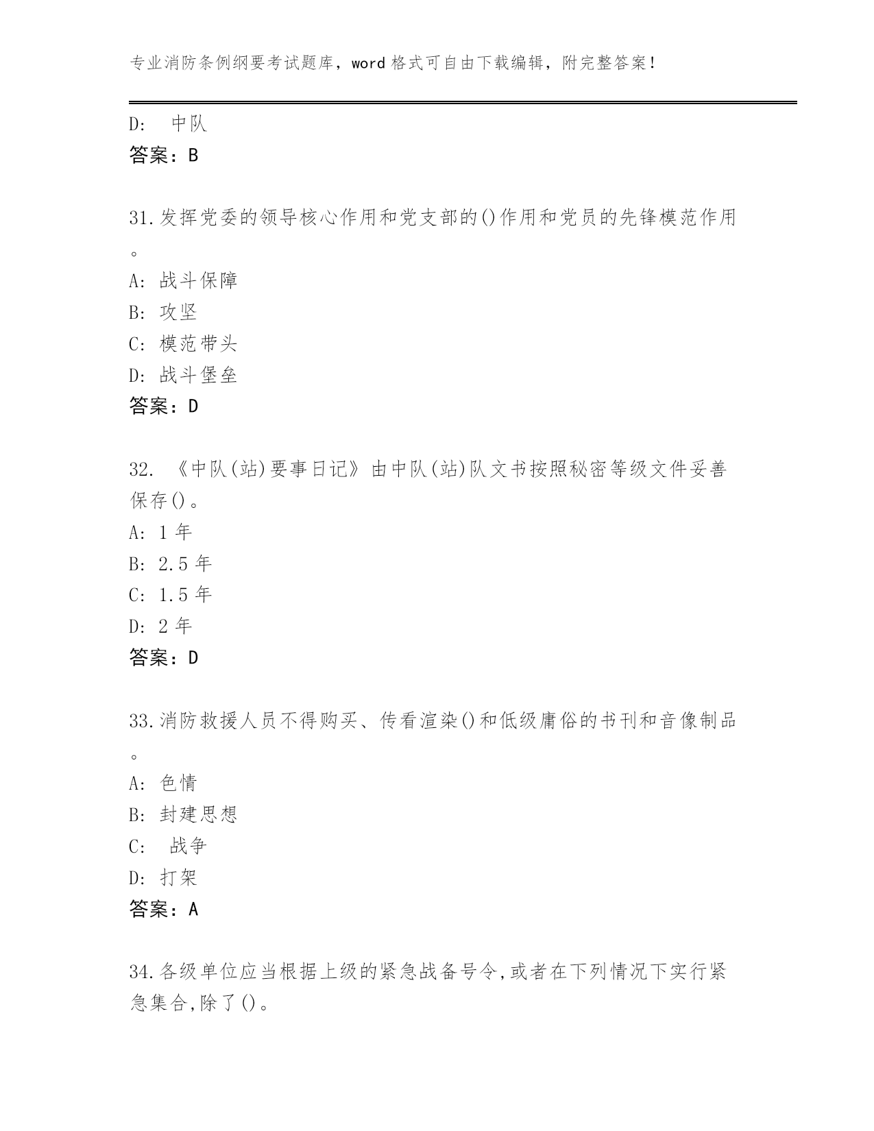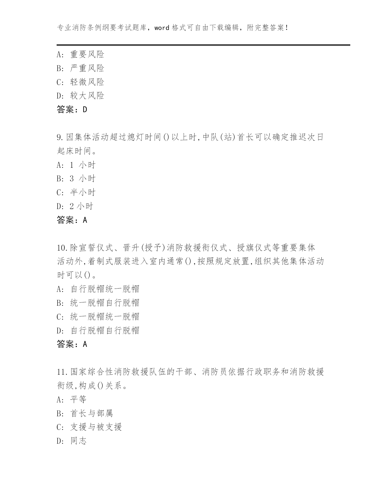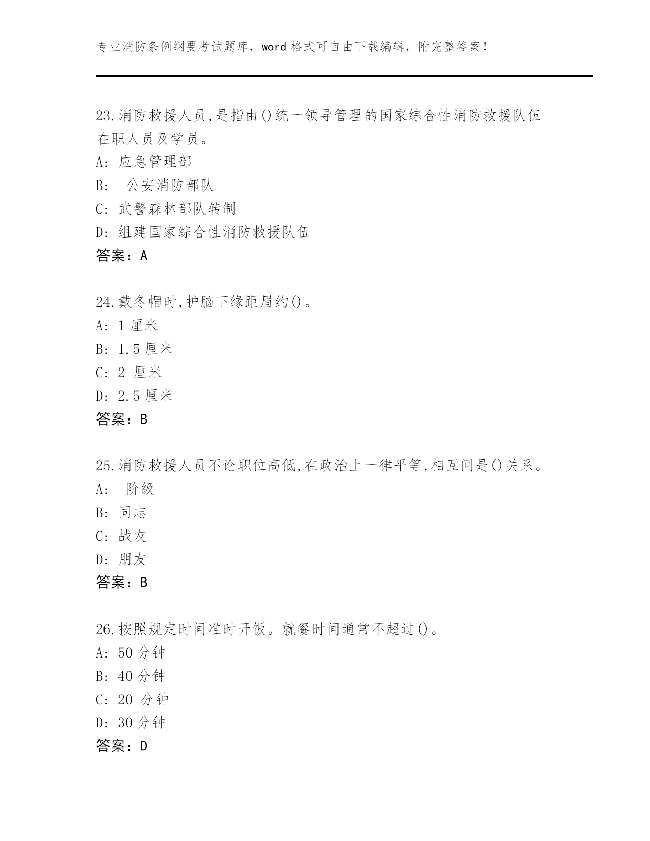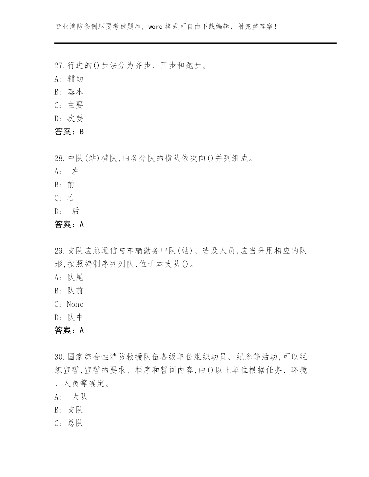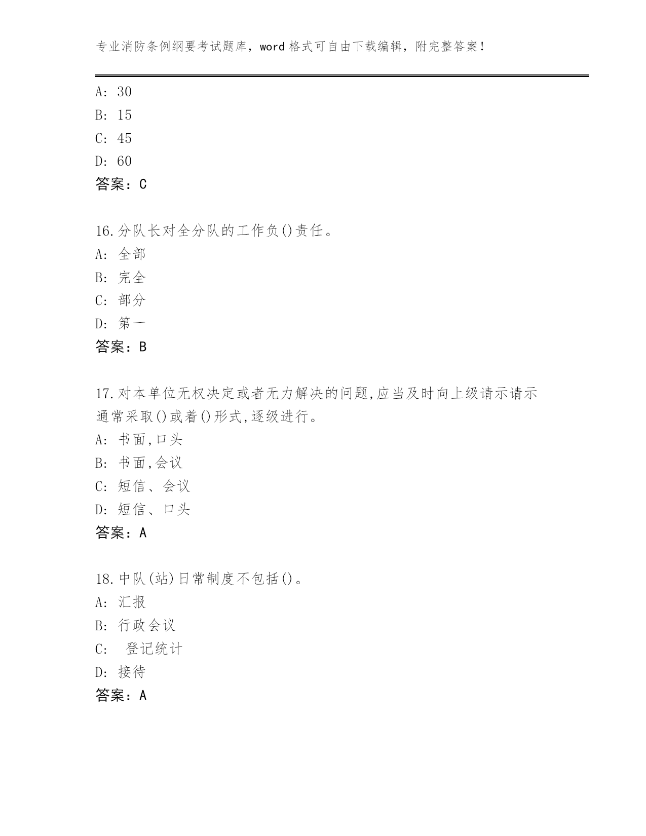 专业消防条例纲要考试题库,word格式可自由下载编辑,附完整答案!湖北省通城县2023-2024年消防条例纲要考试真题及答案【真题汇编】第I部分单选题(100题)1.对查出有疾病的消防救援人员应当(),不适宜继续工作的,及时报请有关部门按照规定退出国家综合性消防救援队伍。A:集中B:延时治疗C:隔离D:及时治疗答案:D2.()检查中队(站)的内务卫生。A:班长B:副班长C:中队(站)值班员D:指导员答案:C3.未指定负责人的,由()负责领导和指挥。A:行政职位高B:负责人C:首长D:上级答案:A4.跨立时,左脚向左跨出约()脚之长,两腿挺直。A:NoneB:一C:三D:二答案:B5.()主要用于纪念仪式中礼仪人员的行进。A:礼步B:正步C:跑步D:齐步答案:A6.在室内,首长或者上级来到时,应当()、A:敬礼B:跨立C:问好D:自行起立答案:D7.操课结束后,检查装备,清理现场,(),进行讲评。A:组织休息B:集合整队C:组织点名D:清点人数答案:B8.安全风险,按照可能发生事故的危害程度,对应本规定的事故等级,分为一般风险、()、重大风险、特大风险四个等级。A:重要风险B:严重风险C:轻微风险D:较大风险答案:D9.因集体活动超过熄灯时间()以上时,中队(站)首长可以确定推迟次日起床时间。A:1小时B:3小时C:半小时D:2小时答案:A10.除宣誓仪式、晋升(授予)消防救援衔仪式、授旗仪式等重要集体活动外,着制式服装进入室内通常(),按照规定放置,组织其他集体活动时可以()。A:自行脱帽统一脱帽B:统一脱帽自行脱帽C:统一脱帽统一脱帽D:自行脱帽自行脱帽答案:A11.国家综合性消防救援队伍的干部、消防员依据行政职务和消防救援衔级,构成()关系。A:平等B:首长与部属C:支援与被支援D:同志答案:B12.中队(站)通常()点名,休息日和节假日必须点名。A:每周B:半月C:每月D:每日答案:D13.队(站)务会,()至少召开1次,由中队(站)首长主持,班长以上人员参加,通常包括分析完成任务、开展训练、政治教育、行政管理和思想政治工作等方面的情况,进行总结、讲评,研究布置工作。A:每日B:每季度C:每周D:每月答案:D14.国家综合性消防救援队伍所属单位和人员经()单位批准,方可以参加队伍以外单位、团体、机构组织的非营利性文艺、体育竞赛等活动。A:大队以上B:具有审批权限C:支队级以上D:总队级以上答案:C15.行注目礼时,面向受礼者成立正姿势,同时注视受礼者,并目迎目送,右、左转头角度不超过()度。A:30B:15C:45D:60答案:C16.分队长对全分队的工作负()责任。A:全部B:完全C:部分D:第一答案:B17.对本单位无权决定或者无力解决的问题,应当及时向上级请示请示通常采取()或着()形式,逐级进行。A:书面,口头B:书面,会议C:短信、会议D:短信、口头答案:A18.中队(站)日常制度不包括()。A:汇报B:行政会议C:登记统计D:接待答案:A19.除休息日和节假日外,中队(站)通常每日出早操,早操时间通常为(),主要进行体能训练或者队列训练A:30分钟B:15分钟C:10分钟D:20分钟答案:A20.中队(站)每()至少组织1次队容风纪检查。A:月B:季度C:半月D:半年答案:C21.立正时,两臂下垂自然伸直,手指并拢自然微曲,拇指尖贴于食指第()节。A:NoneB:三C:二D:一答案:C22.《中队(站)要事日记》每册使用(),不得涂改、撕(毁)页。A:1个季度B:1年C:半年D:1个月答案:A23.消防救援人员,是指由()统一领导管理的国家综合性消防救援队伍在职人员及学员。A:应急管理部B:公安消防部队C:武警森林部队转制D:组建国家综合性消防救援队伍答案:A24.戴冬帽时,护脑下缘距眉约()。A:1厘米B:1.5厘米C:2厘米D:2.5厘米答案:B25.消防救援人员不论职位高低,在政治上一律平等,相互间是()关系。A:阶级B:同志C:战友D:朋友答案:B26.按照规定时间准时开饭。就餐时间通常不超过()。A:50分钟B:40分钟C:20分钟D:30分钟答案:D27.行进的()步法分为齐步、正步和跑步。A:辅助B:基本C:主要D:次要答案:B28.中队(站)横队,由各分队的横队依次向()并列组成。A:左B:前C:右