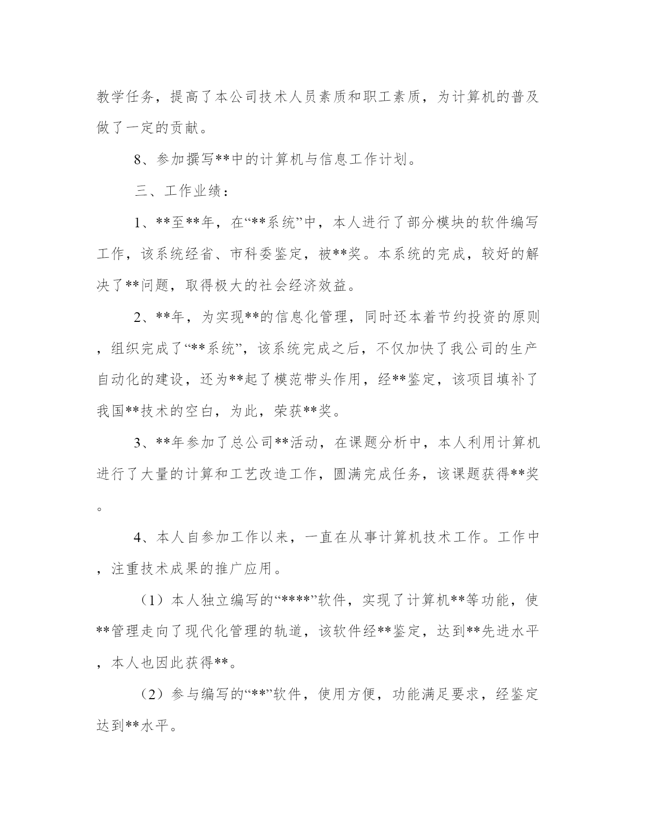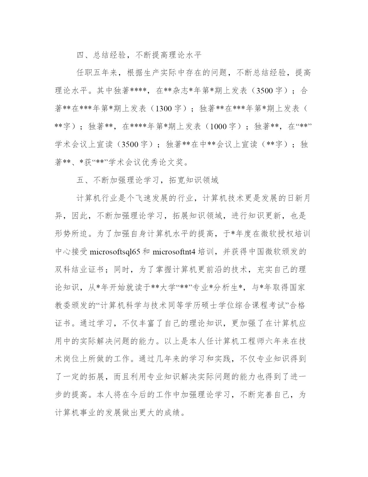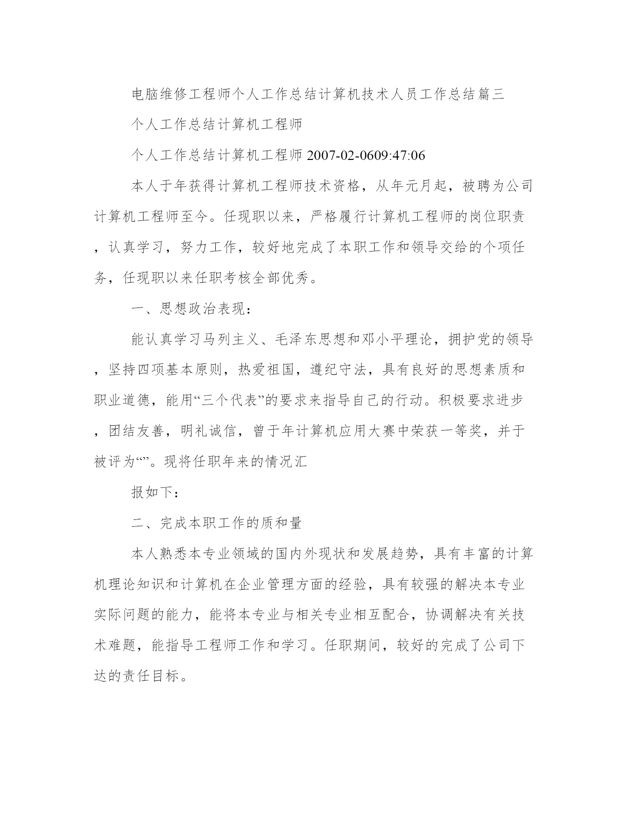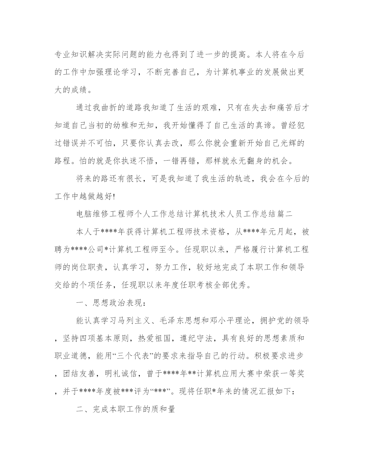 电脑维修工程师个人工作总结计算机技术人员工作总结(五篇)总结是对某一特定时间段内的学习和工作生活等表现情况加以回顾和分析的一种书面材料,它能够使头脑更加清醒,目标更加明确,让我们一起来学习写总结吧。那关于总结格式是怎样的呢?而个人总结又该怎么写呢?这里给大家分享一些最新的总结书范文,方便大家学习。电脑维修工程师个人工作总结计算机技术人员工作总结篇一首先是公司不要我,因为我的计算机能力达不到公司要求的水平,我游戏的本事很厉害,可是有什么用那,还不是一事无成!痛定思痛,我决定要不再游戏,认真学习我的计算机专业,我开始了专心致志的学习知识。终于我于****年获得计算机工程师技术资格,从****年元月起,被聘为****公司*计算机工程师至今。任现职以来,严格履行计算机工程师的岗位职责,认真学习,努力工作,较好地完成了本职工作和领导交给的个项任务,任现职以来任职考核全部优秀。一、思想政治表现能认真学习拥护党的领导,坚持四项基本原则,热爱祖国,遵纪守法,具有良好的思想素质和职业道德,能用“三个代表”的要求来指导自己的行动。积极要求进步,团结友善,明礼诚信,曾于**年**计算机应用大赛中荣获一等奖,并于**被***评为“***”。二、不断加强理论学习,拓宽知识领域计算机行业是个飞速发展的行业,计算机技术更是发展的日新月异,因此,不断加强理论学习,拓展知识领域,进行知识更新,也是形势所迫。为了加强自身计算机水平的提高,于*在微软授权培训中心接受microsoftsql65和microsoftnt4培训,并获得中国微软颁发的双科结业证书;同时,为了掌握计算机更前沿的技术,充实自己的理论知识,从*年开始就读于**大学“**”专业*分析生*,与*年取得国家教委颁发的“计算机科学与技术同等学历硕士学位综合课程考试”合格证书。通过学习,不仅丰富了自己的理论知识,更加强了在计算机应用中的实际解决问题的能力。三、完成本职工作的质和量本人熟悉本专业领域的国内外现状和发展趋势,具有丰富的计算机理论知识和计算机在企业管理方面的经验,具有较强的解决本专业实际问题的能力,能将本专业与相关专业相互配合,协调解决有关技术难题,能指导工程师工作和学习。任职期间,较好的完成了公司下达的责任目标。1、在*年至*年间,利用三年的时间,进行了**计算机网络综合管理系统的建设与实施工程,使**企业办公自动化以及生产调度自动化走向现代化的前沿。2、**至**年,先后为公司以及下属部门独立编制了**等具有本企业特色的软件。3、*年作为主要负责人之一完成了总公司的**管理信息系统,取得一定的社会和经济效益,使**服务上了一个新的台阶。4、参与完成了**项目。该项目投入使用后具有显著的经济效益,年节约资金**万元。5、主持完成了总公司**系统,实现**无纸化办公。6、任职期间,不仅建设了本公司的企业内部与互联网的网站,打开企业的知名度,同时还利用最新的asp等前沿技术协助***建立了“**网站”,使**迅速走向国际化的轨道,受到**的表彰。7、受**的委托,为部分技术人员和管理人员累计授课达***余课时,在授课过程中,自己能将理论结合实际,深入浅出,圆满完成了教学任务,提高了本公司技术人员素质和职工素质,为计算机的普及做了一定的贡献。8、参加撰写**中的计算机与信息工作计划。四、工作业绩1、**至**年,在“**系统”中,本人进行了部分模块的软件编写工作,该系统经省、市科委鉴定,被**奖。本系统的完成,较好的解决了**问题,取得极大的社会经济效益。2、**年,为实现**的信息化管理,同时还本着节约投资的原则,组织完成了“**系统”,该系统完成之后,不仅加快了我公司的生产自动化的建设,还为**起了模范带头作用,经**鉴定,该项目填补了我国**技术的空白,为此,荣获**奖。3、**年参加了总公司**活动,在课题分析中,本人利用计算机进行了大量的计算和工艺改造工作,圆满完成任务,该课题获得**奖。4、本人自参加工作以来,一直在从事计算机技术工作。工作中,注重技术成果的推广应用。(1)本人独立编写的“****”软件,实现了计算机**等功能,使**管理走向了现代化管理的轨道,该软件经**鉴定,达到**先进水平,本人也因此获得**。(2)参与编写的“**”软件,使用方便,功能满足要求,经鉴定达到**水平。五、总结经验,不断提高理论水平任职五年来,根据生产实际中存在的问题,不断总结经验,提高理论水平。其中独著****,在**杂志*年第*期上发表(3500字);合著**在***年第*期上发表(1300字);独著**在***年第*期上发表(**字);独著**,在****年第*期上发表(1000字);独著**,在“**”学术会议上宣读(3500字);独著