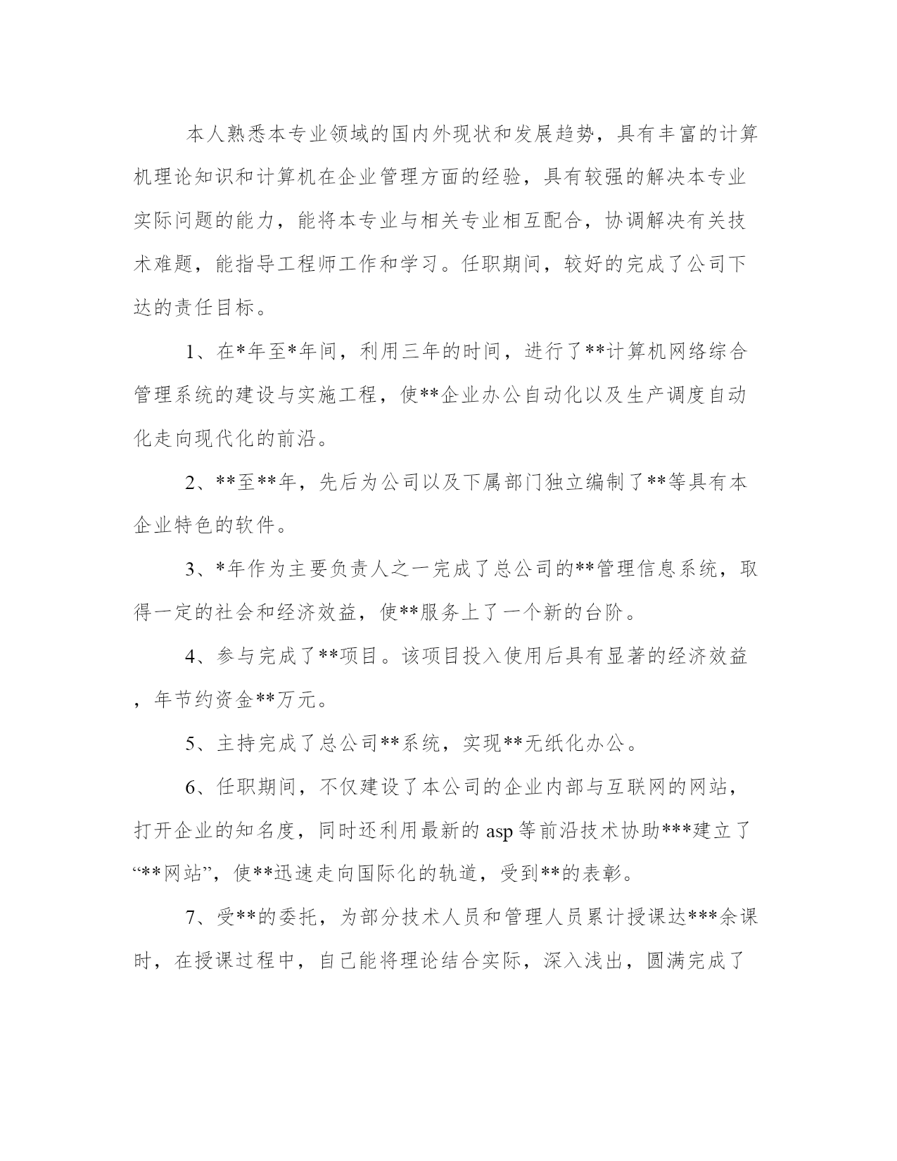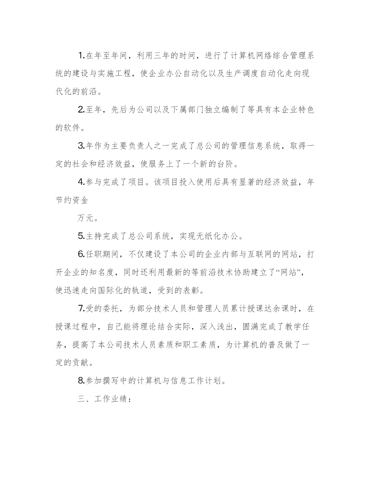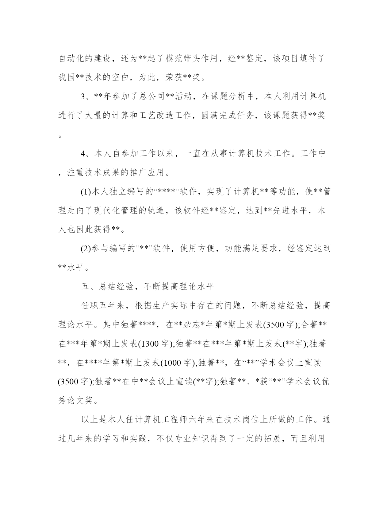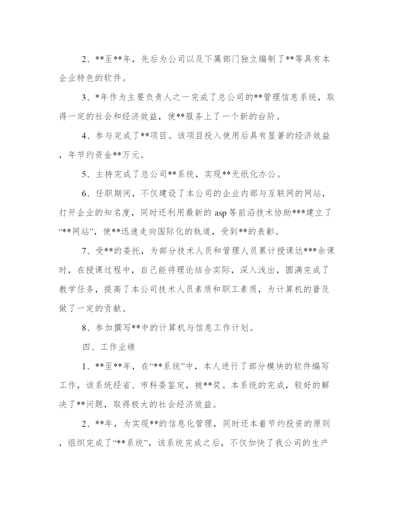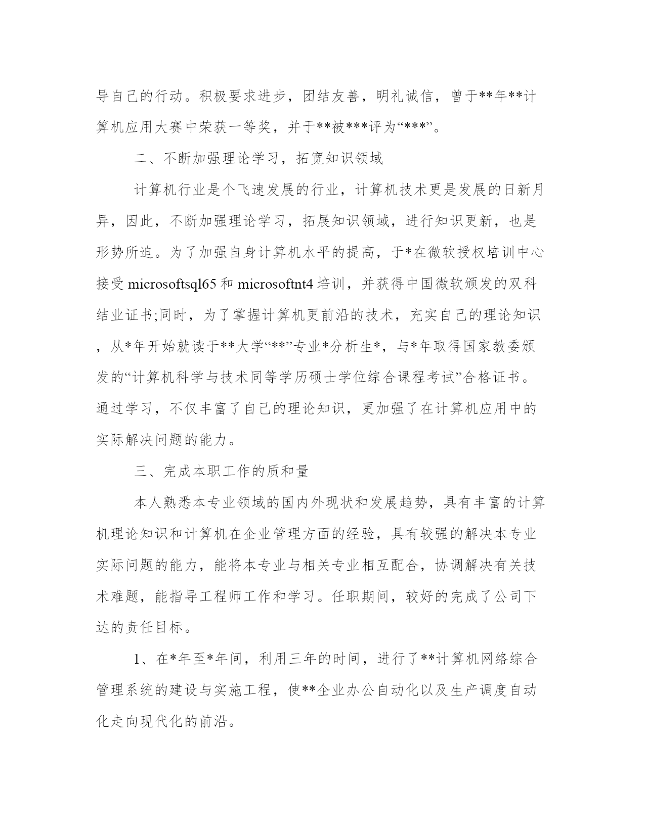 电脑维修工程师个人工作总结计算机技术人员工作总结(五篇)总结是对某一特定时间段内的学习和工作生活等表现情况加以回顾和分析的一种书面材料,它能够使头脑更加清醒,目标更加明确,让我们一起来学习写总结吧。那关于总结格式是怎样的呢?而个人总结又该怎么写呢?这里给大家分享一些最新的总结书范文,方便大家学习。电脑维修工程师个人工作总结计算机技术人员工作总结篇一首先是公司不要我,因为我的计算机能力达不到公司要求的水平,我游戏的本事很厉害,可是有什么用那,还不是一事无成!痛定思痛,我决定要不再游戏,认真学习我的计算机专业,我开始了专心致志的学习知识。终于我于****年获得计算机工程师技术资格,从****年元月起,被聘为****公司*计算机工程师至今。任现职以来,严格履行计算机工程师的岗位职责,认真学习,努力工作,较好地完成了本职工作和领导交给的个项任务,任现职以来任职考核全部优秀。一、思想政治表现能认真学习拥护党的领导,坚持四项基本原则,热爱祖国,遵纪守法,具有良好的思想素质和职业道德,能用“三个代表”的要求来指导自己的行动。积极要求进步,团结友善,明礼诚信,曾于**年**计算机应用大赛中荣获一等奖,并于**被***评为“***”。二、不断加强理论学习,拓宽知识领域计算机行业是个飞速发展的行业,计算机技术更是发展的日新月异,因此,不断加强理论学习,拓展知识领域,进行知识更新,也是形势所迫。为了加强自身计算机水平的提高,于*在微软授权培训中心接受microsoftsql65和microsoftnt4培训,并获得中国微软颁发的双科结业证书;同时,为了掌握计算机更前沿的技术,充实自己的理论知识,从*年开始就读于**大学“**”专业*分析生*,与*年取得国家教委颁发的“计算机科学与技术同等学历硕士学位综合课程考试”合格证书。通过学习,不仅丰富了自己的理论知识,更加强了在计算机应用中的实际解决问题的能力。三、完成本职工作的质和量本人熟悉本专业领域的国内外现状和发展趋势,具有丰富的计算机理论知识和计算机在企业管理方面的经验,具有较强的解决本专业实际问题的能力,能将本专业与相关专业相互配合,协调解决有关技术难题,能指导工程师工作和学习。任职期间,较好的完成了公司下达的责任目标。1、在*年至*年间,利用三年的时间,进行了**计算机网络综合管理系统的建设与实施工程,使**企业办公自动化以及生产调度自动化走向现代化的前沿。2、**至**年,先后为公司以及下属部门独立编制了**等具有本企业特色的软件。3、*年作为主要负责人之一完成了总公司的**管理信息系统,取得一定的社会和经济效益,使**服务上了一个新的台阶。4、参与完成了**项目。该项目投入使用后具有显著的经济效益,年节约资金**万元。5、主持完成了总公司**系统,实现**无纸化办公。6、任职期间,不仅建设了本公司的企业内部与互联网的网站,打开企业的知名度,同时还利用最新的asp等前沿技术协助***建立了“**网站”,使**迅速走向国际化的轨道,受到**的表彰。7、受**的委托,为部分技术人员和管理人员累计授课达***余课时,在授课过程中,自己能将理论结合实际,深入浅出,圆满完成了教学任务,提高了本公司技术人员素质和职工素质,为计算机的普及做了一定的贡献。8、参加撰写**中的计算机与信息工作计划。四、工作业绩1、**至**年,在“**系统”中,本人进行了部分模块的软件编写工作,该系统经省、市科委鉴定,被**奖。本系统的完成,较好的解决了**问题,取得极大的社会经济效益。2、**年,为实现**的信息化管理,同时还本着节约投资的原则,组织完成了“**系统”,该系统完成之后,不仅加快了我公司的生产自动化的建设,还为**起了模范带头作用,经**鉴定,该项目填补了我国**技术的空白,为此,荣获**奖。3、**年参加了总公司**活动,在课题分析中,本人利用计算机进行了大量的计算和工艺改造工作,圆满完成任务,该课题获得**奖。4、本人自参加工作以来,一直在从事计算机技术工作。工作中,注重技术成果的推广应用。(1)本人独立编写的“****”软件,实现了计算机**等功能,使**管理走向了现代化管理的轨道,该软件经**鉴定,达到**先进水平,本人也因此获得**。(2)参与编写的“**”软件,使用方便,功能满足要求,经鉴定达到**水平。五、总结经验,不断提高理论水平任职五年来,根据生产实际中存在的问题,不断总结经验,提高理论水平。其中独著****,在**杂志*年第*期上发表(3500字);合著**在***年第*期上发表(1300字);独著**在***年第*期上发表(**字);独著**,在****年第*期上发表(1000字);独著**,在“**”学术会议上宣读(3500字);独著