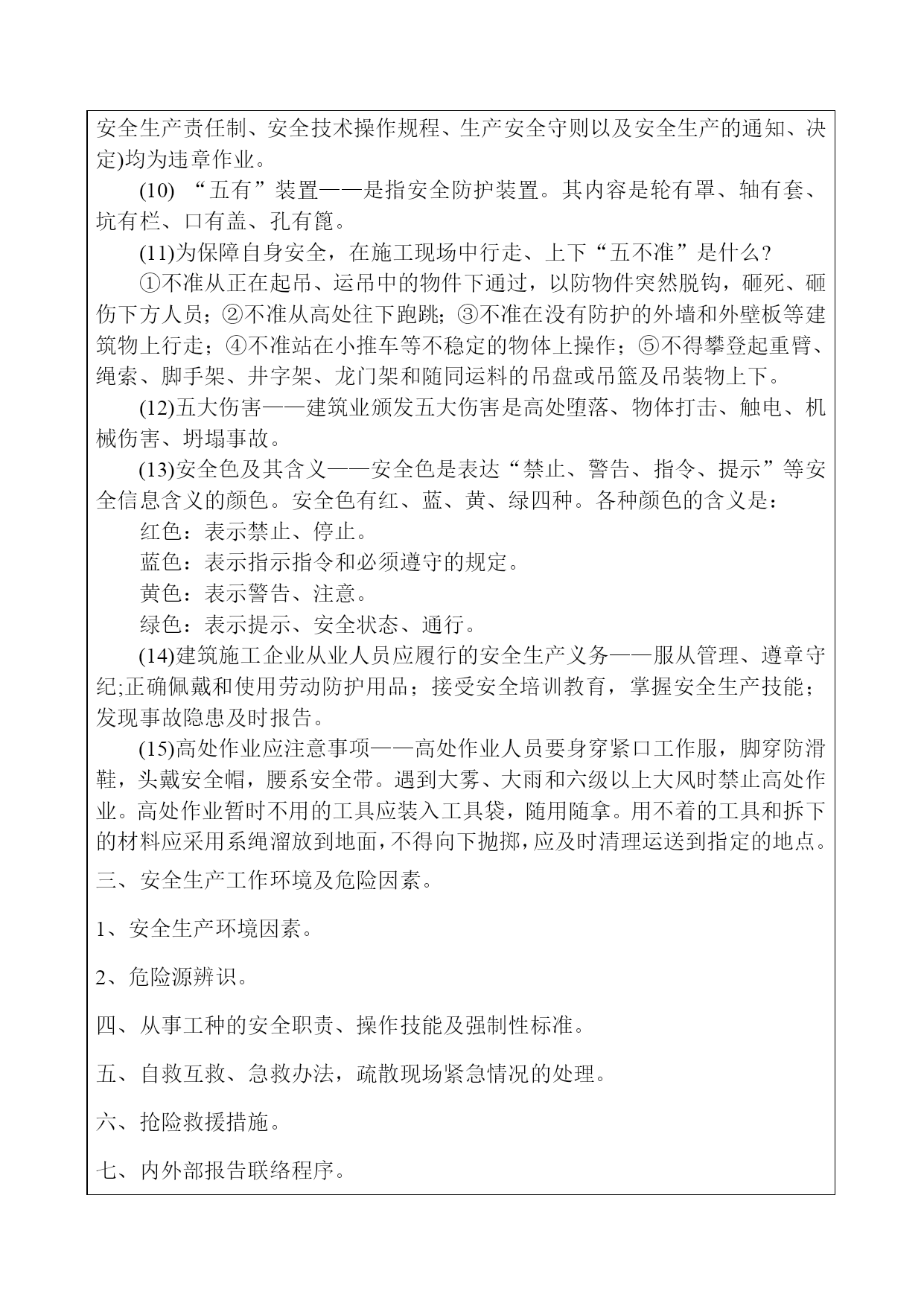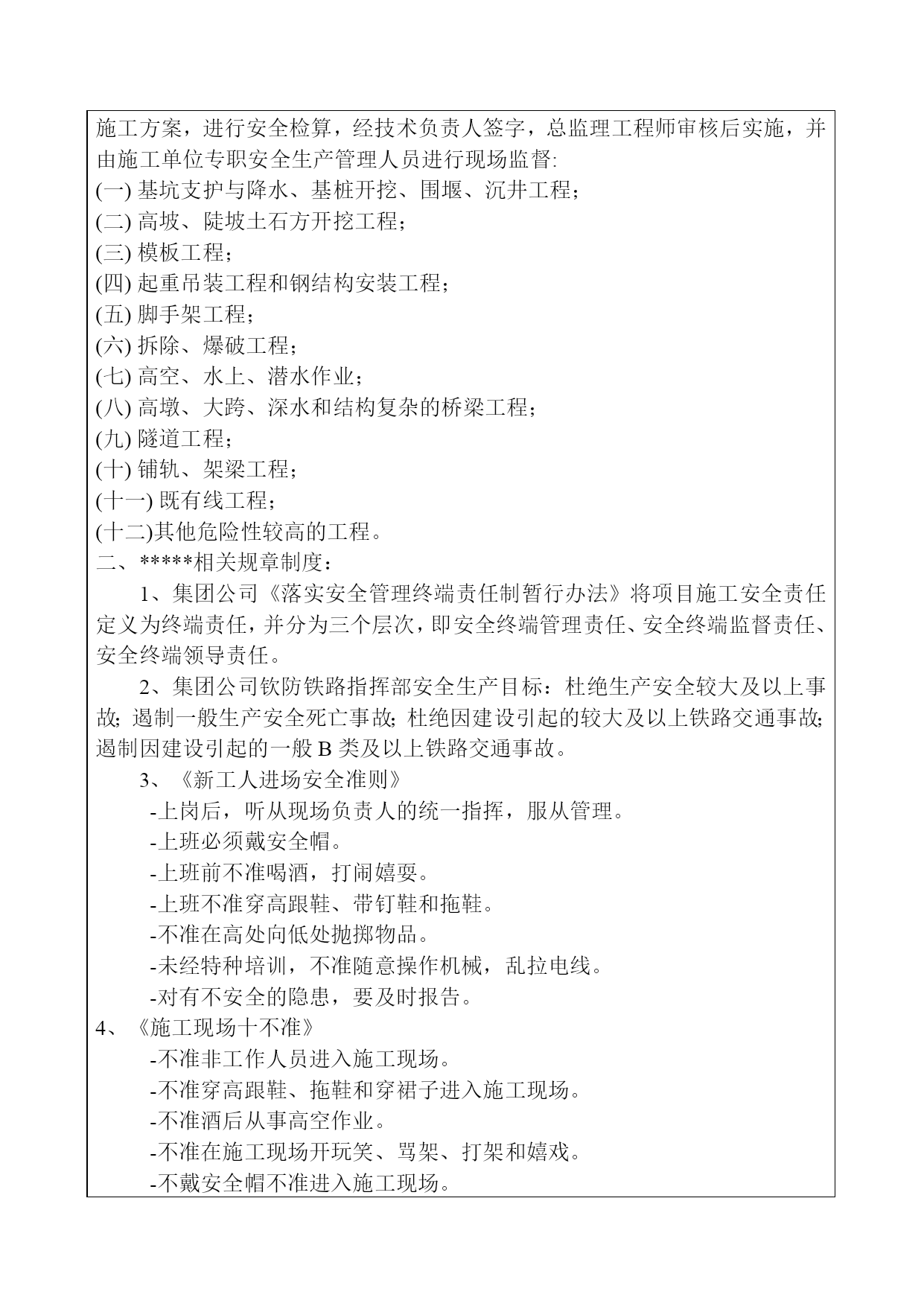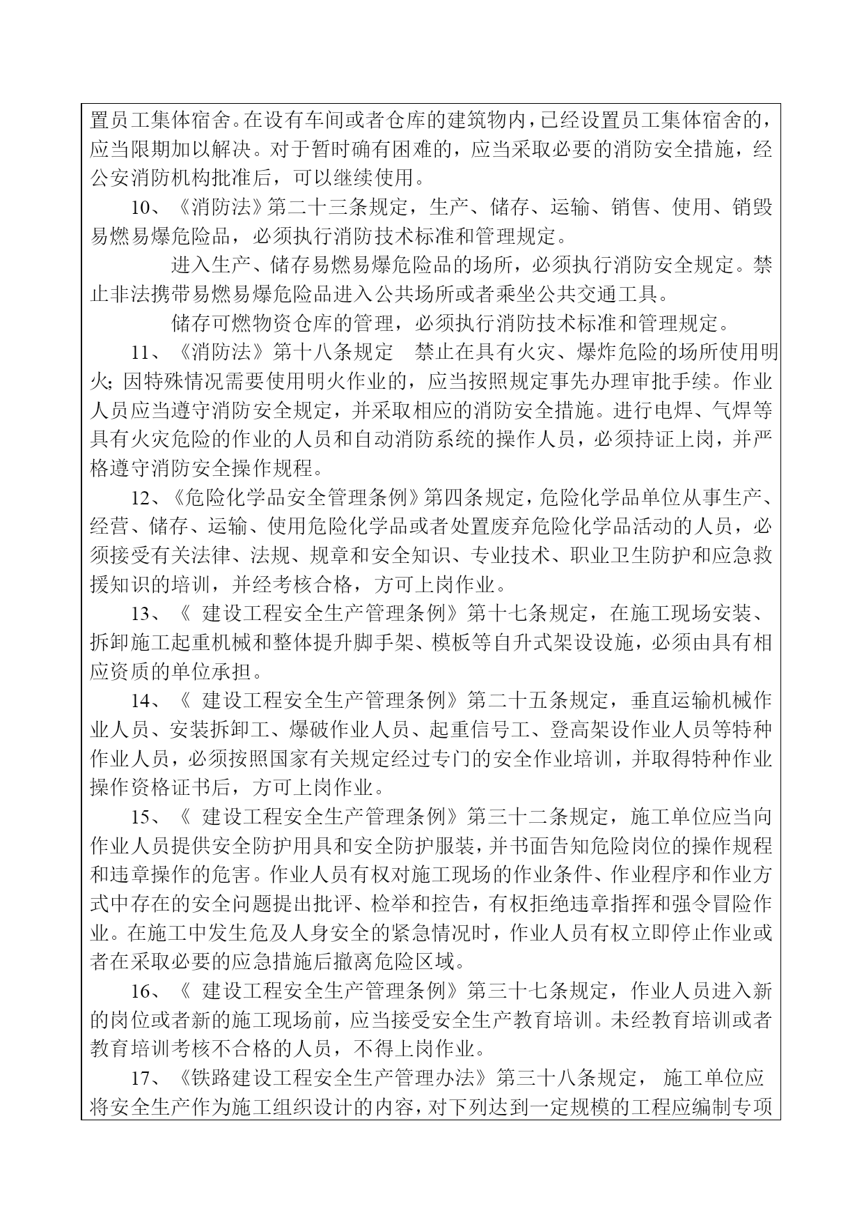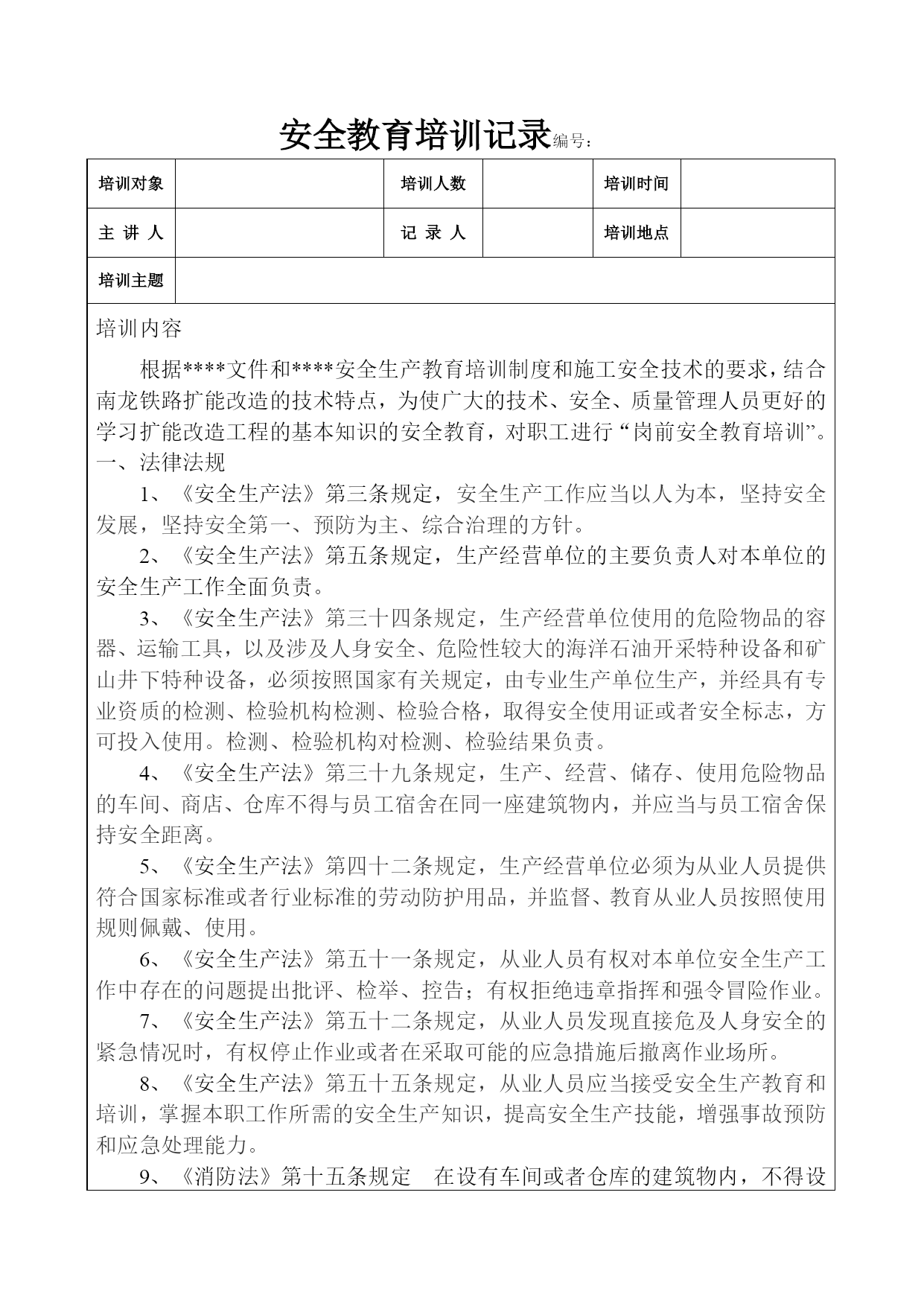 岗前安全培训记录最新文档(可以直接使用,可编辑最新文档,欢迎下载)安全教育培训记录编号:培训对象培训人数培训时间主讲人记录人培训地点培训主题培训内容根据****文件和****安全生产教育培训制度和施工安全技术的要求,结合南龙铁路扩能改造的技术特点,为使广大的技术、安全、质量管理人员更好的学习扩能改造工程的基本知识的安全教育,对职工进行“岗前安全教育培训”。一、法律法规1、《安全生产法》第三条规定,安全生产工作应当以人为本,坚持安全发展,坚持安全第一、预防为主、综合治理的方针。2、《安全生产法》第五条规定,生产经营单位的主要负责人对本单位的安全生产工作全面负责。3、《安全生产法》第三十四条规定,生产经营单位使用的危险物品的容器、运输工具,以及涉及人身安全、危险性较大的海洋石油开采特种设备和矿山井下特种设备,必须按照国家有关规定,由专业生产单位生产,并经具有专业资质的检测、检验机构检测、检验合格,取得安全使用证或者安全标志,方可投入使用。检测、检验机构对检测、检验结果负责。4、《安全生产法》第三十九条规定,生产、经营、储存、使用危险物品的车间、商店、仓库不得与员工宿舍在同一座建筑物内,并应当与员工宿舍保持安全距离。5、《安全生产法》第四十二条规定,生产经营单位必须为从业人员提供符合国家标准或者行业标准的劳动防护用品,并监督、教育从业人员按照使用规则佩戴、使用。6、《安全生产法》第五十一条规定,从业人员有权对本单位安全生产工作中存在的问题提出批评、检举、控告;有权拒绝违章指挥和强令冒险作业。7、《安全生产法》第五十二条规定,从业人员发现直接危及人身安全的紧急情况时,有权停止作业或者在采取可能的应急措施后撤离作业场所。8、《安全生产法》第五十五条规定,从业人员应当接受安全生产教育和培训,掌握本职工作所需的安全生产知识,提高安全生产技能,增强事故预防和应急处理能力。9、《消防法》第十五条规定在设有车间或者仓库的建筑物内,不得设置员工集体宿舍。在设有车间或者仓库的建筑物内,已经设置员工集体宿舍的,应当限期加以解决。对于暂时确有困难的,应当采取必要的消防安全措施,经公安消防机构批准后,可以继续使用。10、《消防法》第二十三条规定,生产、储存、运输、销售、使用、销毁易燃易爆危险品,必须执行消防技术标准和管理规定。进入生产、储存易燃易爆危险品的场所,必须执行消防安全规定。禁止非法携带易燃易爆危险品进入公共场所或者乘坐公共交通工具。储存可燃物资仓库的管理,必须执行消防技术标准和管理规定。11、《消防法》第十八条规定禁止在具有火灾、爆炸危险的场所使用明火;因特殊情况需要使用明火作业的,应当按照规定事先办理审批手续。作业人员应当遵守消防安全规定,并采取相应的消防安全措施。进行电焊、气焊等具有火灾危险的作业的人员和自动消防系统的操作人员,必须持证上岗,并严格遵守消防安全操作规程。12、《危险化学品安全管理条例》第四条规定,危险化学品单位从事生产、经营、储存、运输、使用危险化学品或者处置废弃危险化学品活动的人员,必须接受有关法律、法规、规章和安全知识、专业技术、职业卫生防护和应急救援知识的培训,并经考核合格,方可上岗作业。13、《建设工程安全生产管理条例》第十七条规定,在施工现场安装、拆卸施工起重机械和整体提升脚手架、模板等自升式架设设施,必须由具有相应资质的单位承担。14、《建设工程安全生产管理条例》第二十五条规定,垂直运输机械作业人员、安装拆卸工、爆破作业人员、起重信号工、登高架设作业人员等特种作业人员,必须按照国家有关规定经过专门的安全作业培训,并取得特种作业操作资格证书后,方可上岗作业。15、《建设工程安全生产管理条例》第三十二条规定,施工单位应当向作业人员提供安全防护用具和安全防护服装,并书面告知危险岗位的操作规程和违章操作的危害。作业人员有权对施工现场的作业条件、作业程序和作业方式中存在的安全问题提出批评、检举和控告,有权拒绝违章指挥和强令冒险作业。在施工中发生危及人身安全的紧急情况时,作业人员有权立即停止作业或者在采取必要的应急措施后撤离危险区域。16、《建设工程安全生产管理条例》第三十七条规定,作业人员进入新的岗位或者新的施工现场前,应当接受安全生产教育培训。未经教育培训或者教育培训考核不合格的人员,不得上岗作业。17、《铁路建设工程安全生产管理办法》第三十八条规定,施工单位应将安全生产作为施工组织设计的内容,对下列达到一定规模的工程应编制专项施工方案,进行安全检算,经技术负责人签字,总监理工程师审核后实施,并由施工单位专职安全生产管理人员进行现场监督:(一)基坑支护与降水、基桩开挖、围堰、沉井工程;(二)高坡、陡坡土石方开挖工程;(三)模板工程;(四)起重吊装工程和钢结构安装工程;(五)脚手架