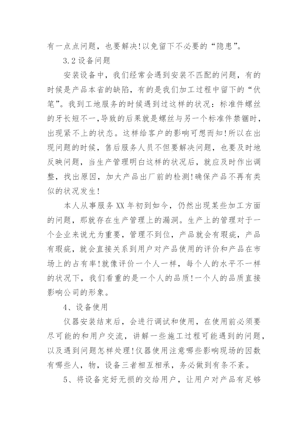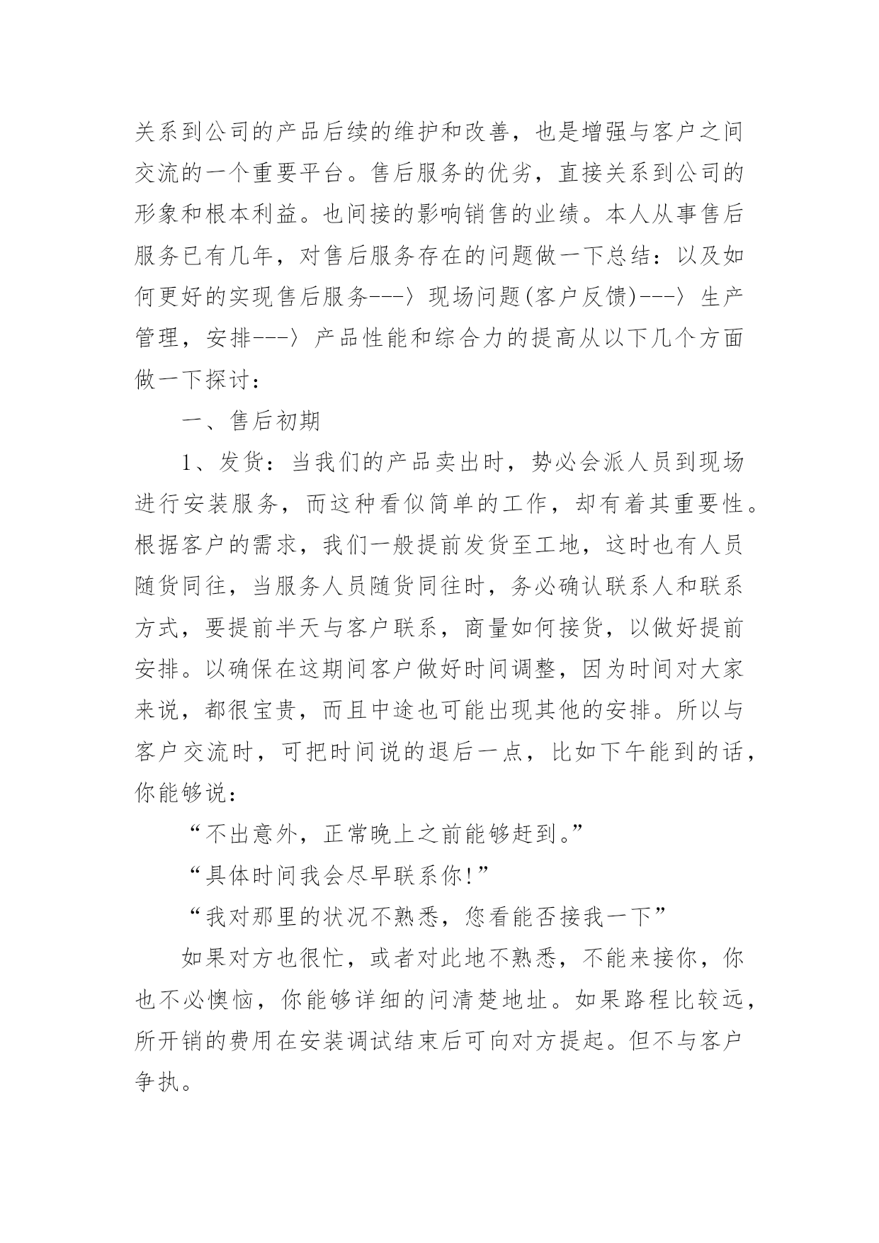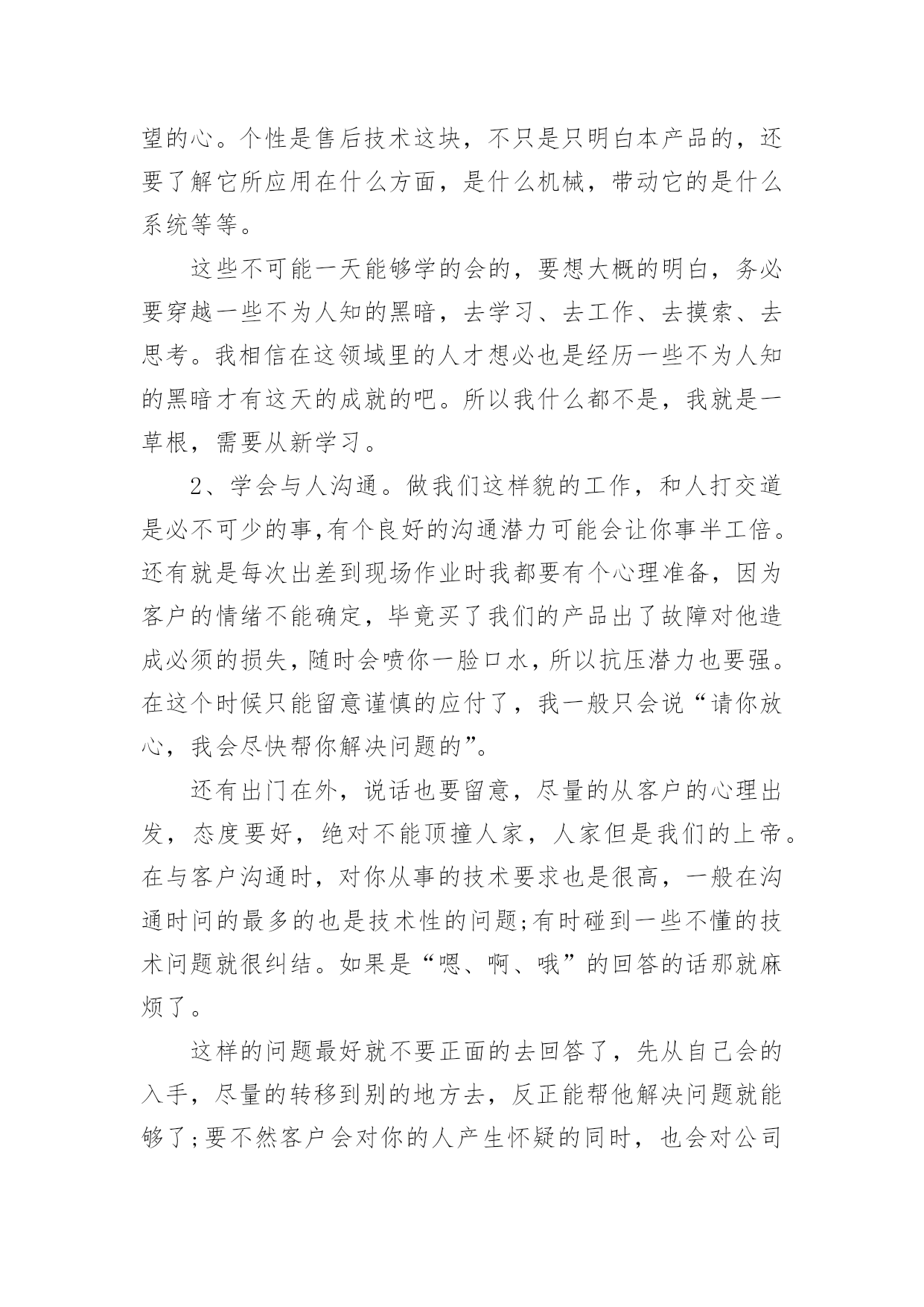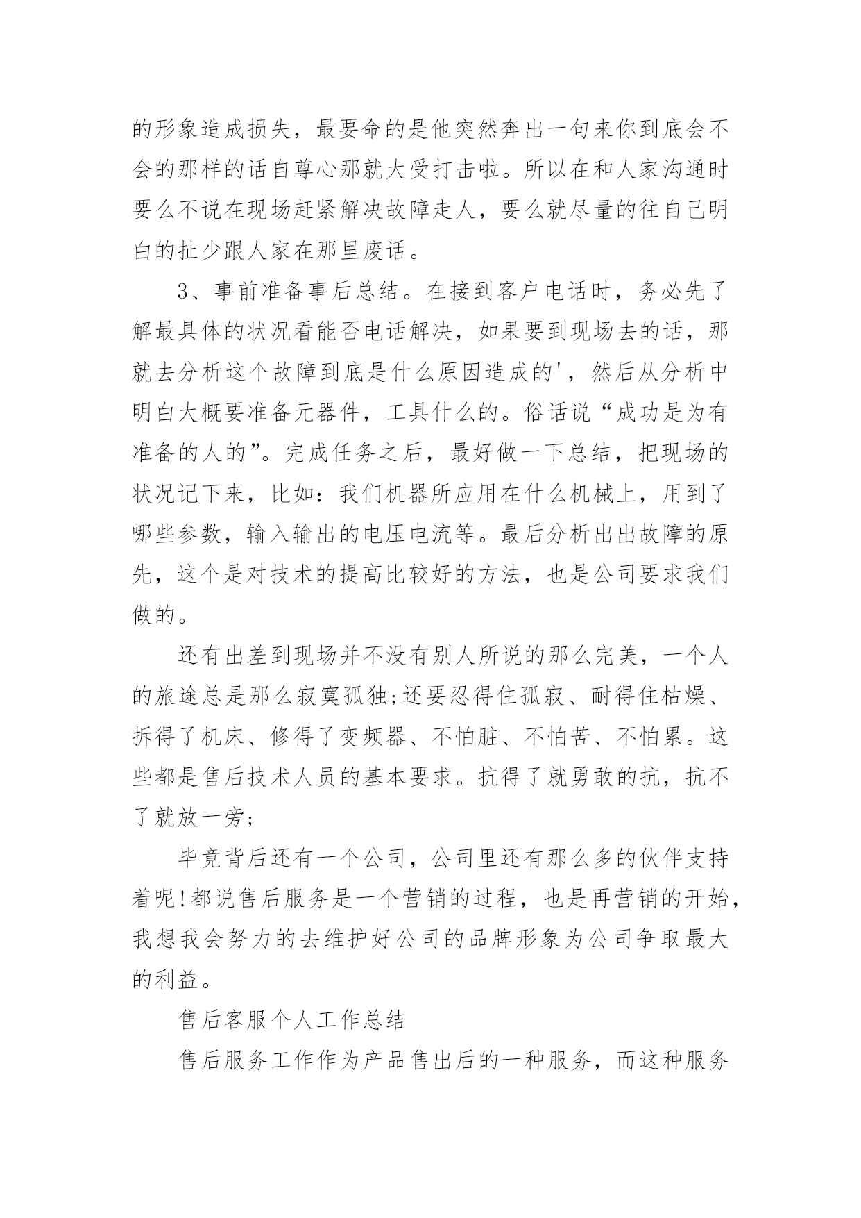 售后工作总结总结是对某一阶段的工作、学习或思想中的经验或情况进行分析研究的书面材料,它可以提升我们发现问题的能力,让我们抽出时间写写总结吧。总结怎么写才不会流于形式呢?以下是小编帮大家整理的售后工作总结,欢迎阅读,希望大家能够喜欢。售后工作总结1成为XX电器公司的售后服务的技术人员,以来,我努力工作,完成了全年任何。此刻对一年来的工作总结如下:1、学好本专业的技术。无论从事什么样的工作,专业技术永远是立足之本。作为售后技术这一块虽说不必须要求的技术要跟研发人员的那么高,但是最基本的也要明白。起码客户问起来你能够立马回答得出并帮忙他们很好的解决问题。一开始我老是说工资怎样那么低,但是此刻想起来也就释然了,就算是有一万块的月薪放在那里,你拿什么来换。出来之前还满怀信心的,但是接触几次之后就发现自己太稚嫩了,有时很想回去,但是想想又不甘心,我不能灰溜溜的回去要有所得才行。所以很感悟,学好技术是重中之重,先立足,在讲发展,可持续发展。打扎实基建,才能建得起高楼大夏。但是,这些工控自动化产品的技术要想学好也不是那么的容易,很枯燥,涉及的很广泛,还务必有一个对技术有欲望的心。个性是售后技术这块,不只是只明白本产品的,还要了解它所应用在什么方面,是什么机械,带动它的是什么系统等等。这些不可能一天能够学的会的,要想大概的明白,务必要穿越一些不为人知的黑暗,去学习、去工作、去摸索、去思考。我相信在这领域里的人才想必也是经历一些不为人知的黑暗才有这天的成就的吧。所以我什么都不是,我就是一草根,需要从新学习。2、学会与人沟通。做我们这样貌的工作,和人打交道是必不可少的事,有个良好的沟通潜力可能会让你事半工倍。还有就是每次出差到现场作业时我都要有个心理准备,因为客户的情绪不能确定,毕竟买了我们的产品出了故障对他造成必须的损失,随时会喷你一脸口水,所以抗压潜力也要强。在这个时候只能留意谨慎的应付了,我一般只会说“请你放心,我会尽快帮你解决问题的”。还有出门在外,说话也要留意,尽量的从客户的心理出发,态度要好,绝对不能顶撞人家,人家但是我们的上帝。在与客户沟通时,对你从事的技术要求也是很高,一般在沟通时问的最多的也是技术性的问题;有时碰到一些不懂的技术问题就很纠结。如果是“嗯、啊、哦”的回答的话那就麻烦了。这样的问题最好就不要正面的去回答了,先从自己会的入手,尽量的转移到别的地方去,反正能帮他解决问题就能够了;要不然客户会对你的人产生怀疑的同时,也会对公司的形象造成损失,最要命的是他突然奔出一句来你到底会不会的那样的话自尊心那就大受打击啦。所以在和人家沟通时要么不说在现场赶紧解决故障走人,要么就尽量的往自己明白的扯少跟人家在那里废话。3、事前准备事后总结。在接到客户电话时,务必先了解最具体的状况看能否电话解决,如果要到现场去的话,那就去分析这个故障到底是什么原因造成的',然后从分析中明白大概要准备元器件,工具什么的。俗话说“成功是为有准备的人的”。完成任务之后,最好做一下总结,把现场的状况记下来,比如:我们机器所应用在什么机械上,用到了哪些参数,输入输出的电压电流等。最后分析出出故障的原先,这个是对技术的提高比较好的方法,也是公司要求我们做的。还有出差到现场并不没有别人所说的那么完美,一个人的旅途总是那么寂寞孤独;还要忍得住孤寂、耐得住枯燥、拆得了机床、修得了变频器、不怕脏、不怕苦、不怕累。这些都是售后技术人员的基本要求。抗得了就勇敢的抗,抗不了就放一旁;毕竟背后还有一个公司,公司里还有那么多的伙伴支持着呢!都说售后服务是一个营销的过程,也是再营销的开始,我想我会努力的去维护好公司的品牌形象为公司争取最大的利益。售后客服个人工作总结售后服务工作作为产品售出后的一种服务,而这种服务关系到公司的产品后续的维护和改善,也是增强与客户之间交流的一个重要平台。售后服务的优劣,直接关系到公司的形象和根本利益。也间接的影响销售的业绩。本人从事售后服务已有几年,对售后服务存在的问题做一下总结:以及如何更好的实现售后服务---〉现场问题(客户反馈)---〉生产管理,安排---〉产品性能和综合力的提高从以下几个方面做一下探讨:一、售后初期1、发货:当我们的产品卖出时,势必会派人员到现场进行安装服务,而这种看似简单的工作,却有着其重要性。根据客户的需求,我们一般提前发货至工地,这时也有人员随货同往,当服务人员随货同往时,务必确认联系人和联系方式,要提前半天与客户联系,商量如何接货,以做好提前安排。以确保在这期间客户做好时间调整,因为时间对大家来说,都很宝贵,而且中途也可能出现其他的安排。所以与客户交流时,可把时间说的退后一点,比如下午能到的话,你能够说:“不出意外,正常晚上之前能够赶到。”“具体时间我会尽早联系你!”“我对那里的状况不熟悉,您看能否接我一下”如果对方也很忙
