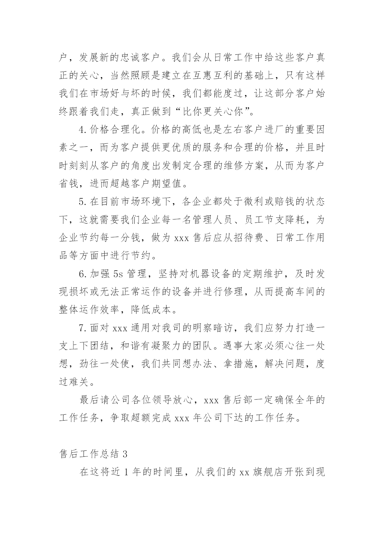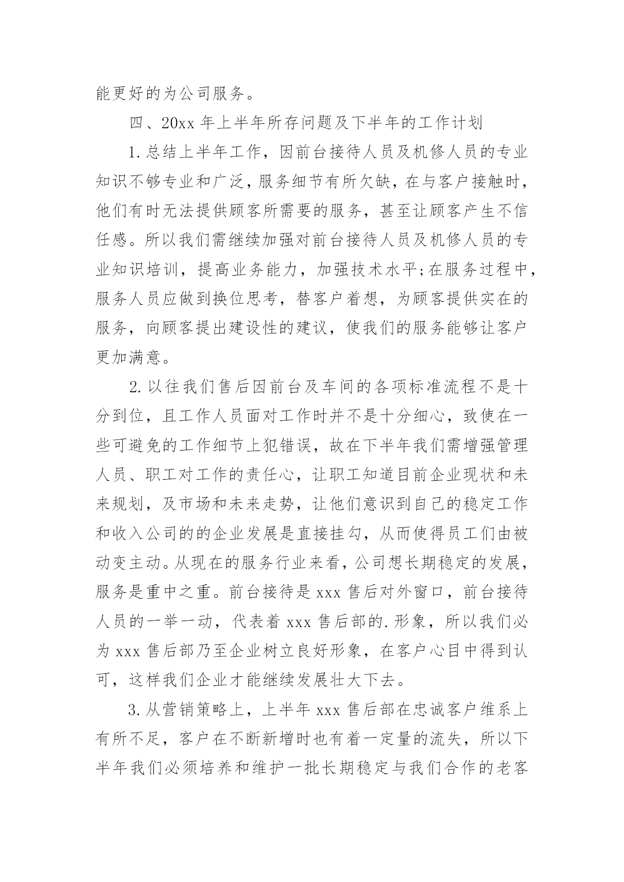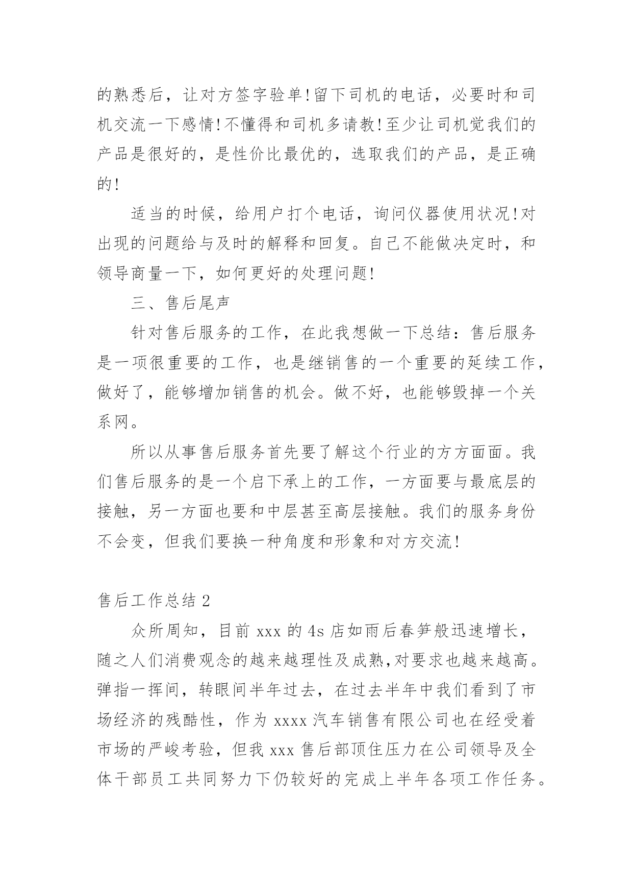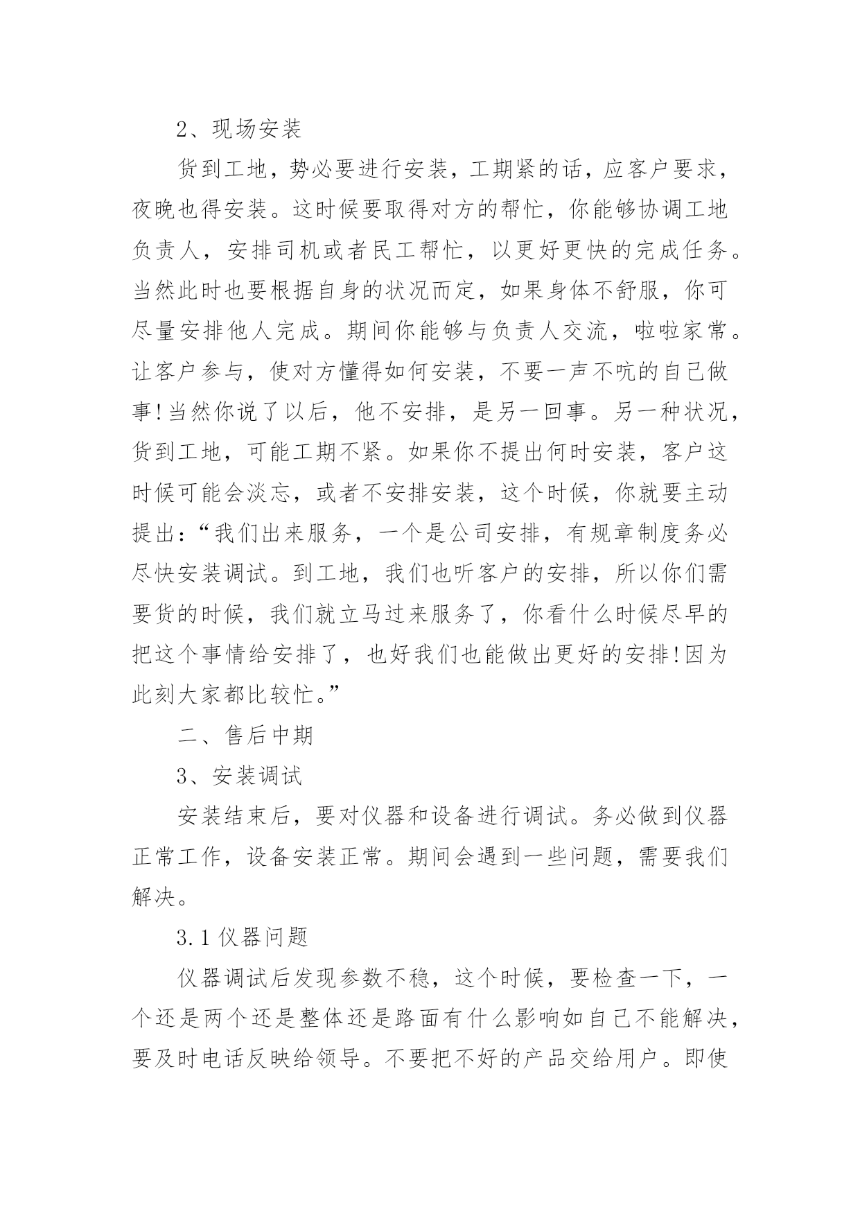 售后工作总结总结是对某一阶段的工作、学习或思想中的经验或情况进行分析研究的书面材料,它可以提升我们发现问题的能力,让我们抽出时间写写总结吧。总结怎么写才不会流于形式呢?以下是小编帮大家整理的售后工作总结,欢迎阅读,希望大家能够喜欢。售后工作总结1成为XX电器公司的售后服务的技术人员,以来,我努力工作,完成了全年任何。此刻对一年来的工作总结如下:1、学好本专业的技术。无论从事什么样的工作,专业技术永远是立足之本。作为售后技术这一块虽说不必须要求的技术要跟研发人员的那么高,但是最基本的也要明白。起码客户问起来你能够立马回答得出并帮忙他们很好的解决问题。一开始我老是说工资怎样那么低,但是此刻想起来也就释然了,就算是有一万块的月薪放在那里,你拿什么来换。出来之前还满怀信心的,但是接触几次之后就发现自己太稚嫩了,有时很想回去,但是想想又不甘心,我不能灰溜溜的回去要有所得才行。所以很感悟,学好技术是重中之重,先立足,在讲发展,可持续发展。打扎实基建,才能建得起高楼大夏。但是,这些工控自动化产品的技术要想学好也不是那么的容易,很枯燥,涉及的很广泛,还务必有一个对技术有欲望的心。个性是售后技术这块,不只是只明白本产品的,还要了解它所应用在什么方面,是什么机械,带动它的是什么系统等等。这些不可能一天能够学的会的,要想大概的明白,务必要穿越一些不为人知的黑暗,去学习、去工作、去摸索、去思考。我相信在这领域里的人才想必也是经历一些不为人知的黑暗才有这天的成就的吧。所以我什么都不是,我就是一草根,需要从新学习。2、学会与人沟通。做我们这样貌的工作,和人打交道是必不可少的事,有个良好的沟通潜力可能会让你事半工倍。还有就是每次出差到现场作业时我都要有个心理准备,因为客户的情绪不能确定,毕竟买了我们的产品出了故障对他造成必须的损失,随时会喷你一脸口水,所以抗压潜力也要强。在这个时候只能留意谨慎的应付了,我一般只会说“请你放心,我会尽快帮你解决问题的”。还有出门在外,说话也要留意,尽量的从客户的心理出发,态度要好,绝对不能顶撞人家,人家但是我们的上帝。在与客户沟通时,对你从事的技术要求也是很高,一般在沟通时问的最多的也是技术性的问题;有时碰到一些不懂的技术问题就很纠结。如果是“嗯、啊、哦”的回答的话那就麻烦了。这样的问题最好就不要正面的去回答了,先从自己会的入手,尽量的转移到别的地方去,反正能帮他解决问题就能够了;要不然客户会对你的人产生怀疑的同时,也会对公司的形象造成损失,最要命的是他突然奔出一句来你到底会不会的那样的话自尊心那就大受打击啦。所以在和人家沟通时要么不说在现场赶紧解决故障走人,要么就尽量的往自己明白的扯少跟人家在那里废话。3、事前准备事后总结。在接到客户电话时,务必先了解最具体的状况看能否电话解决,如果要到现场去的话,那就去分析这个故障到底是什么原因造成的',然后从分析中明白大概要准备元器件,工具什么的。俗话说“成功是为有准备的人的”。完成任务之后,最好做一下总结,把现场的状况记下来,比如:我们机器所应用在什么机械上,用到了哪些参数,输入输出的电压电流等。最后分析出出故障的原先,这个是对技术的提高比较好的方法,也是公司要求我们做的。还有出差到现场并不没有别人所说的那么完美,一个人的旅途总是那么寂寞孤独;还要忍得住孤寂、耐得住枯燥、拆得了机床、修得了变频器、不怕脏、不怕苦、不怕累。这些都是售后技术人员的基本要求。抗得了就勇敢的抗,抗不了就放一旁;毕竟背后还有一个公司,公司里还有那么多的伙伴支持着呢!都说售后服务是一个营销的过程,也是再营销的开始,我想我会努力的去维护好公司的品牌形象为公司争取最大的利益。售后客服个人工作总结售后服务工作作为产品售出后的一种服务,而这种服务关系到公司的产品后续的维护和改善,也是增强与客户之间交流的一个重要平台。售后服务的优劣,直接关系到公司的形象和根本利益。也间接的影响销售的业绩。本人从事售后服务已有几年,对售后服务存在的问题做一下总结:以及如何更好的实现售后服务---〉现场问题(客户反馈)---〉生产管理,安排---〉产品性能和综合力的提高从以下几个方面做一下探讨:一、售后初期1、发货:当我们的产品卖出时,势必会派人员到现场进行安装服务,而这种看似简单的工作,却有着其重要性。根据客户的需求,我们一般提前发货至工地,这时也有人员随货同往,当服务人员随货同往时,务必确认联系人和联系方式,要提前半天与客户联系,商量如何接货,以做好提前安排。以确保在这期间客户做好时间调整,因为时间对大家来说,都很宝贵,而且中途也可能出现其他的安排。所以与客户交流时,可把时间说的退后一点,比如下午能到的话,你能够说:“不出意外,正常晚上之前能够赶到。”“具体时间我会尽早联系你!”“我对那里的状况不熟悉,您看能否接我一下”如果对方也很忙
